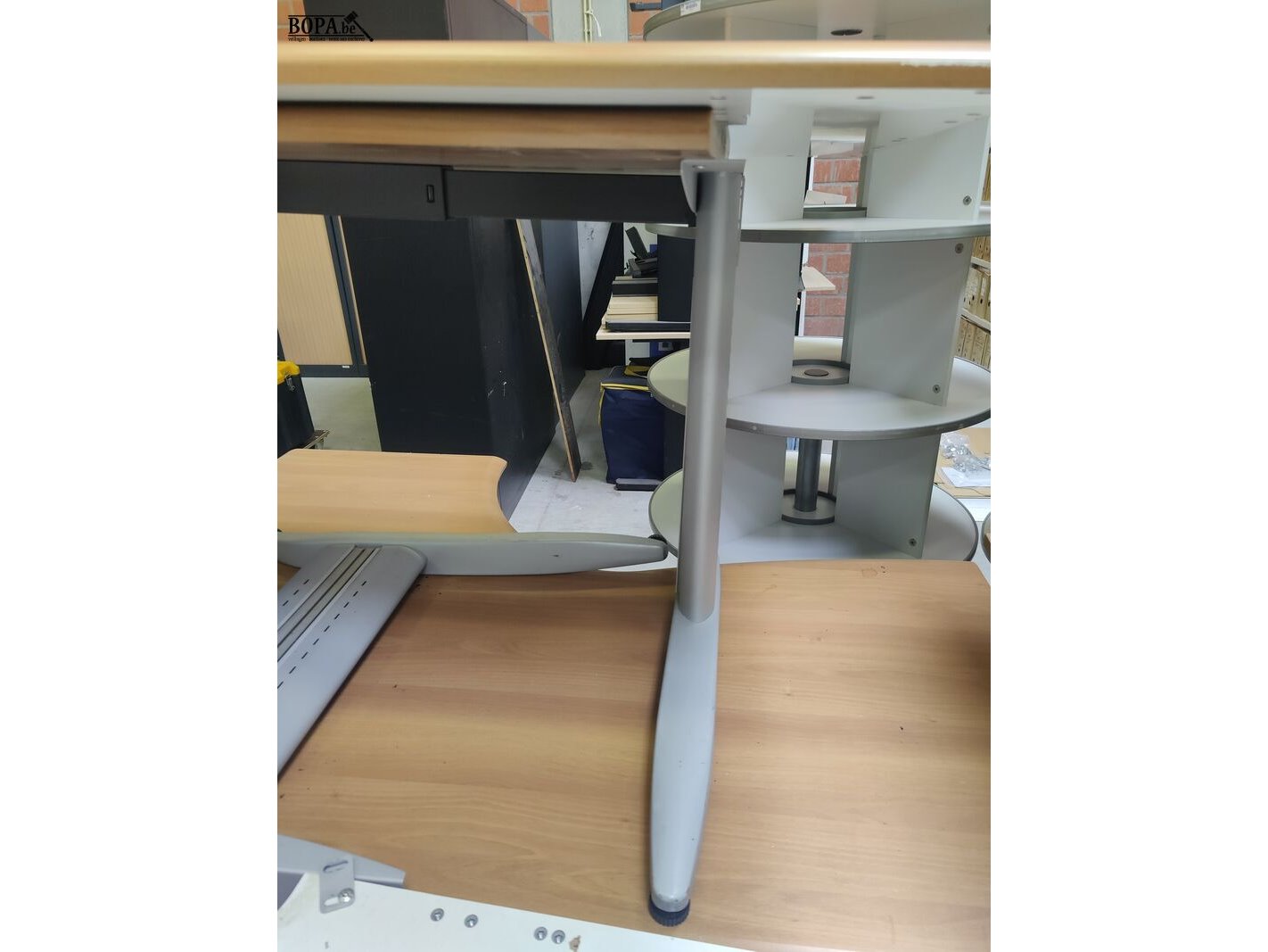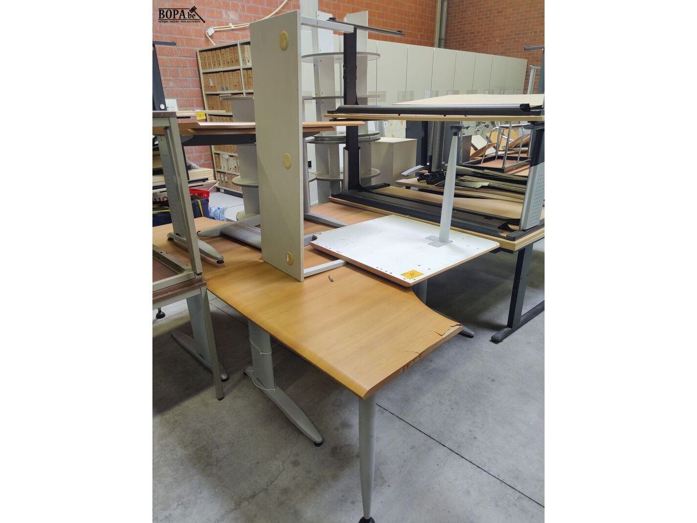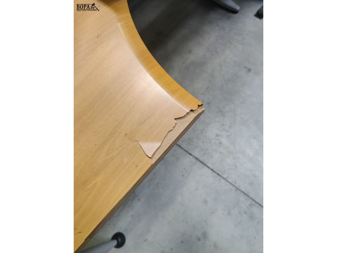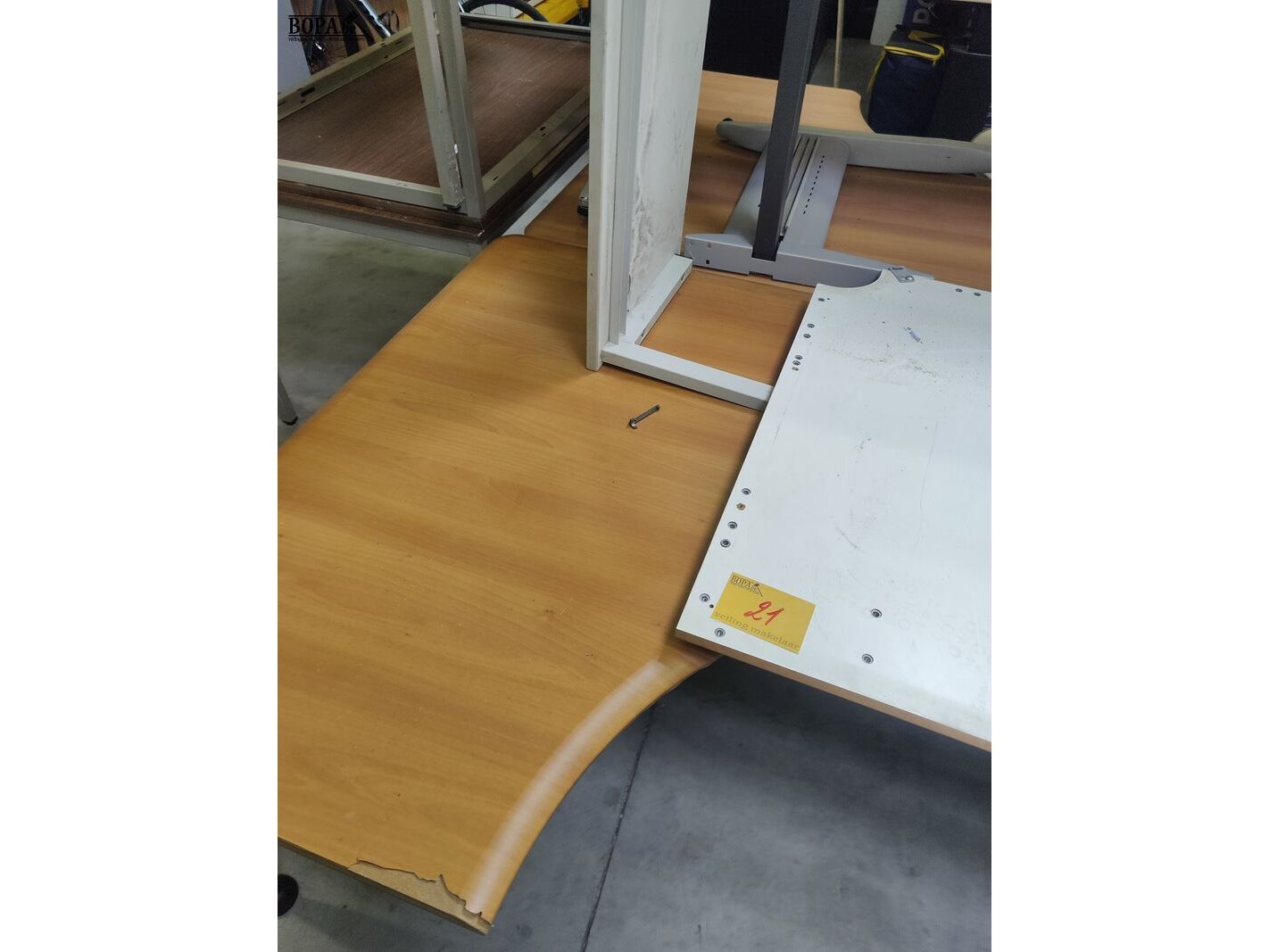 2 burelen met beschadigd houtlook bovenblad, 160 x 120 cm + aanbouw tafeltje