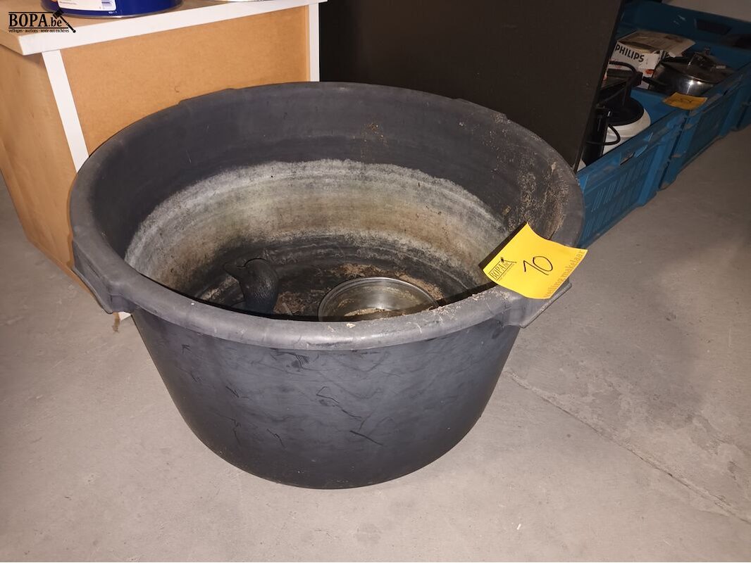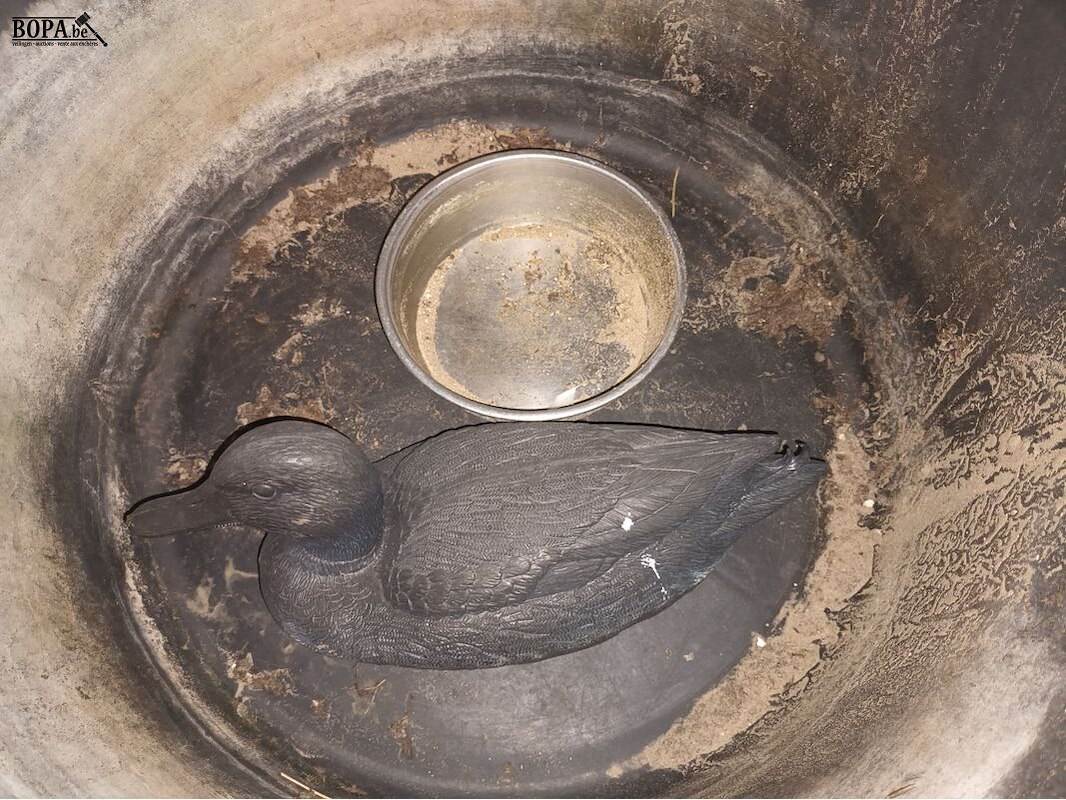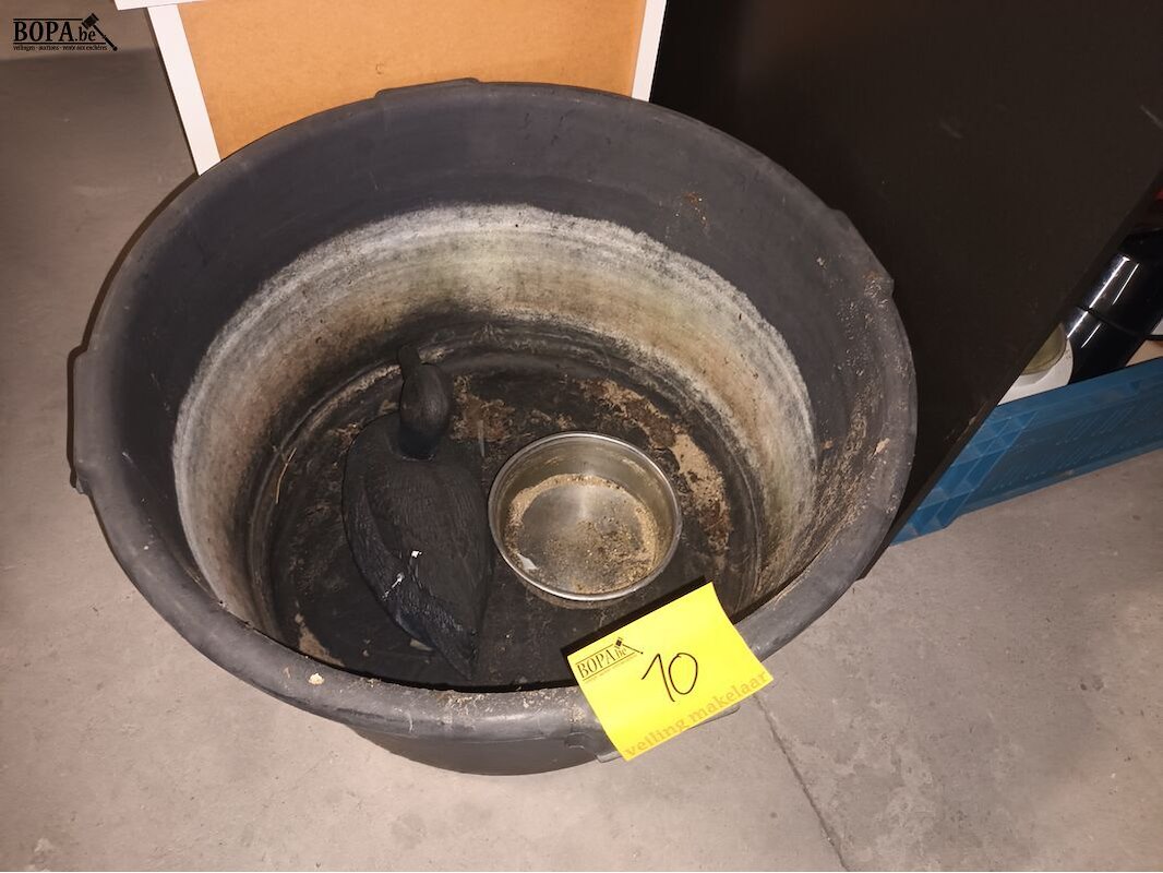 Plastieken kuip (diameter 65 cm, hoogte 36 cm), een lokeend en een drinkbakje.