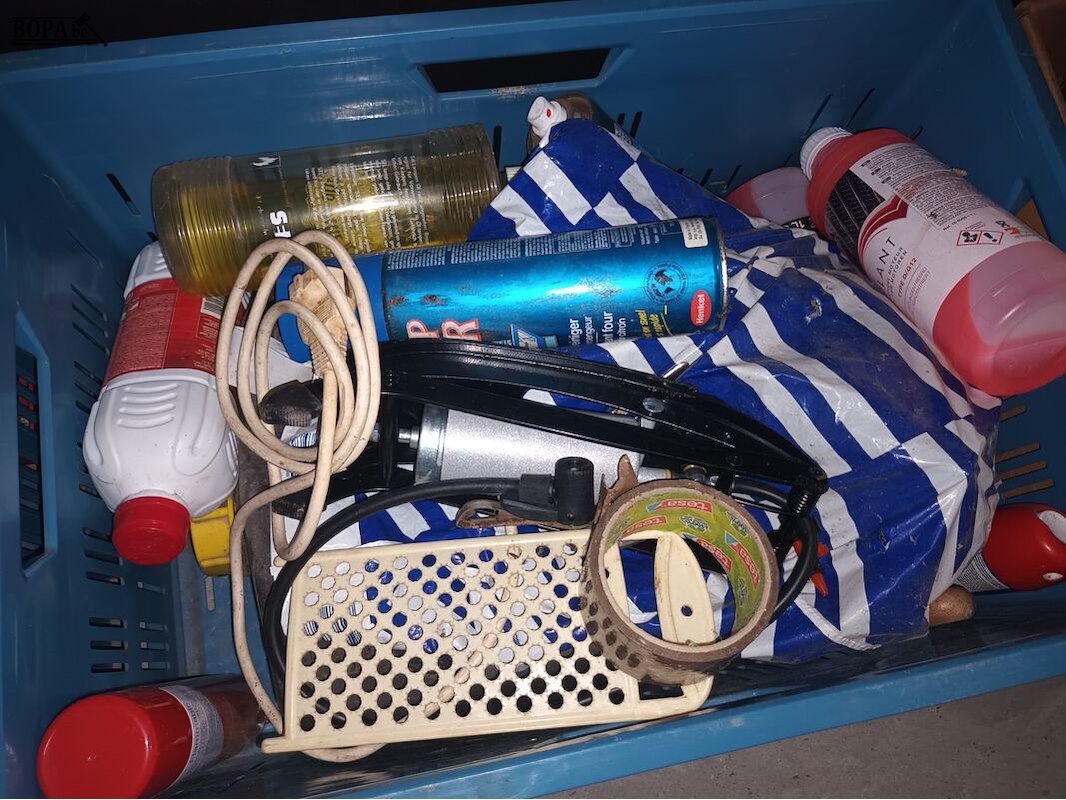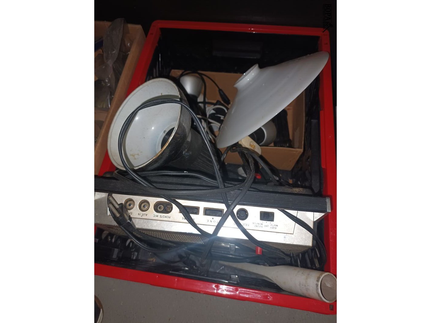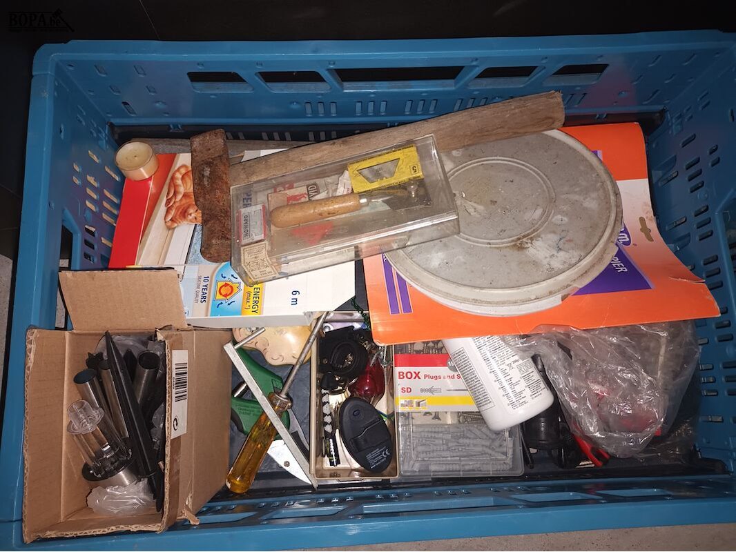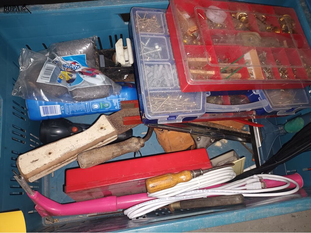 Lot werkmateriaal en elektro. 5 bakken. Bakken niet inbegrepen.
