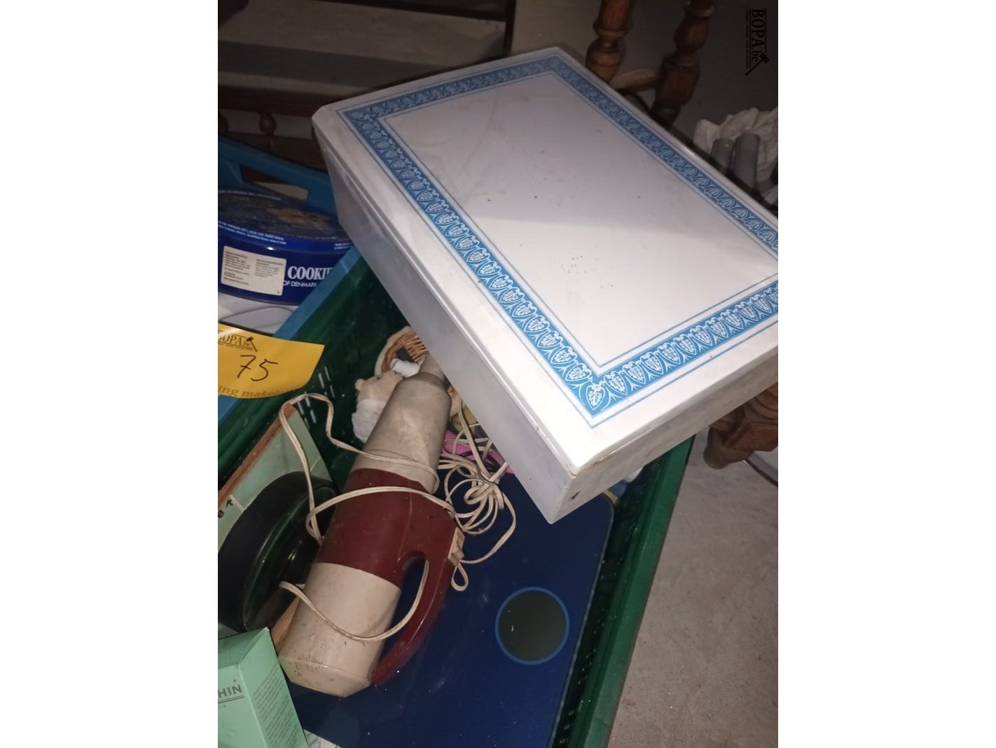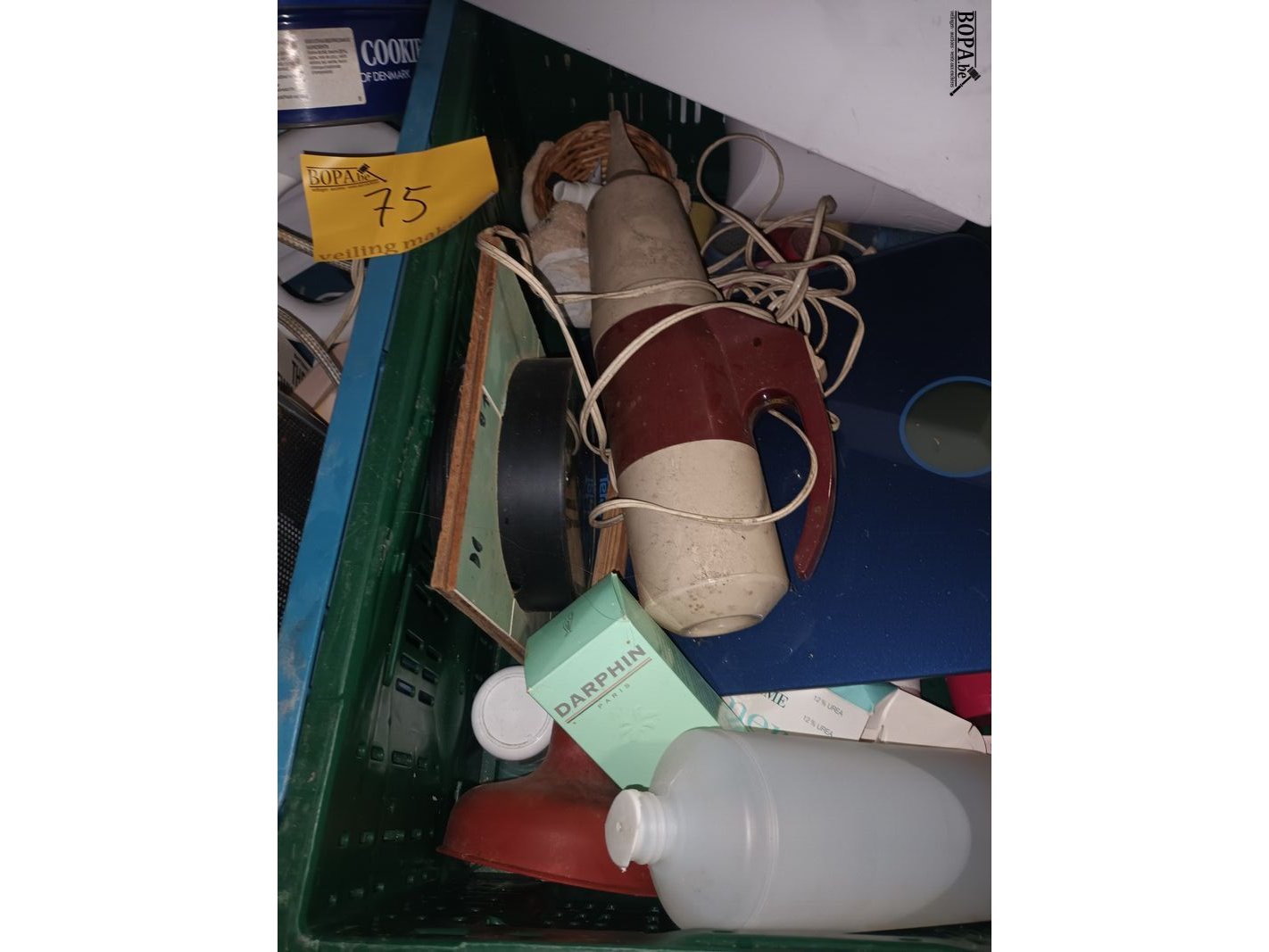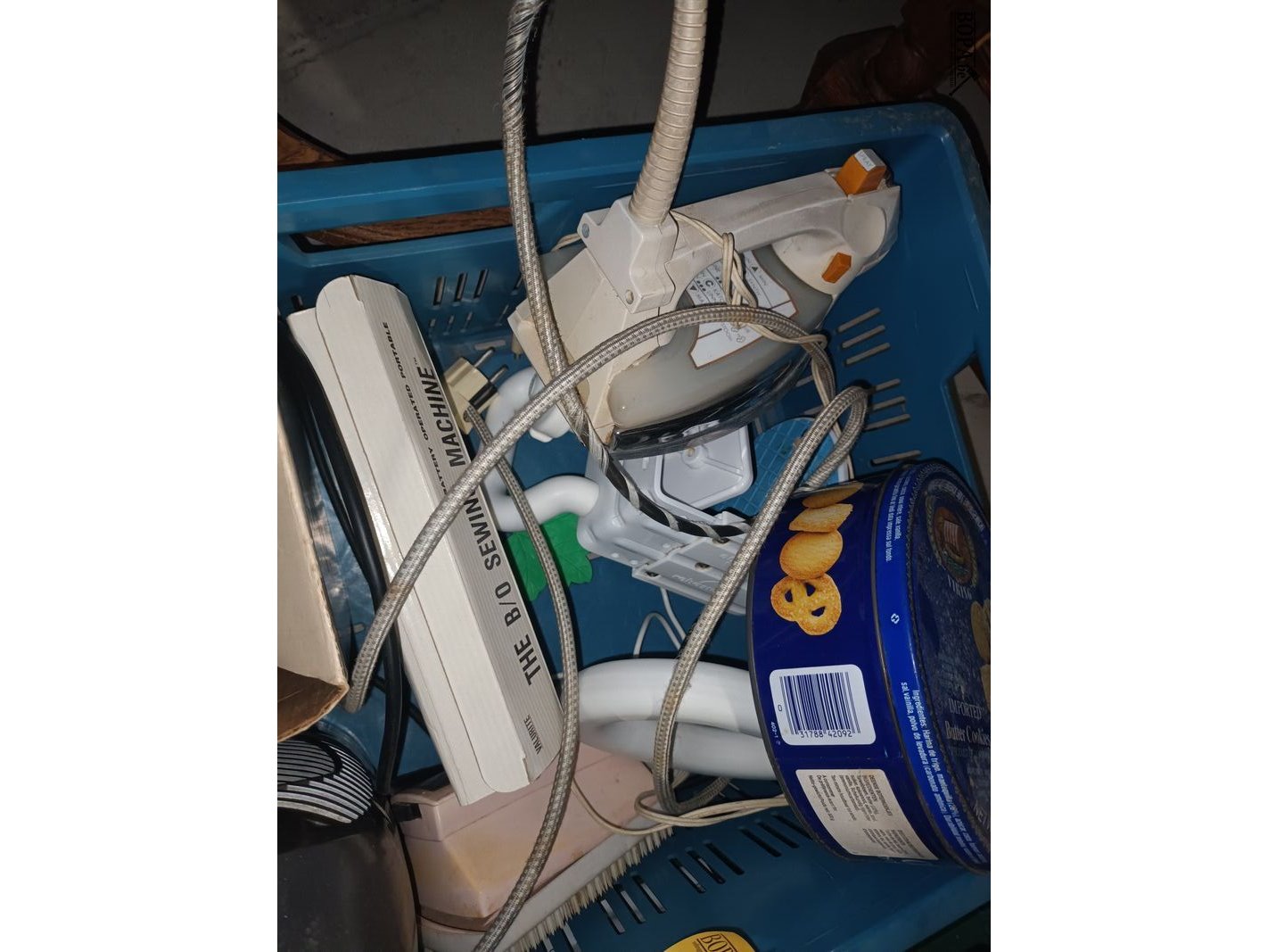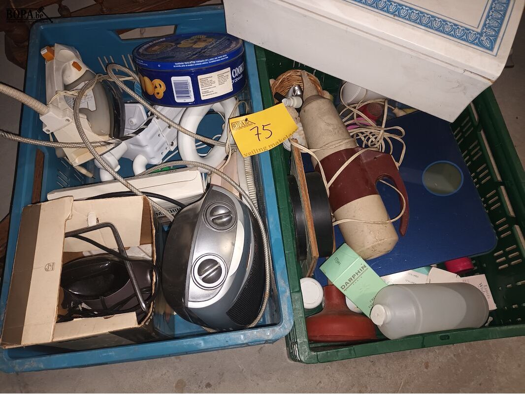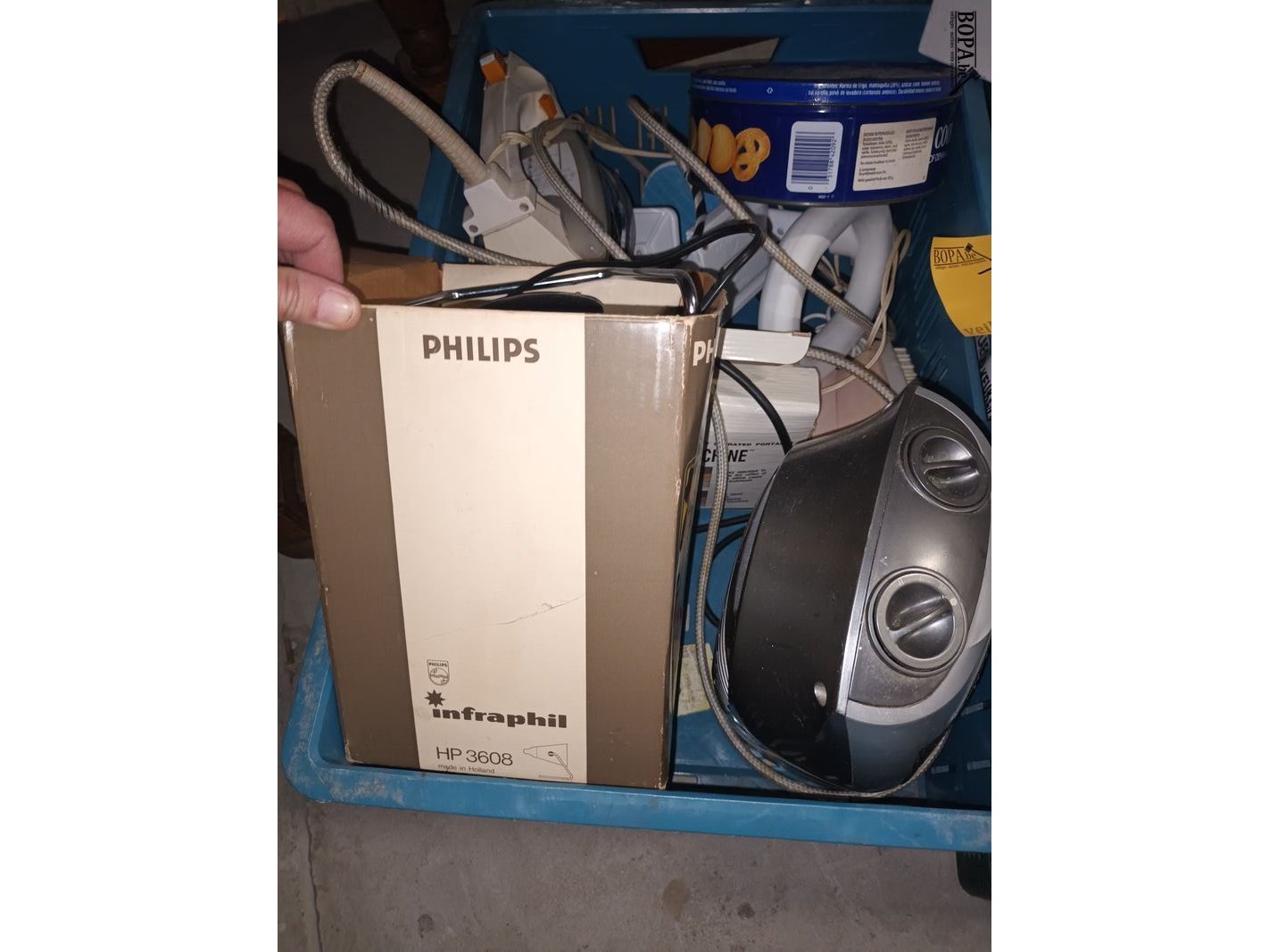 2 bakken met diversen zoals strijkijzer, verwarmingstoestel, badkamerkastje, Philips lamp, etc.