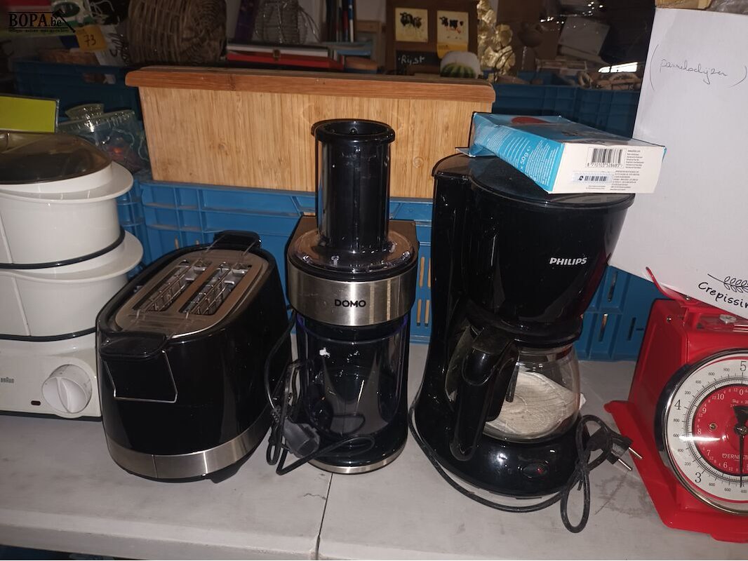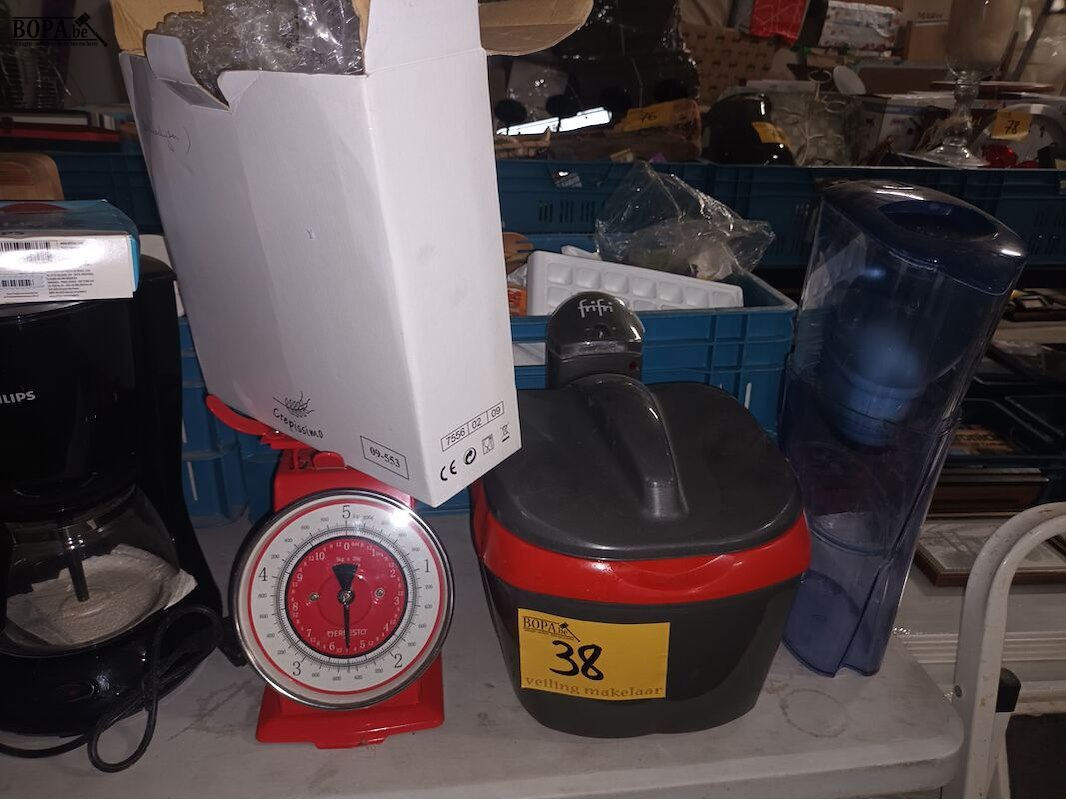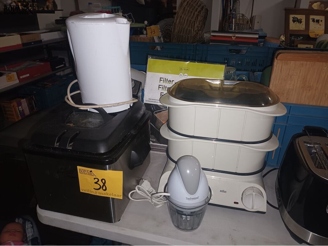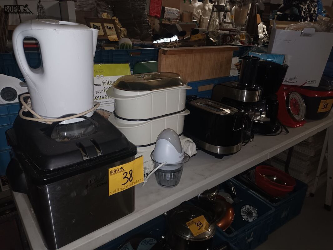 Keukentoestellen. 11 stuks zoals 2 friteuses, waterkoker, stomer, weegschaal, broodrooster, koffiezetapparaat, etc.