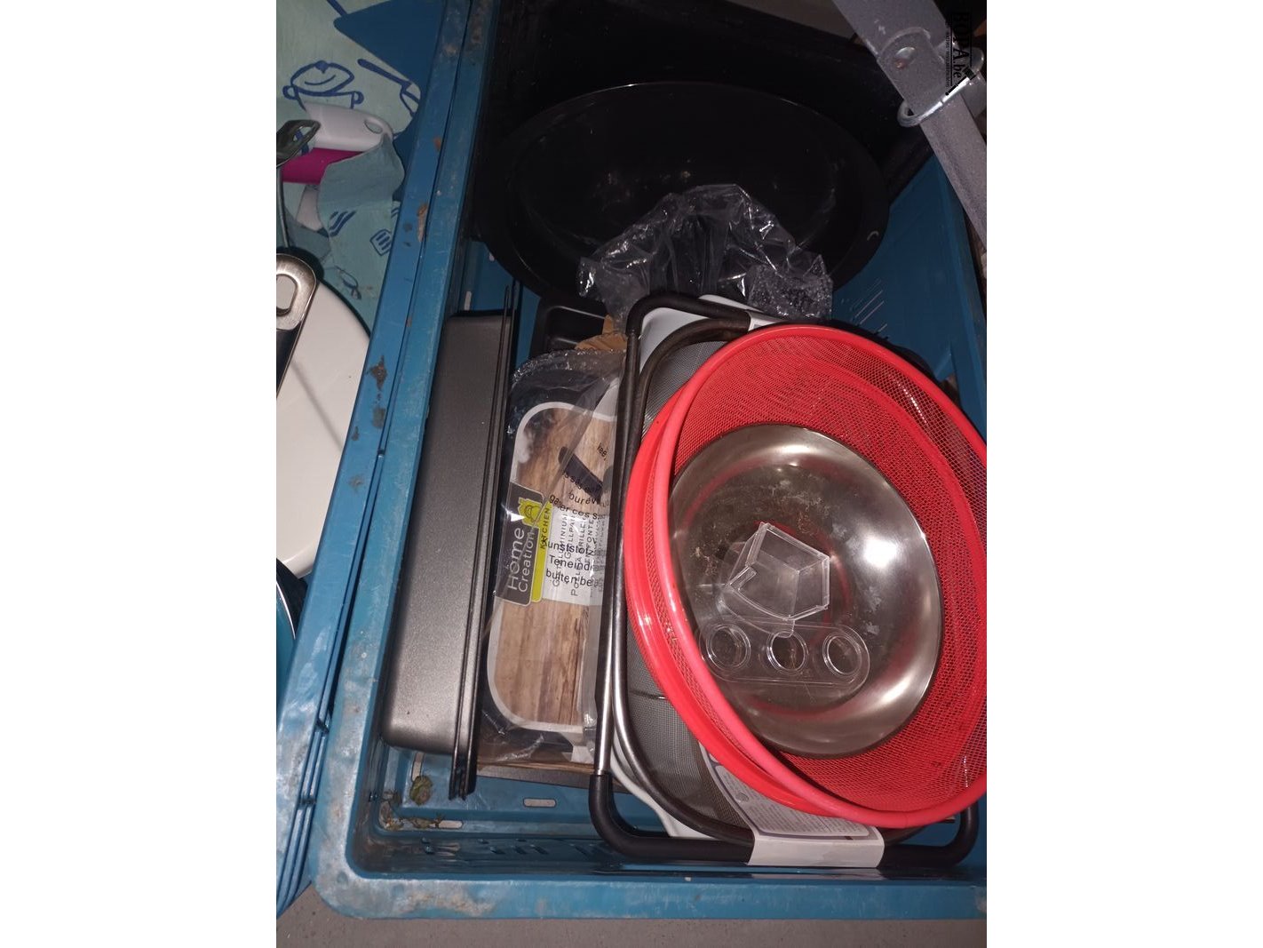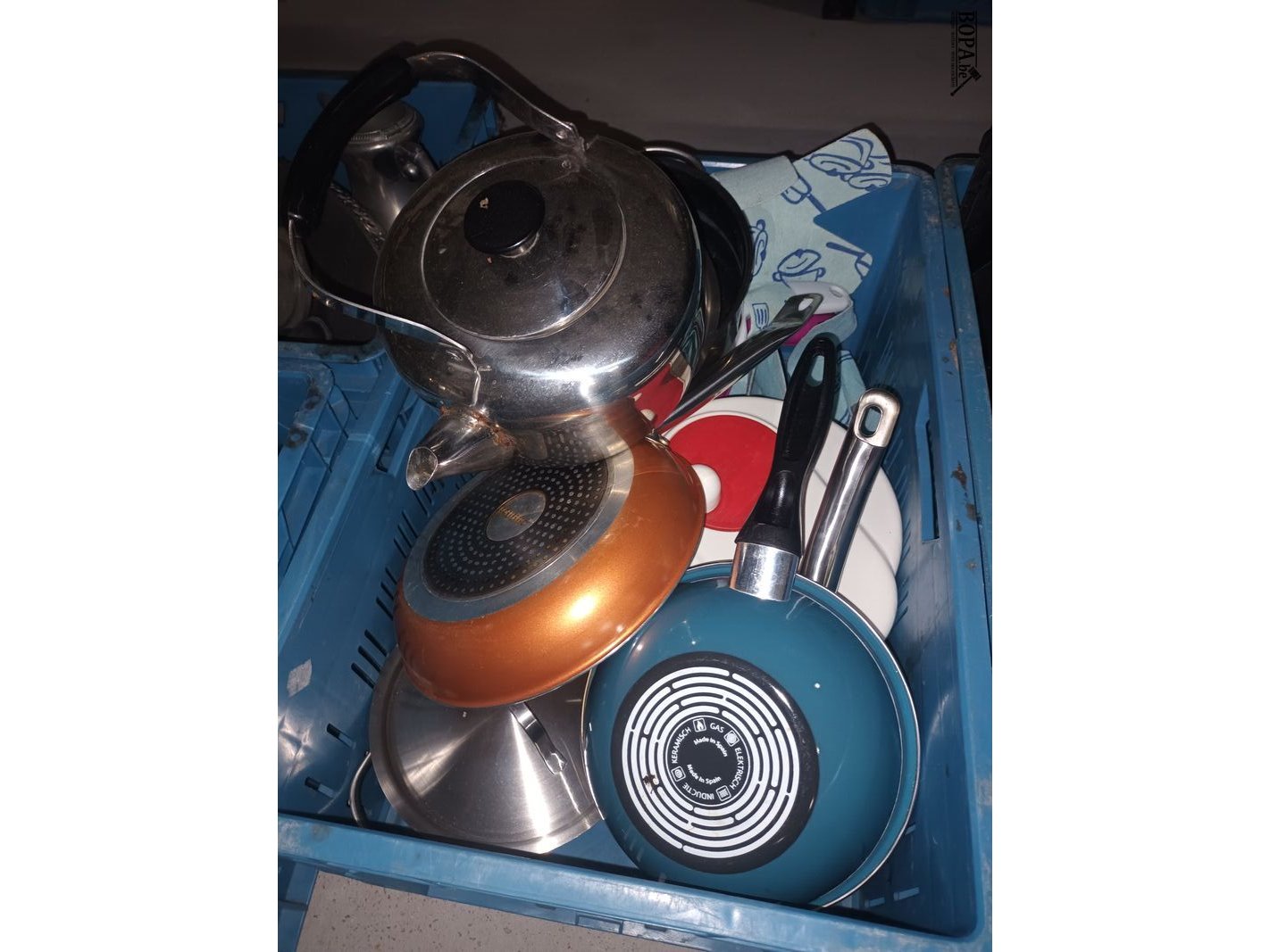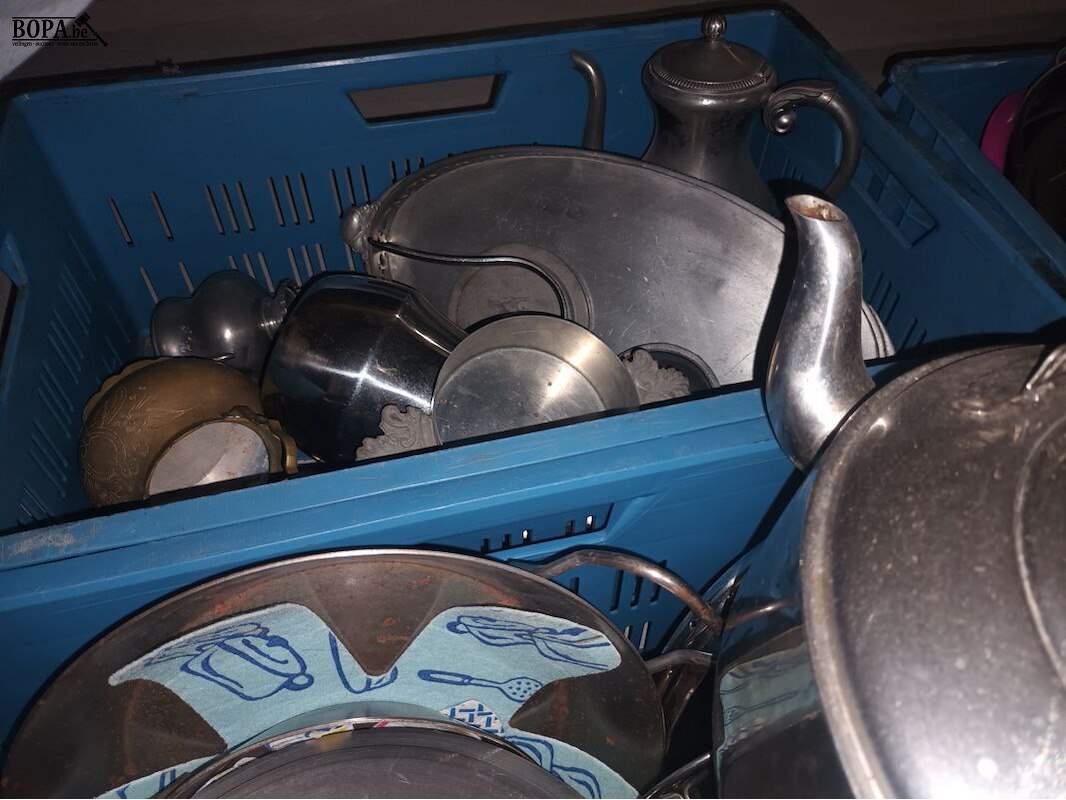 4 bakken met kookpotten, pannen en keukengerei. Bakken niet inbegrepen.