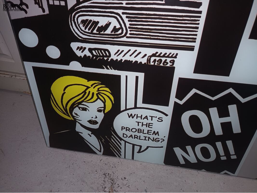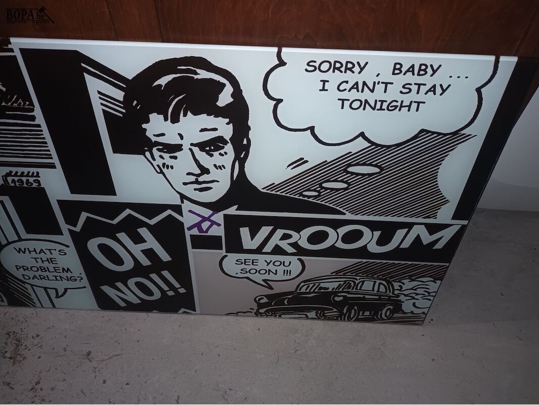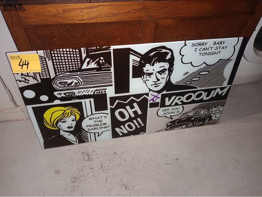 Glazen tafelblad met pop-art thema. 105 x 55 cm.
