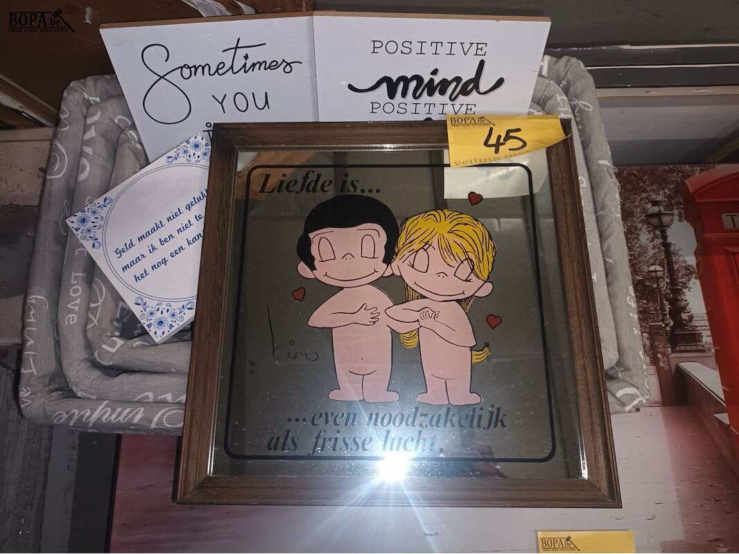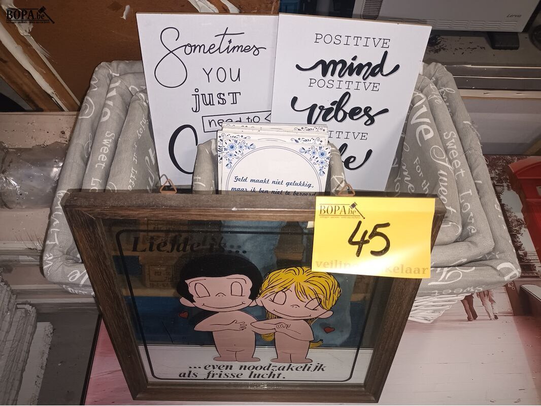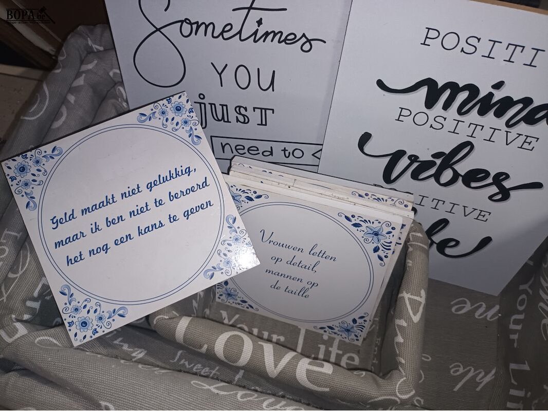 Set van 3 mandjes, 1 spiegel en 6 bordjes met spreuken.