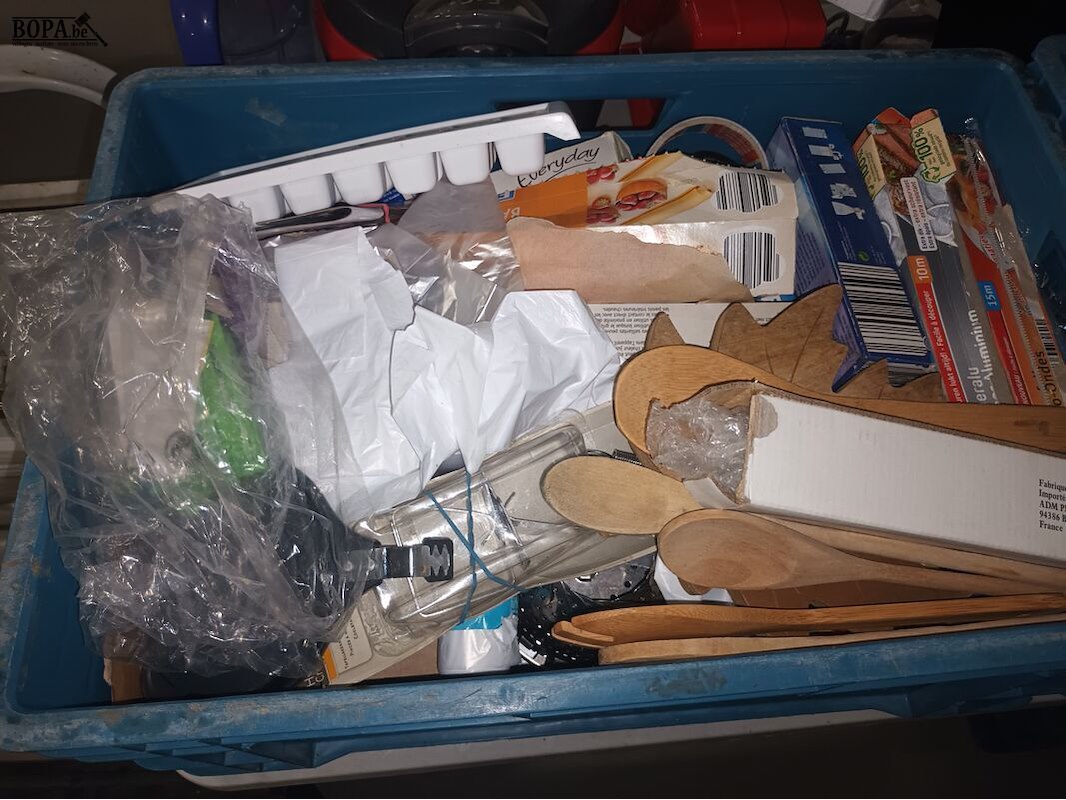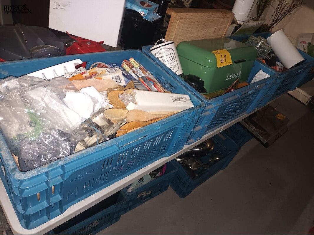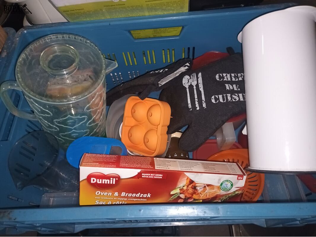 3 bakken met keukengerei. Bakken niet inbegrepen.