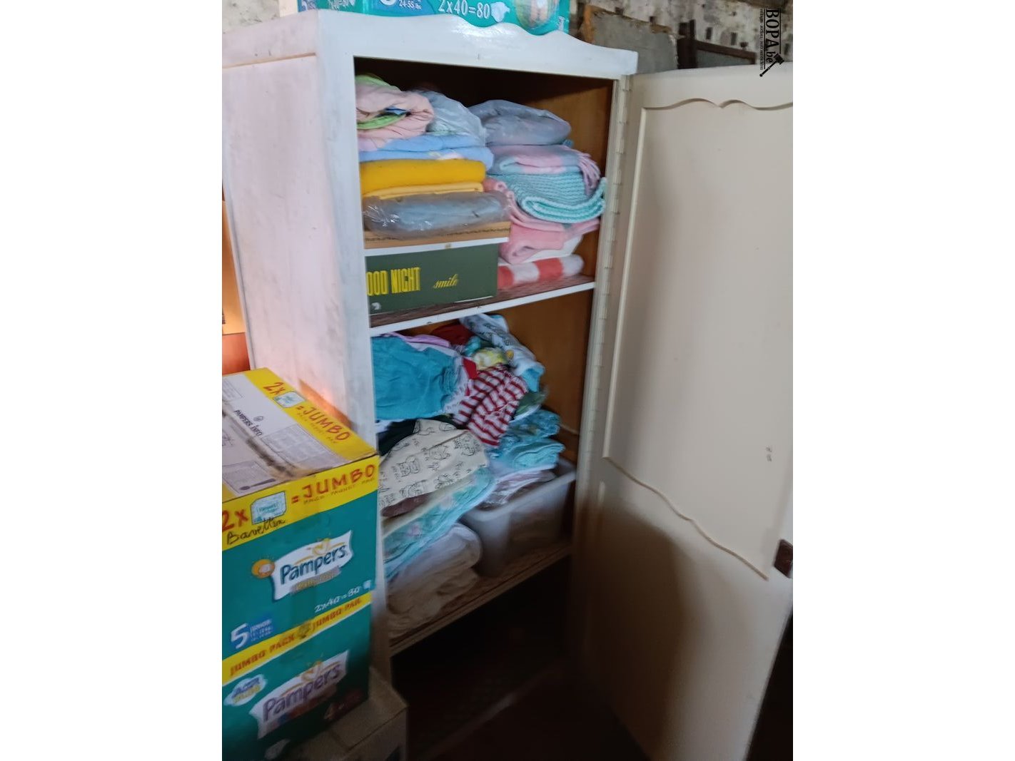 Kast met divers linnen. 60 x 50 x 175 cm.