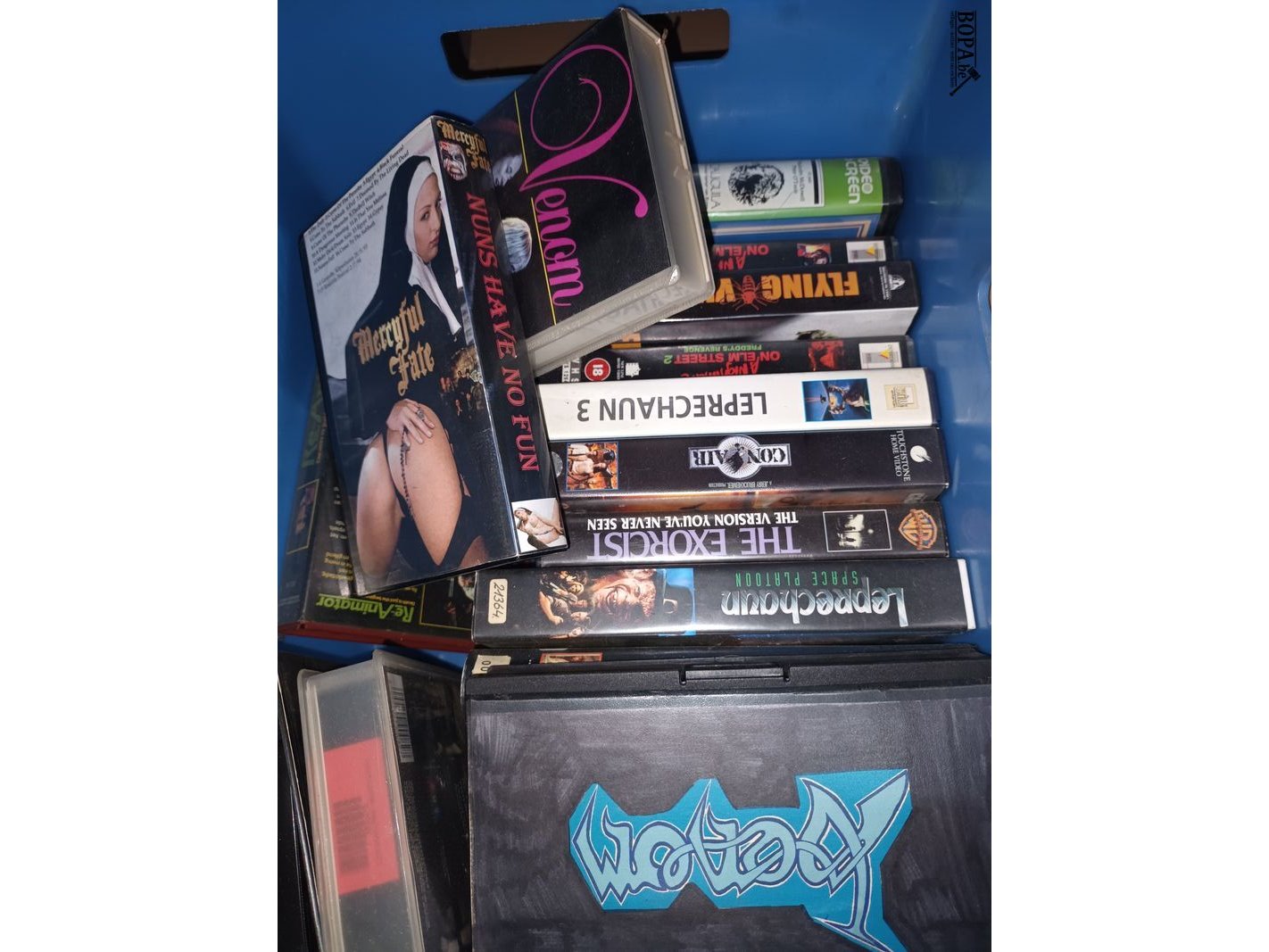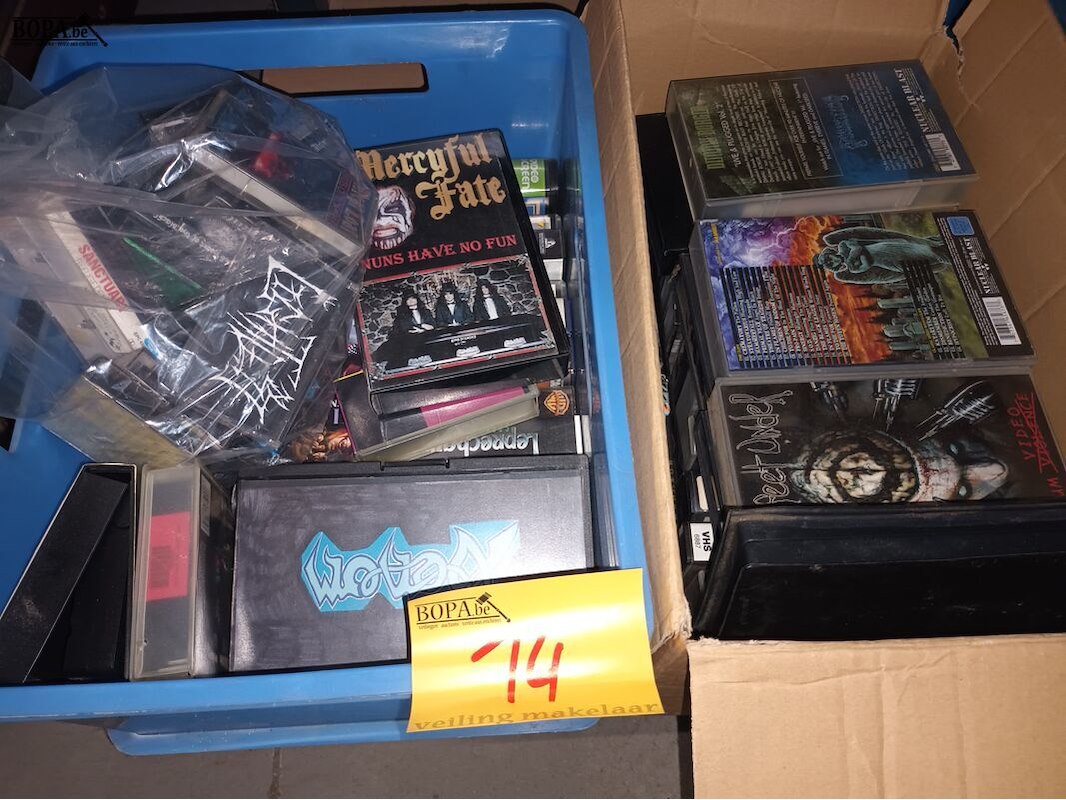 1 bak en 1 doos met audio en video cassettes. Bak niet inbegrepen.