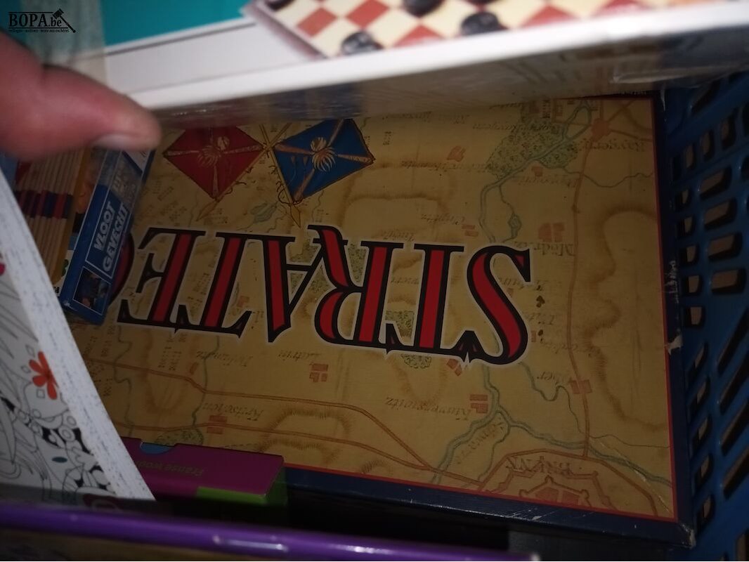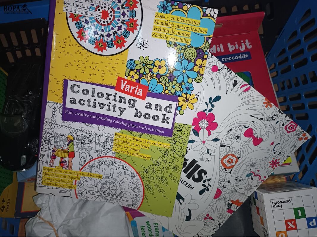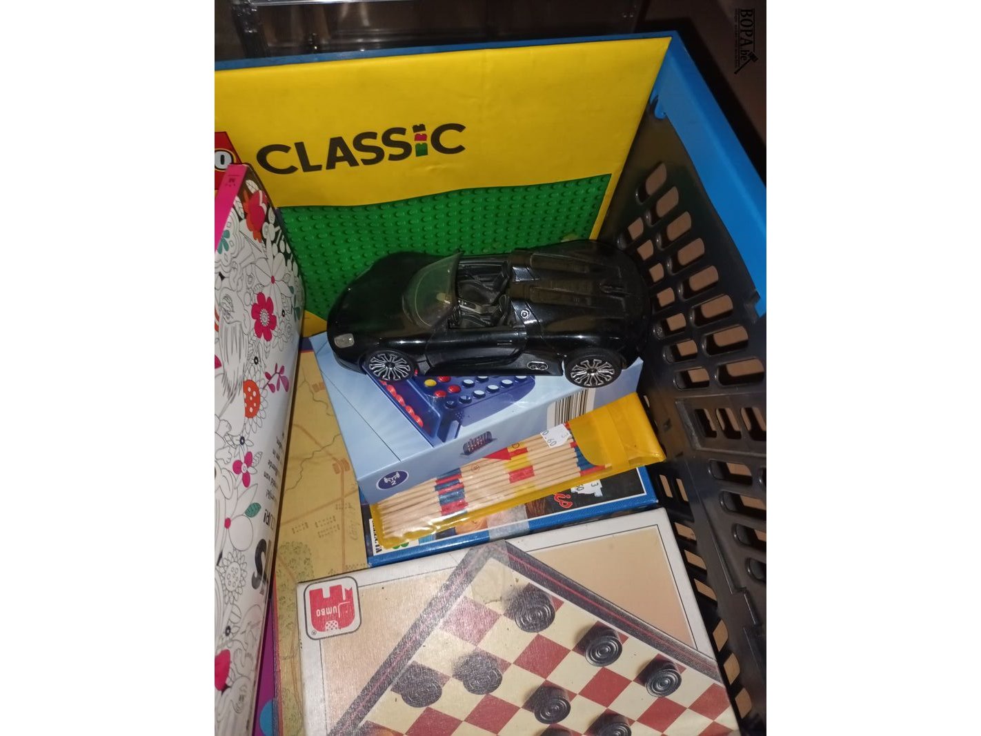1 bak met speelgoed. Auto’s, kleurboeken, Stratego spel, dambord, spaarpot, mikado, 4 op een rij, etc.