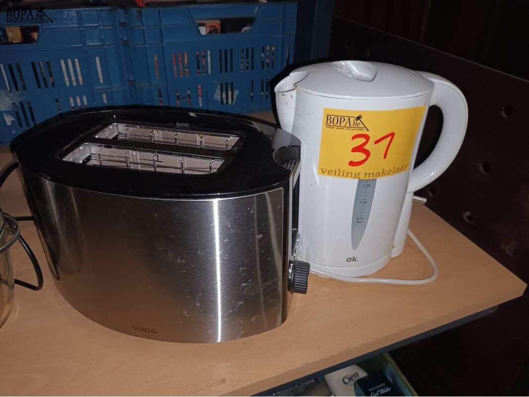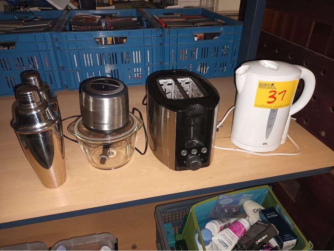 Keukengerei. 5 stuks. 2 cocktail shakers, 1 haktoestel SilverCrest, 1 Quigg broodrooster en 1 waterkoker OK.