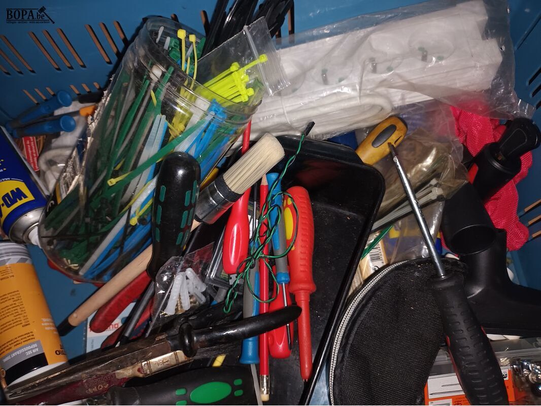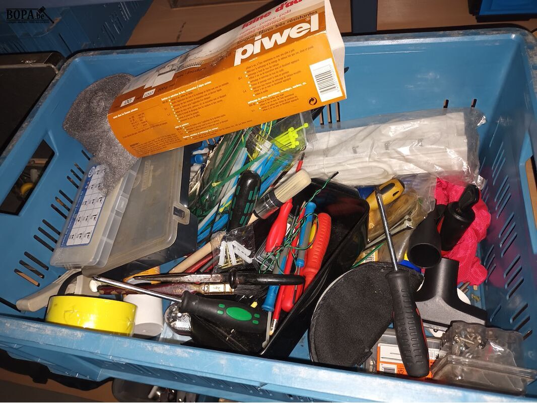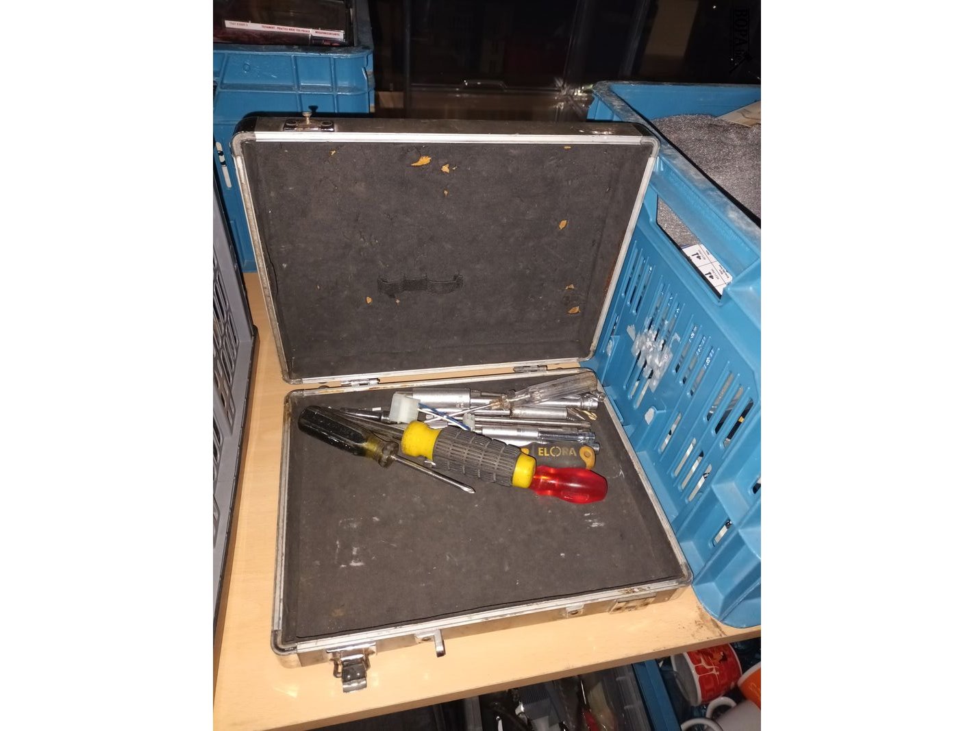1 koffertje en 1 bak met divers gereedschap. Bak niet inbegrepen.