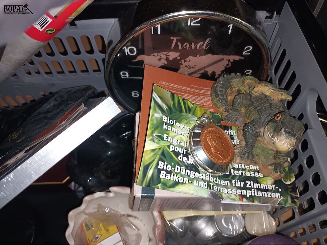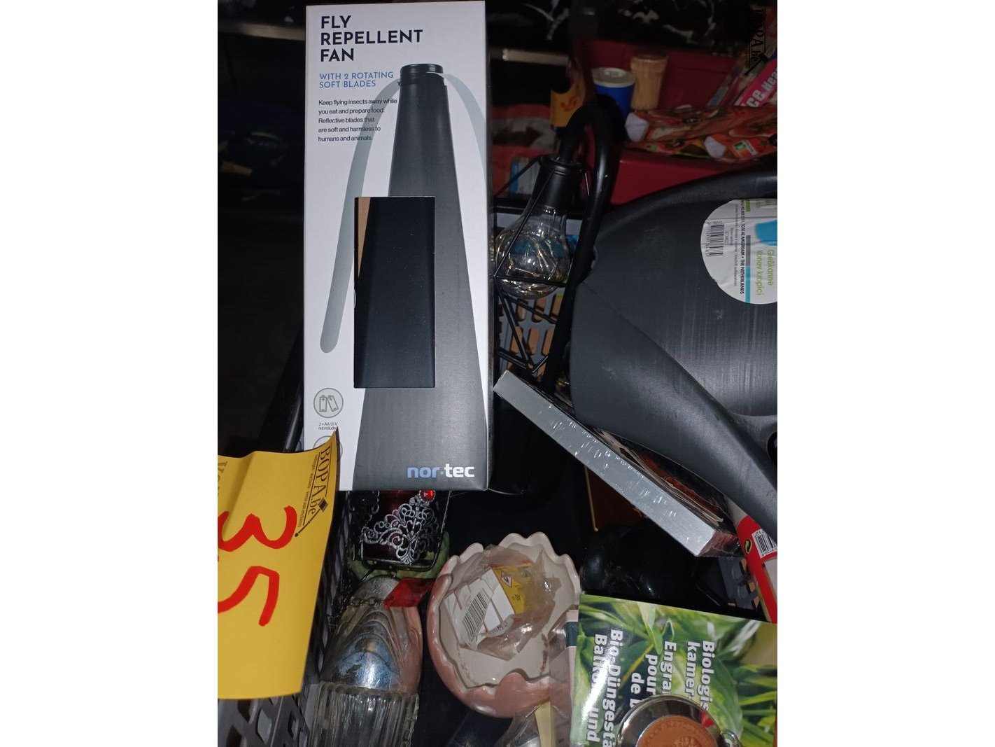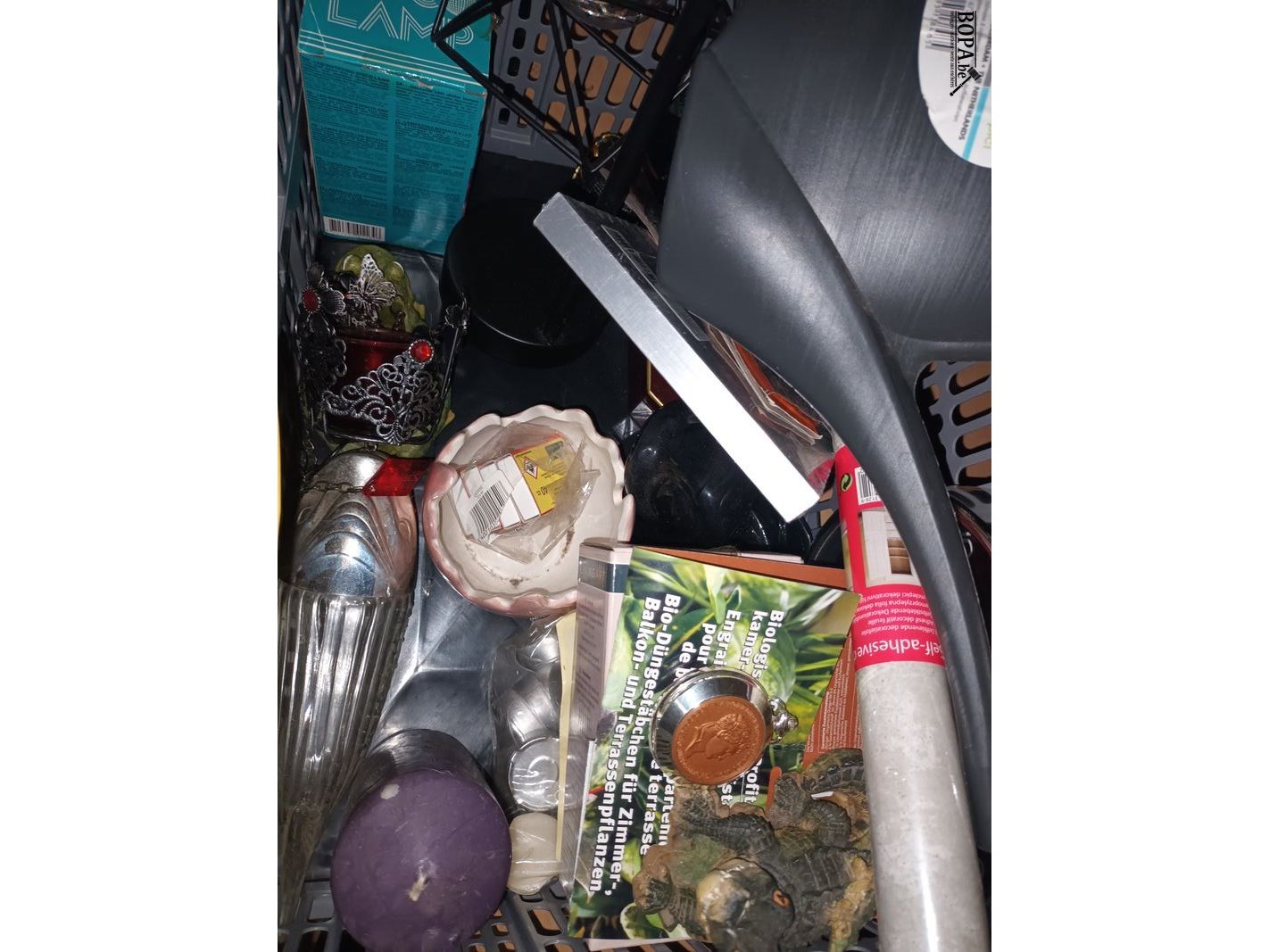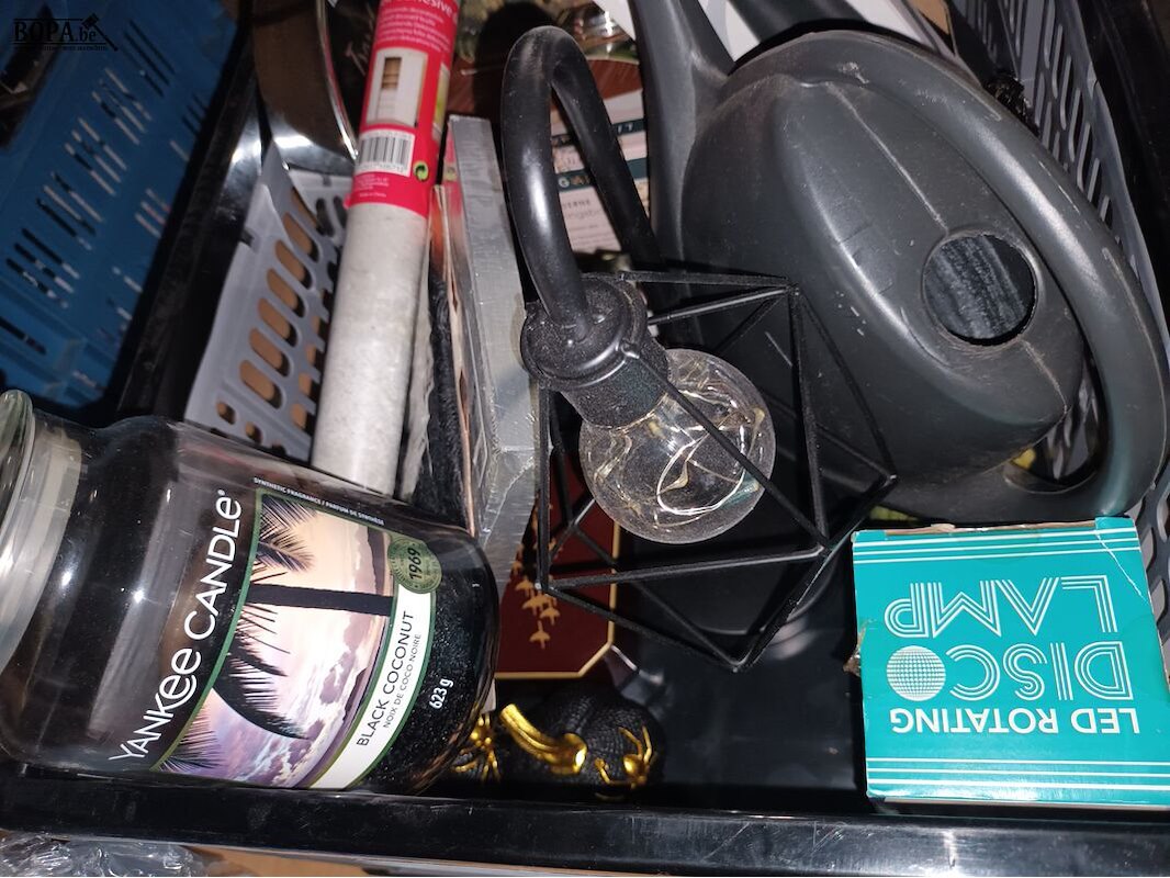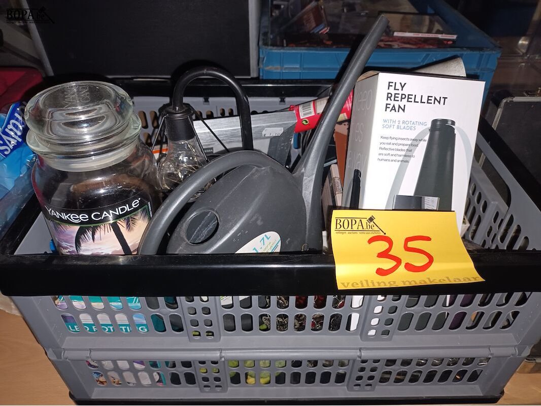 1 bak met diversen zoals een gieter, verlichting, vliegen fan, decoratie, kaarsen, etc.