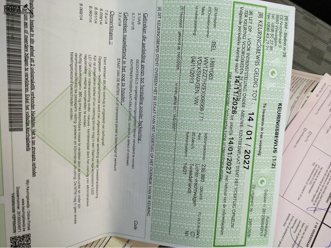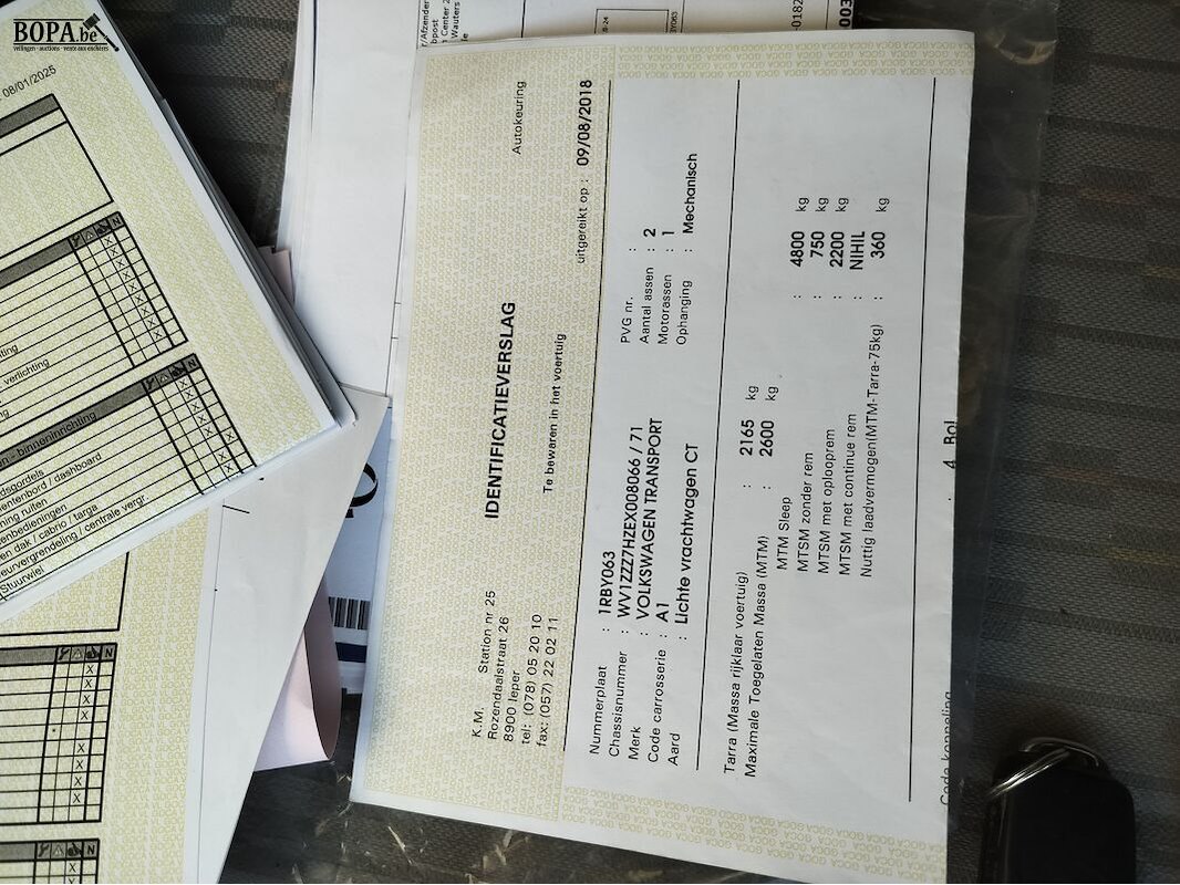 Merk VOLKSWAGEN, VW Model Transporter Datum eerste inschrijving 4/11/2013 KM stand 237950 KM Chassisnummer WV1ZZZ7HZEX008066 Brandstof Diesel Kleur Wit Motorinhoud 1968 cm³ Motorvermogen 75 KW Milieuklasse 5 Euro Schakeling Manueel - 5 versnellingen Aantal sleutels 2 Inschrijvingsbewijs Met aanvraag tot inschrijving voertuig Deel 1 Aanwezig Deel 2 Aanwezig Gelijkvormigheidsattest Aanwezig Keuringsattest Aanwezig Opmerkingen Gezichtsveld / Kentekenplaatverlichting Bijzonderheden / schade / opties Rijdende staat Losliggende bekabeling in laadbak Barst in voorruit Krassen in koetswerk (zie foto's) Dubbele achterdeur Zijdelingse schuifdeur Trekhaak Verlichting in laadbak 3-zitplaatsen Elektrische ramen en buitenspiegels Navigatie Airco Parkeersensoren Stuurbediening