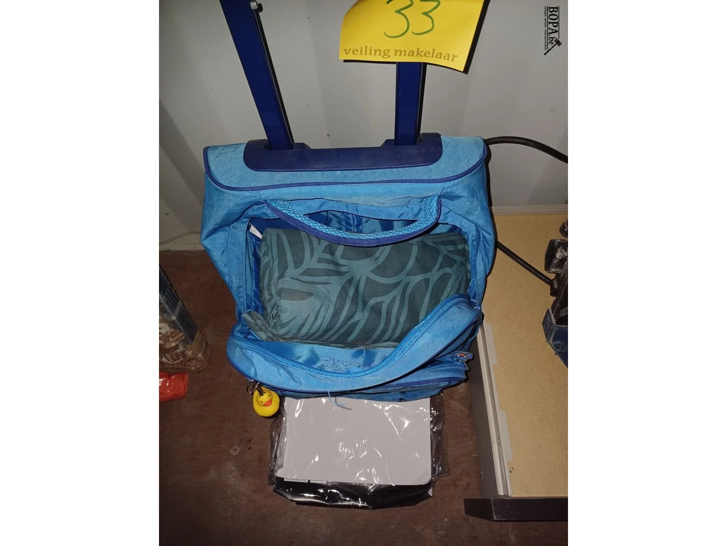 Blauwe kindertrolley en dekbedovertrek