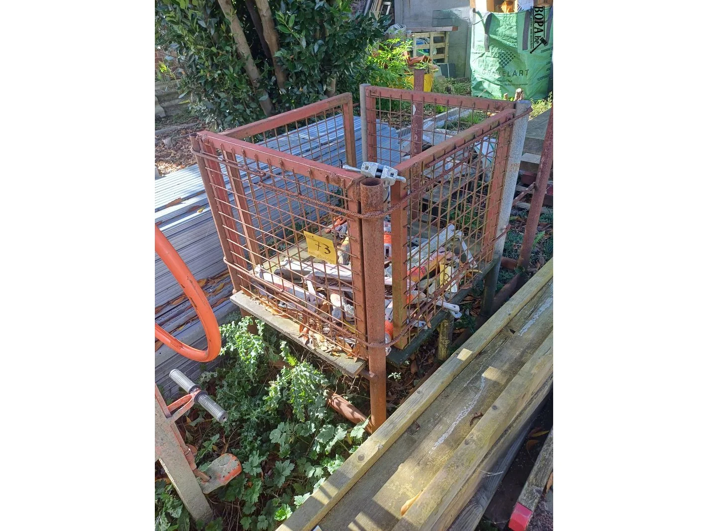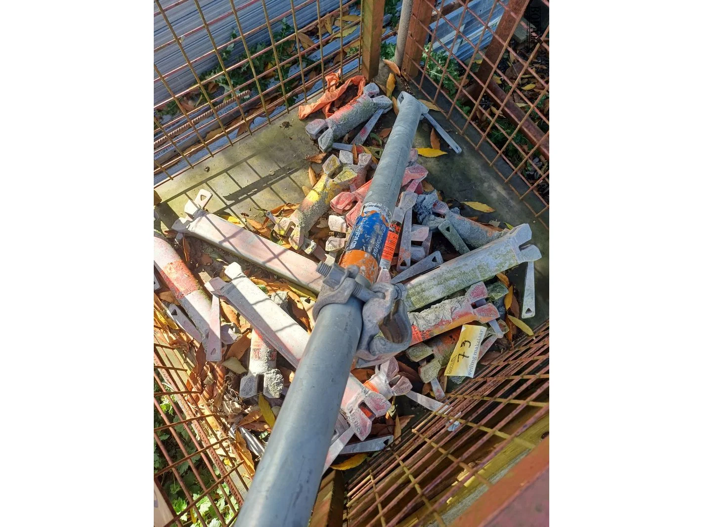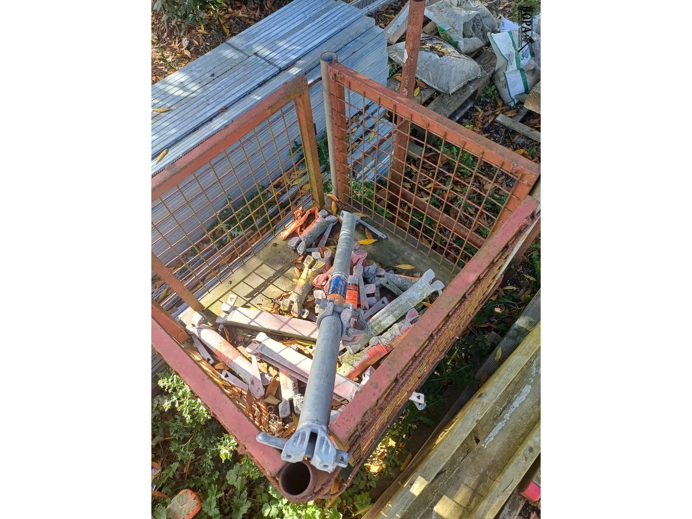 Metalen kooi met restinhoud van stellingenmateriaal