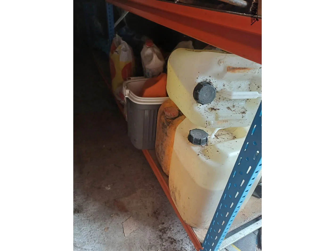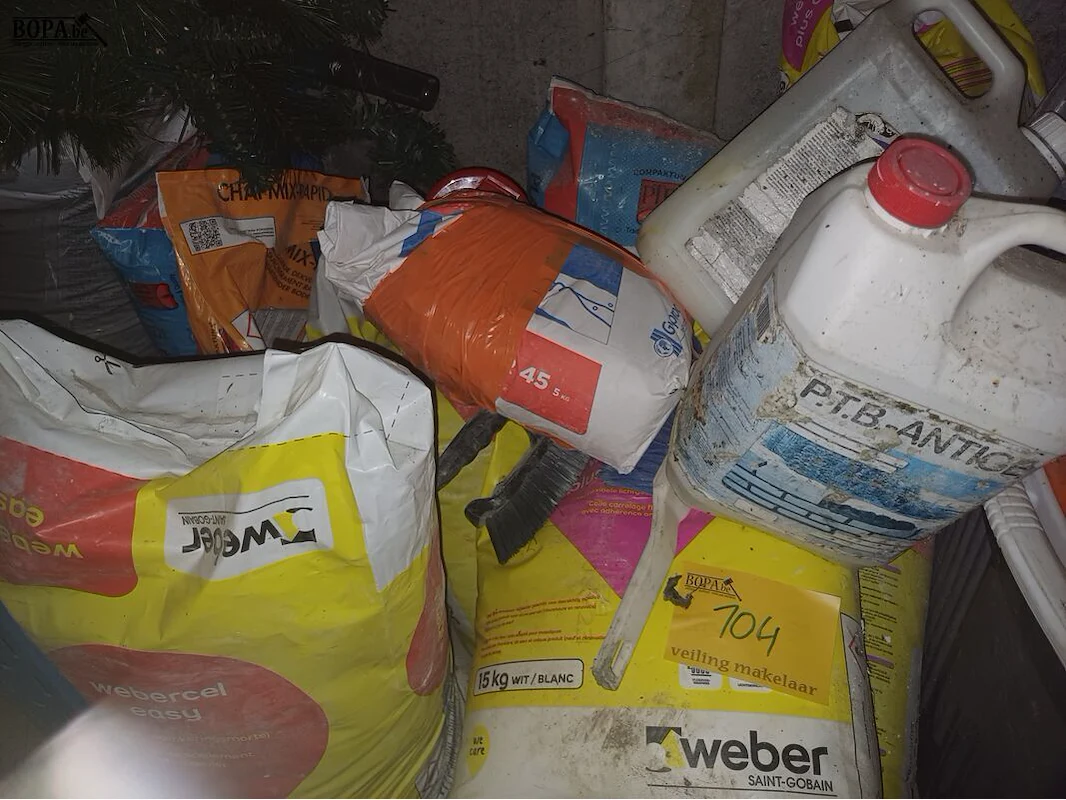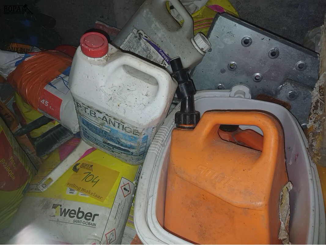 Diverse aangebroken liquide bidons en zakken bouwmaterialen