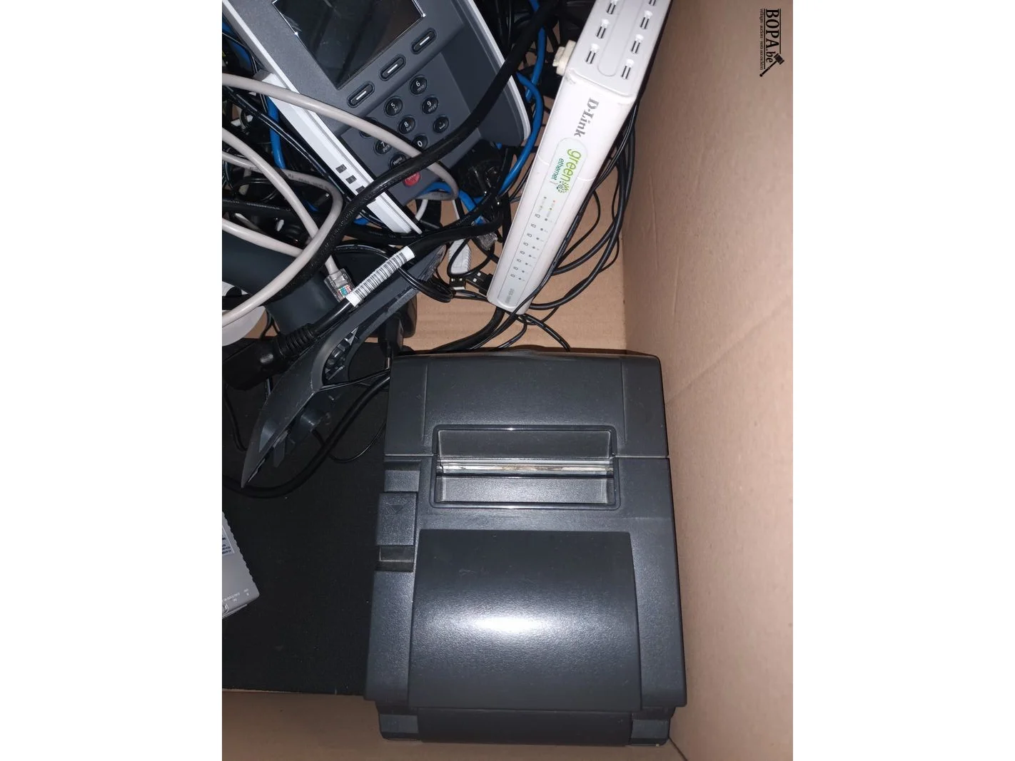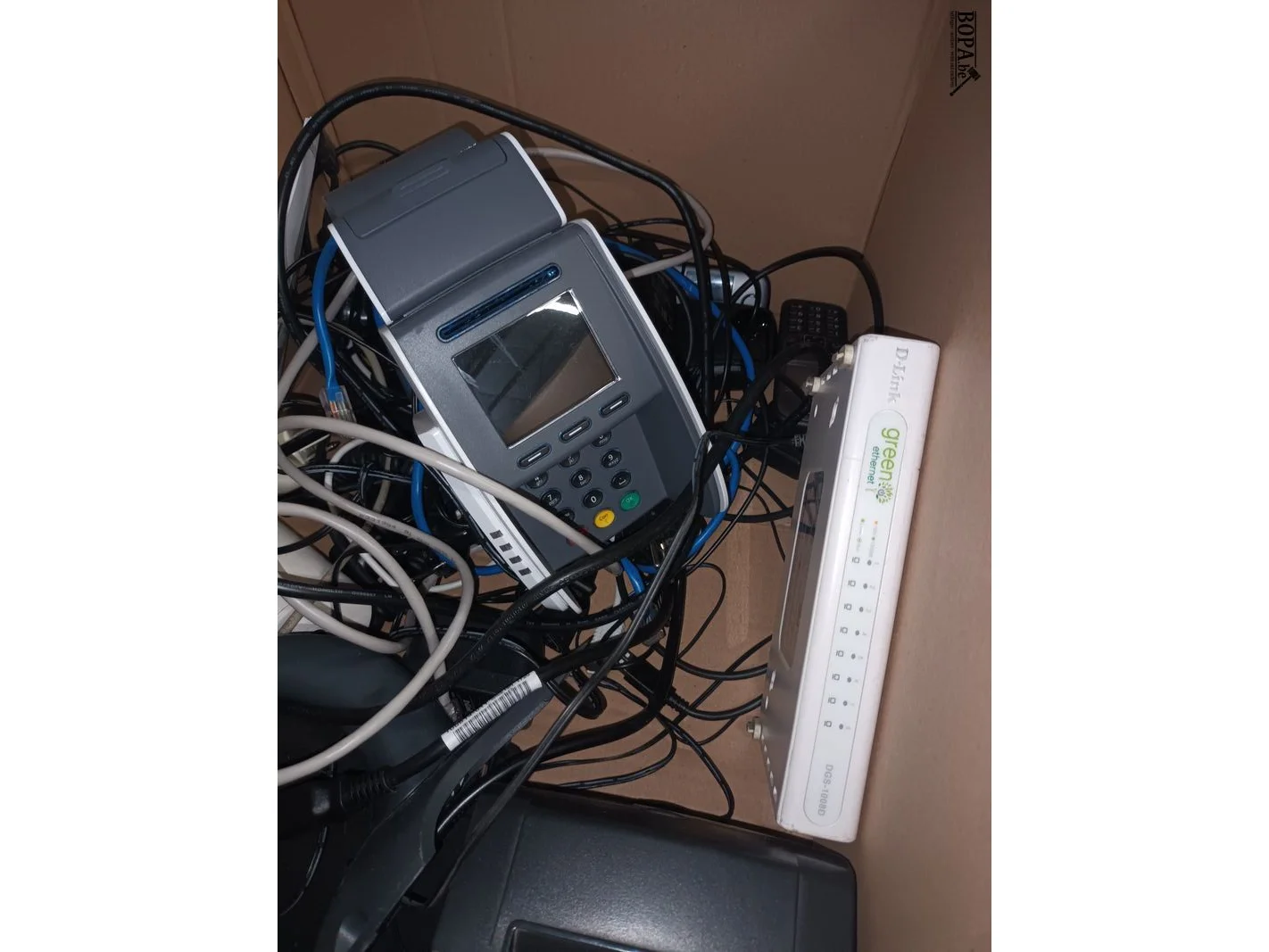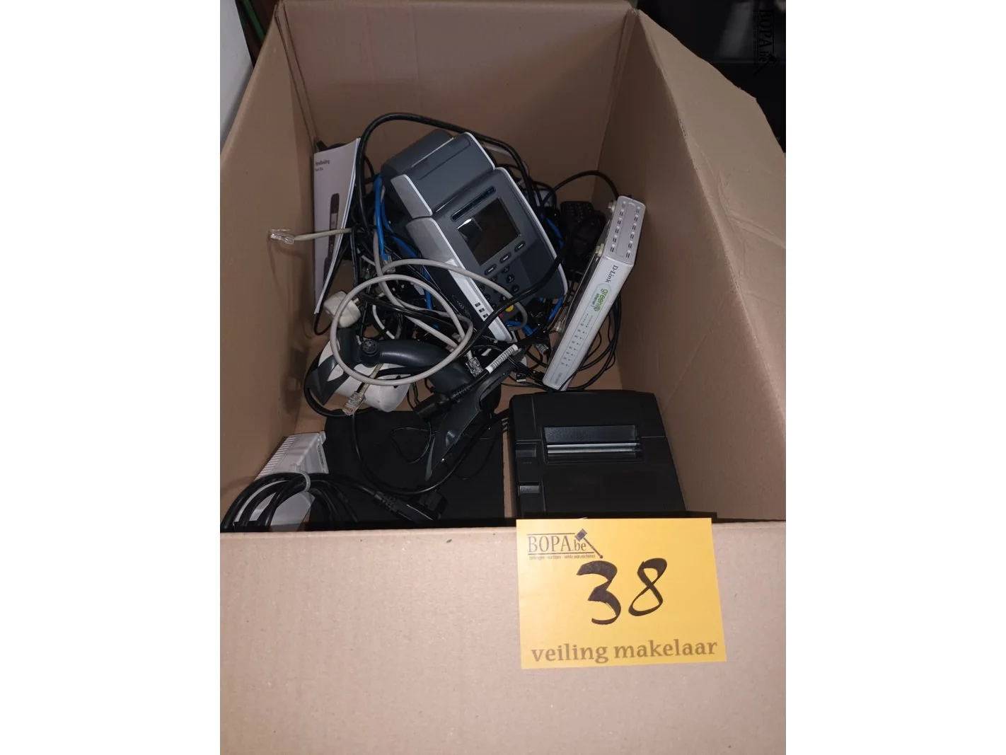 Betaalterminal, ticketprinter, telefoons, D-Link.
