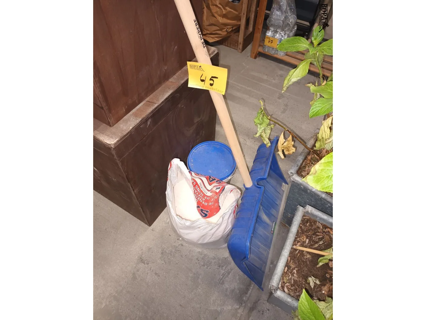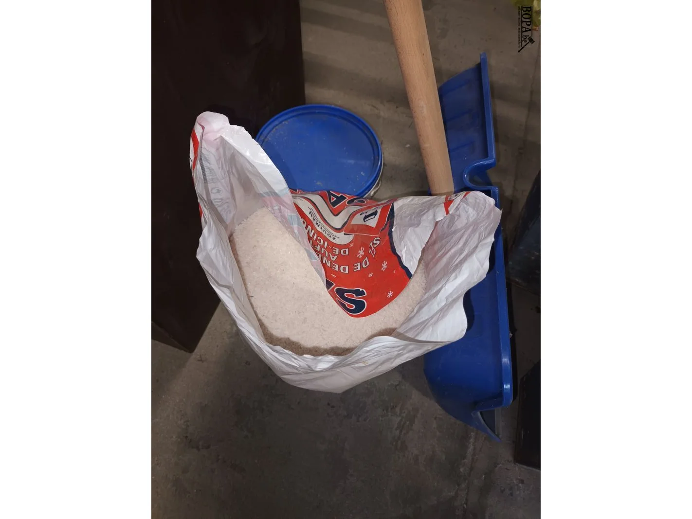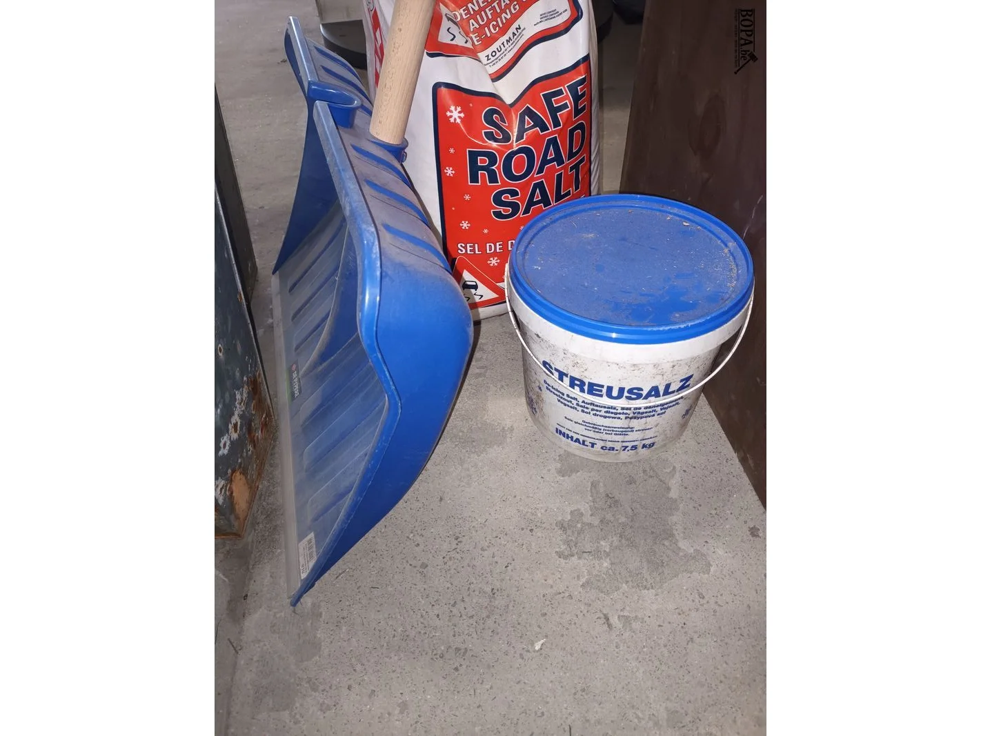 Een sneeuwschep, een aangebroken zak en emmer strooizout.