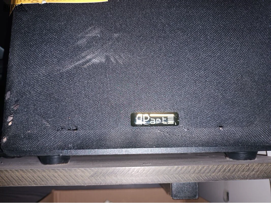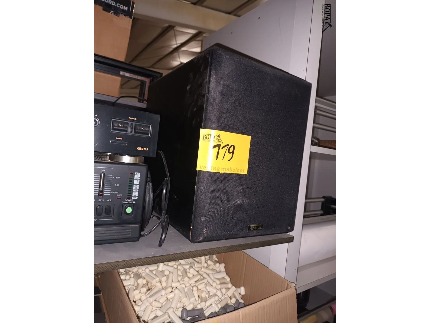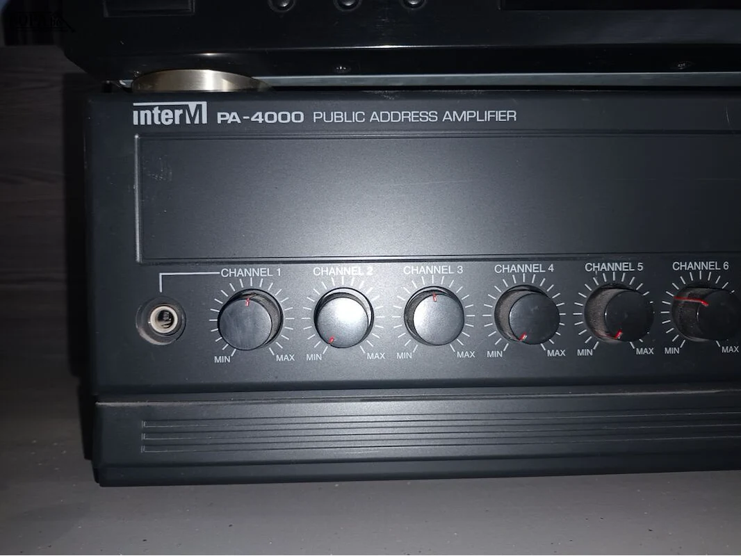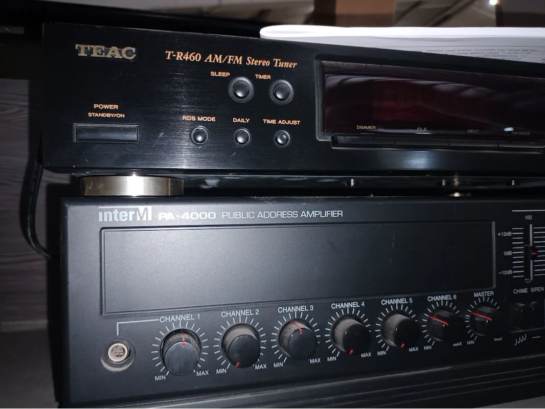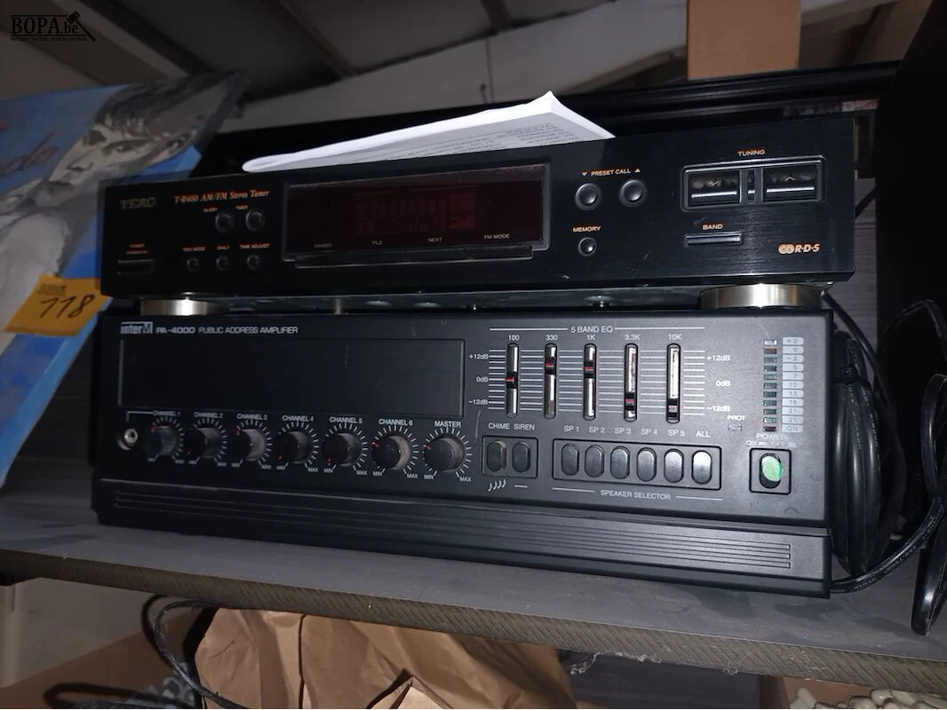 Muziekinstallatie bestaande uit een box Apart, InterM PA-4000 versterker en een TEAC T-R460 stereo radio.