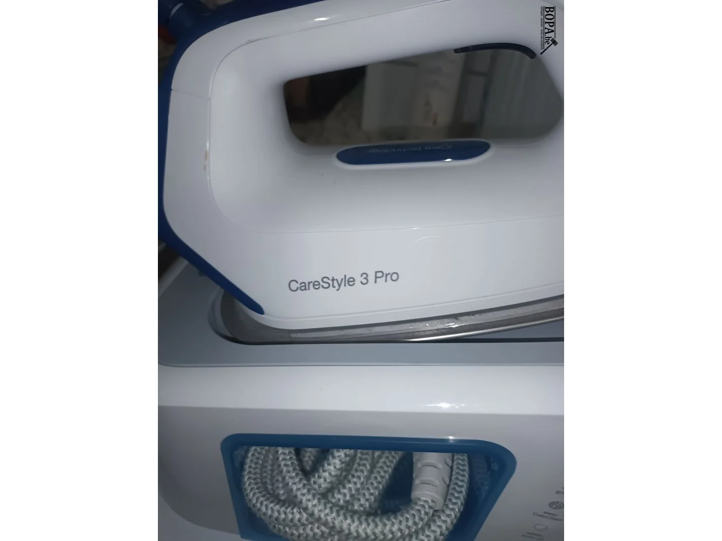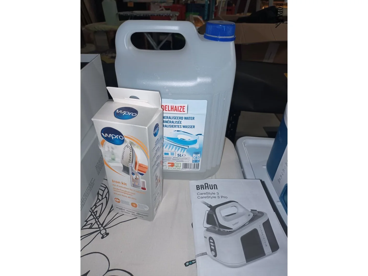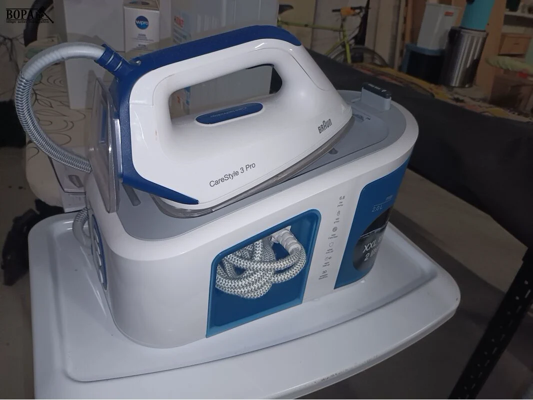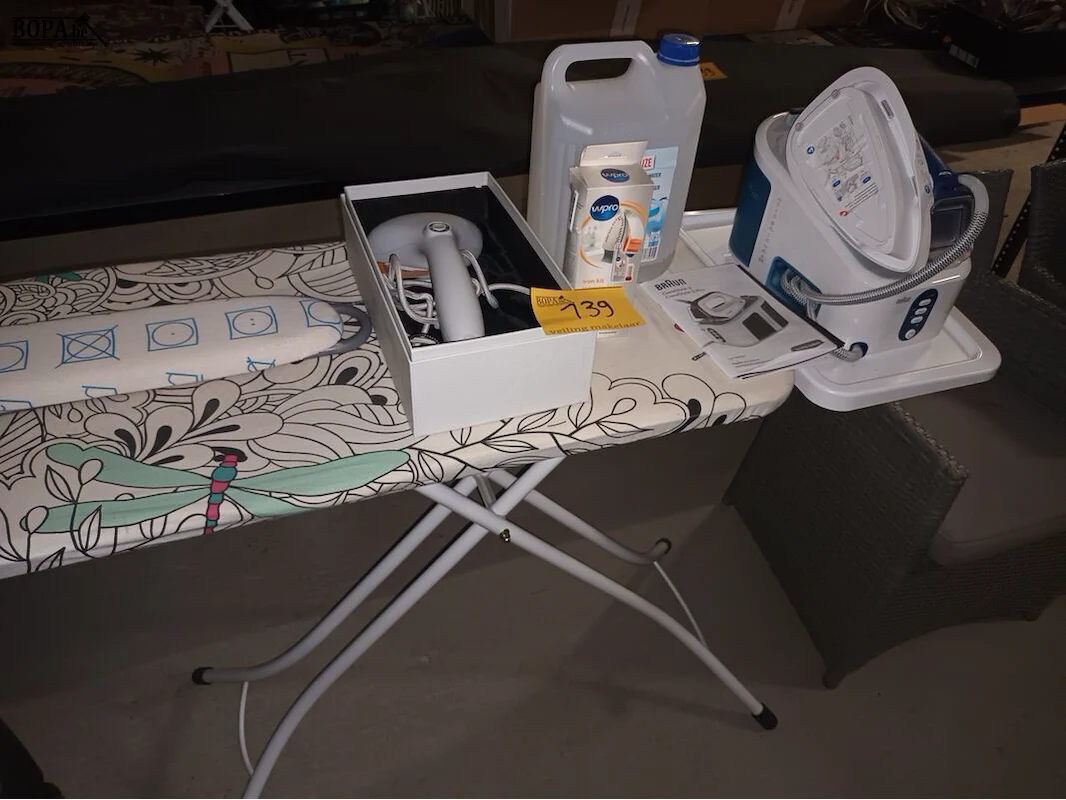 Strijkbenodigdheden. 5 stuks. Brabantia strijkplank, Cirrus n°2 steamer, iron kit, gedemeneraliseerd water en een stoomstrijkijzer Braun CareStyle 3 Pro.