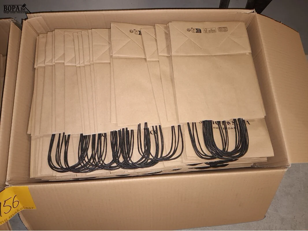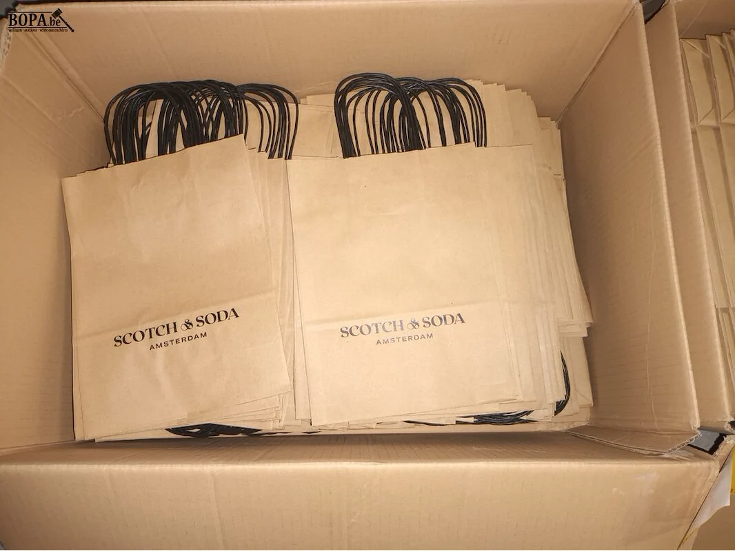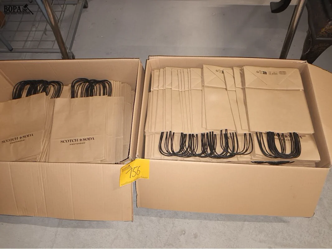 Anderhalve doos met papieren draagtassen Scotch & Soda.