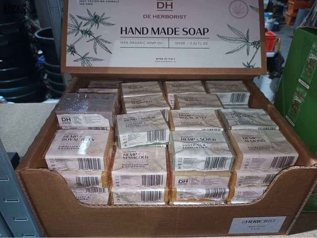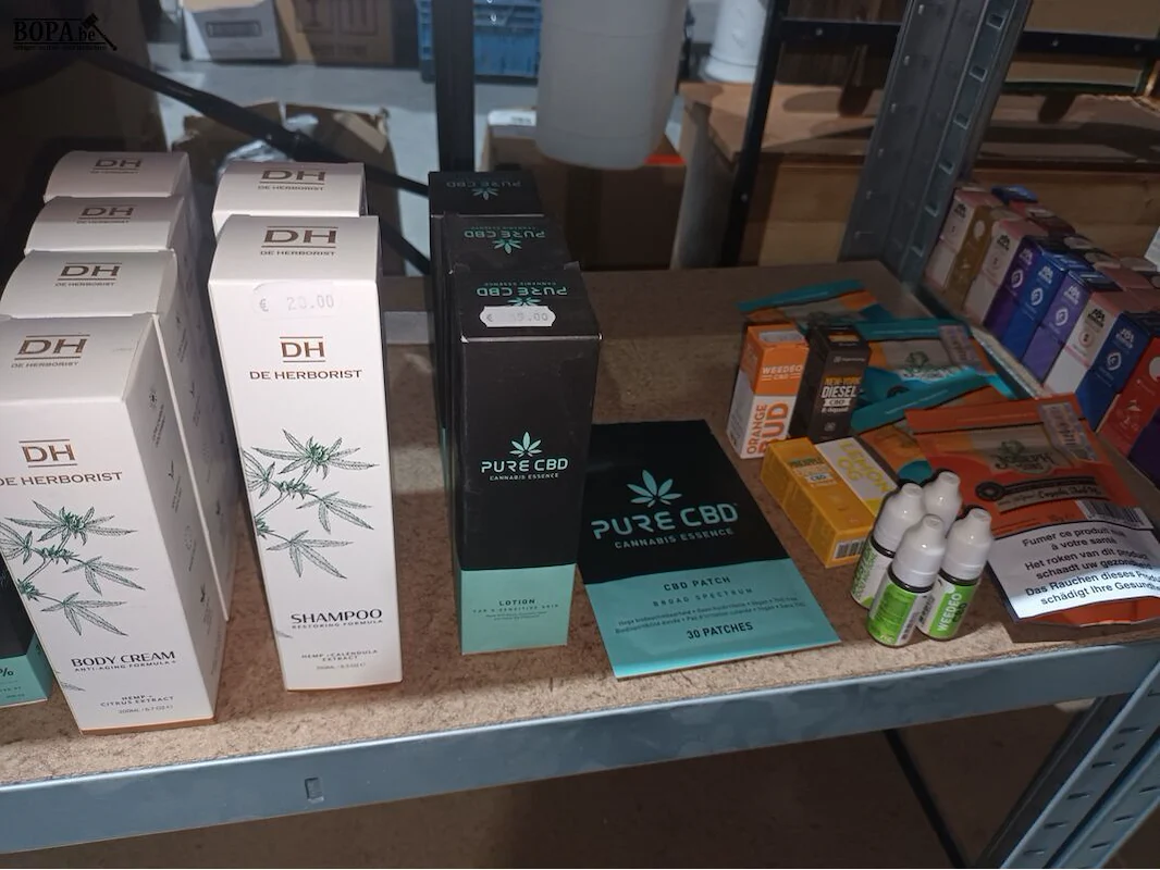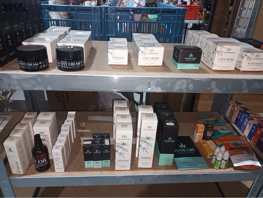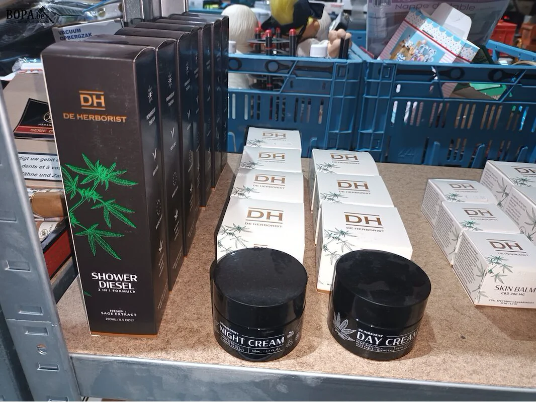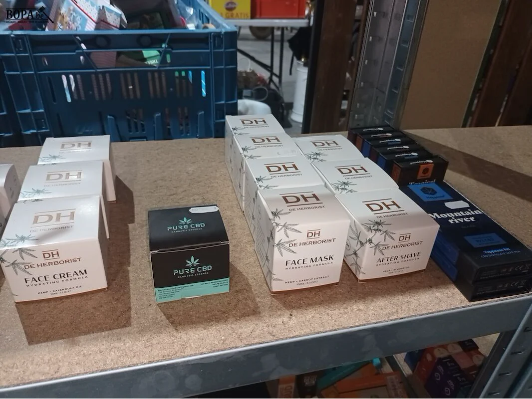 Groot lot schoonheidsproducten op basis van hennep. Dagcrème, gezichtsmaskers, olie, pure cbd, body lotion, after shave, zeep, waterpijp, grinders, etc.