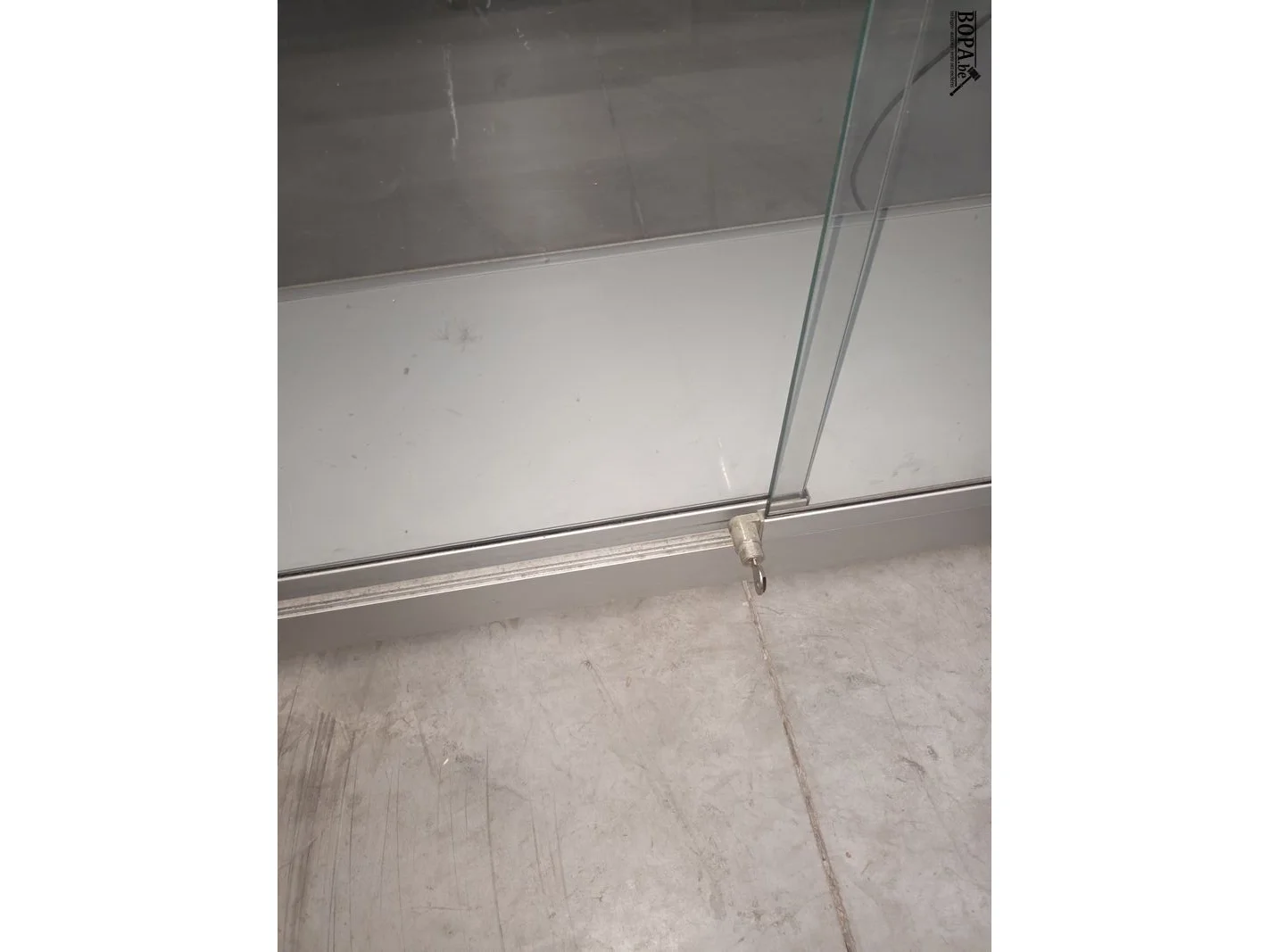 Vitrine kast met glazen schuifdeuren en glazen legbanken en ingebouwde verlichting. 100 x 40 x 200 cm. Sleutel aanwezig.