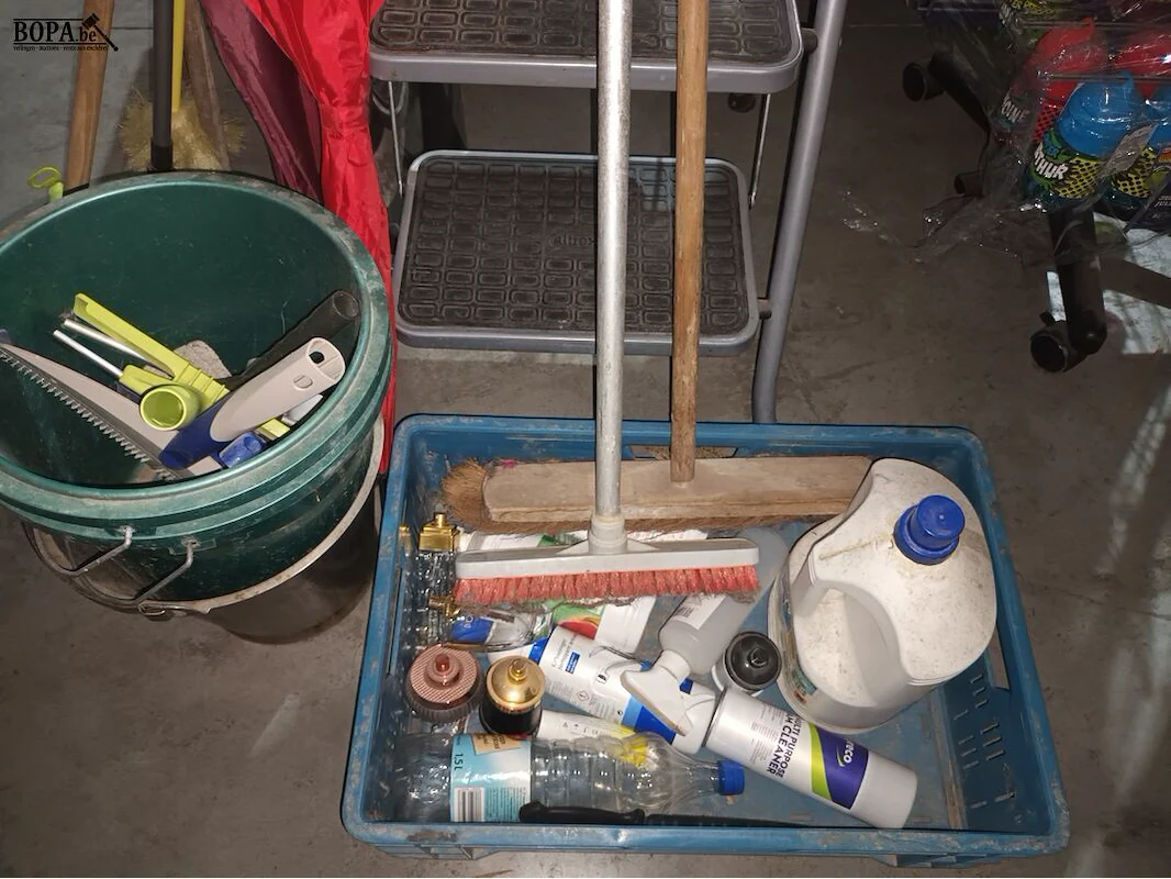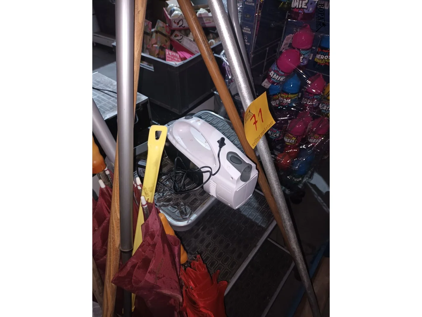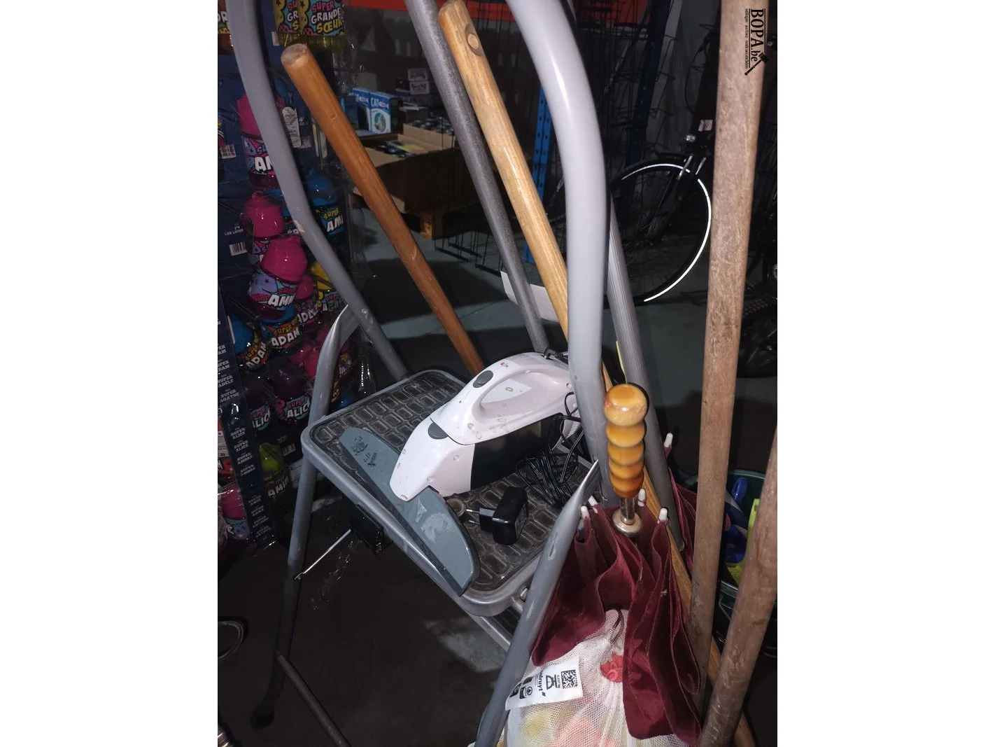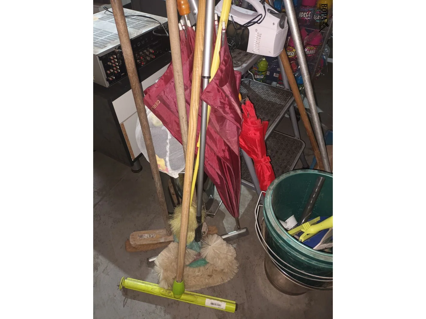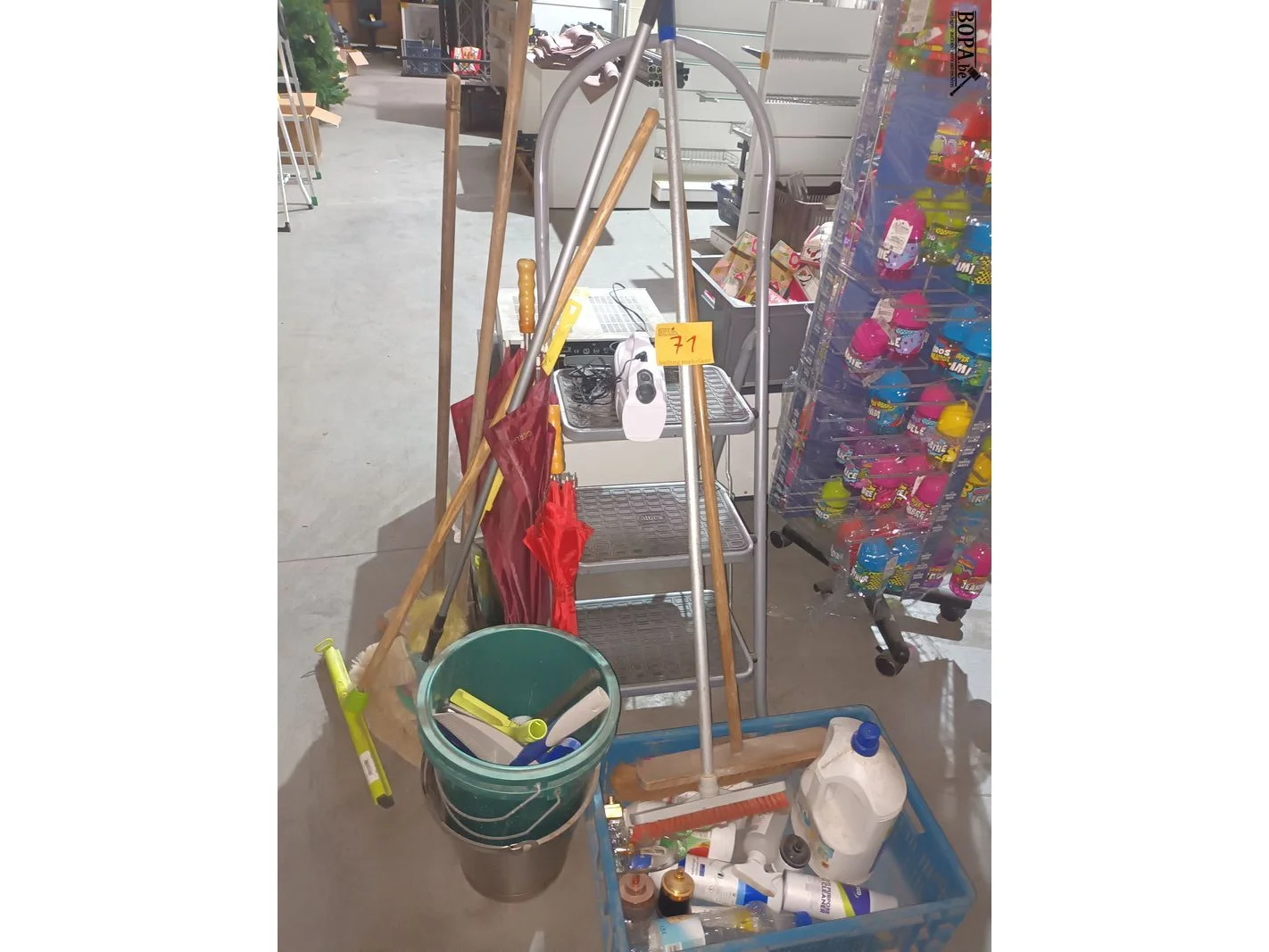 Lot poetsmateriaal, paraplu’s, keukentrapje, producten, etc.