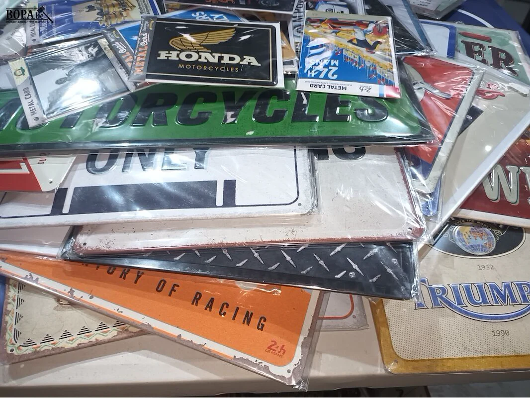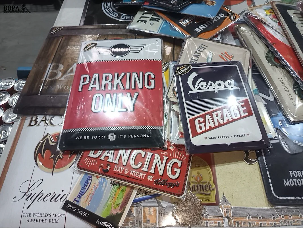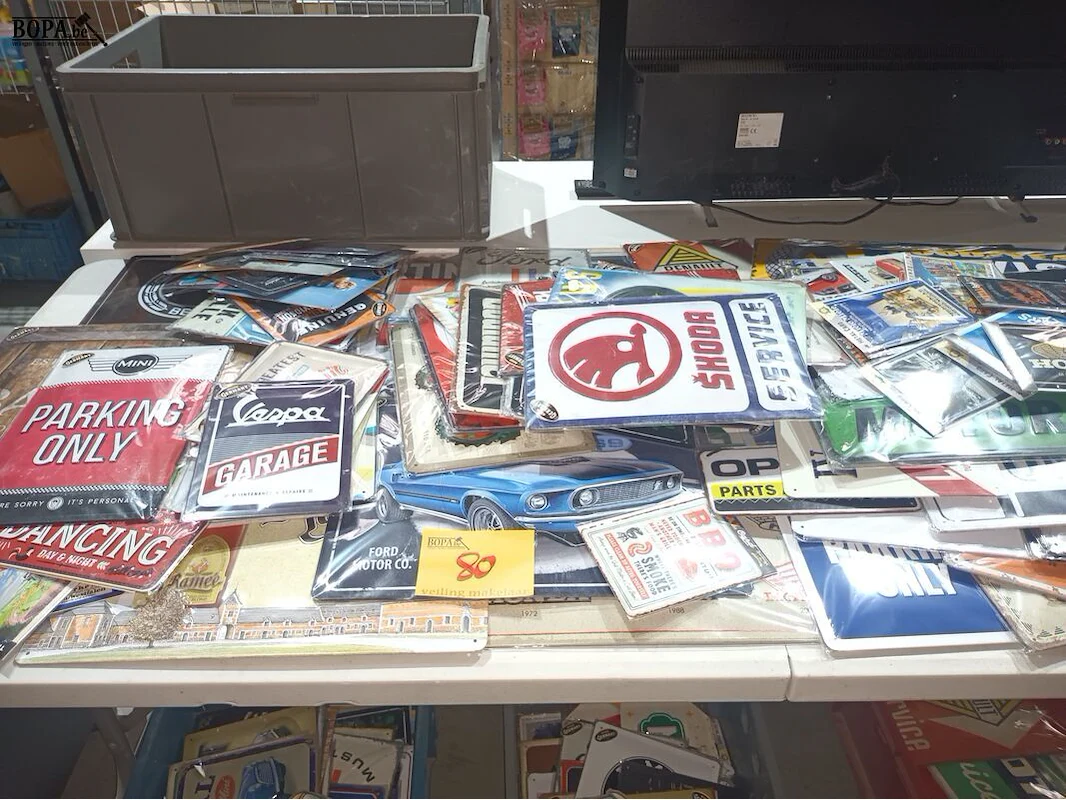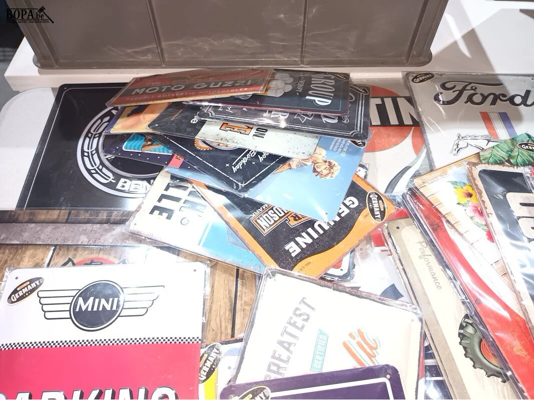 Groot lot nostalgische metalen bordjes liggend op de tafel.