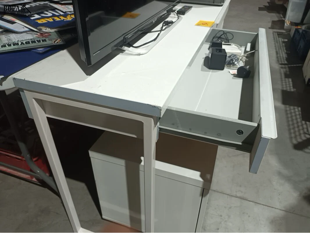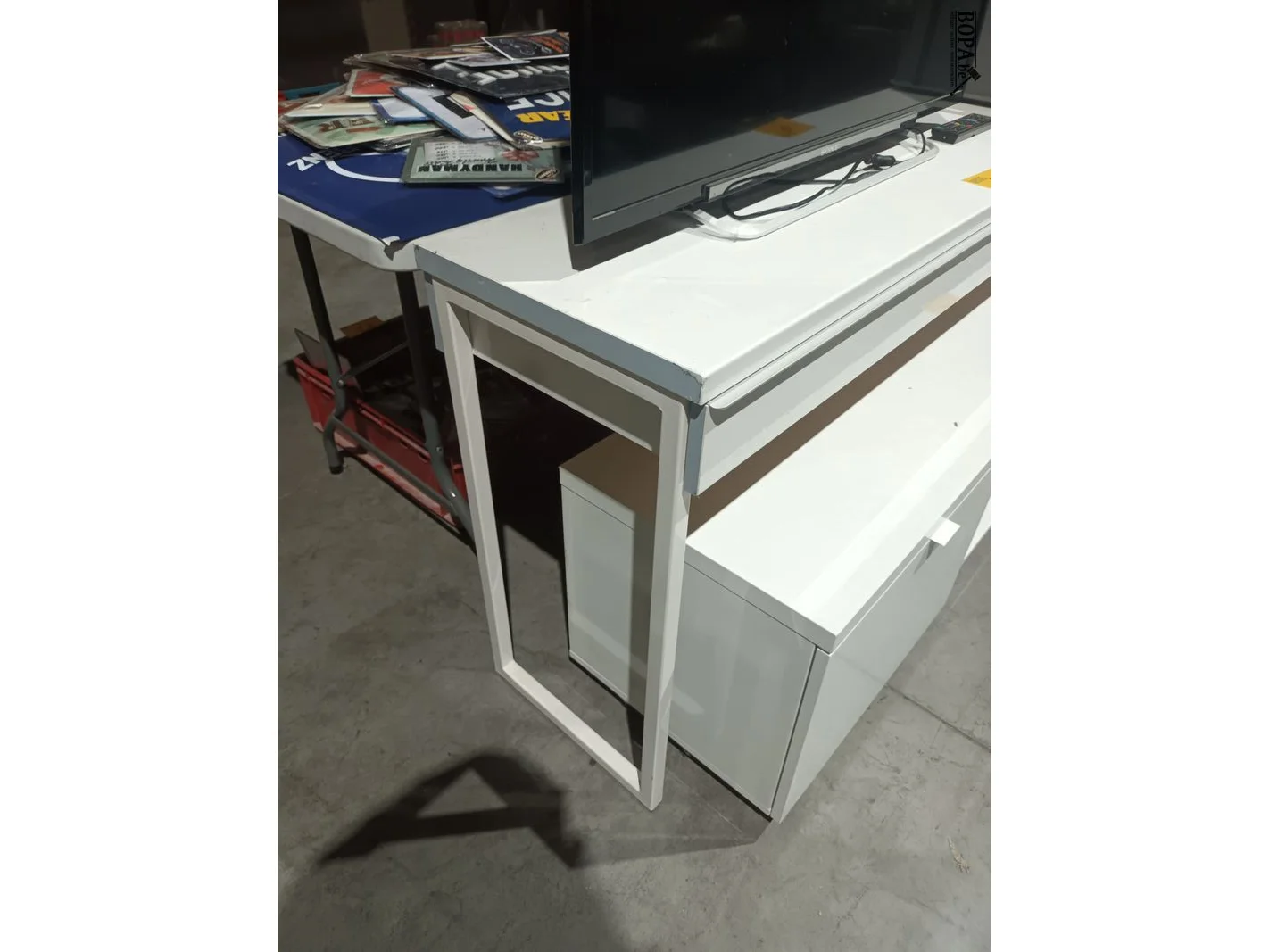 Glanzende witte tafel met lade. 180 x 47 x 75 cm.