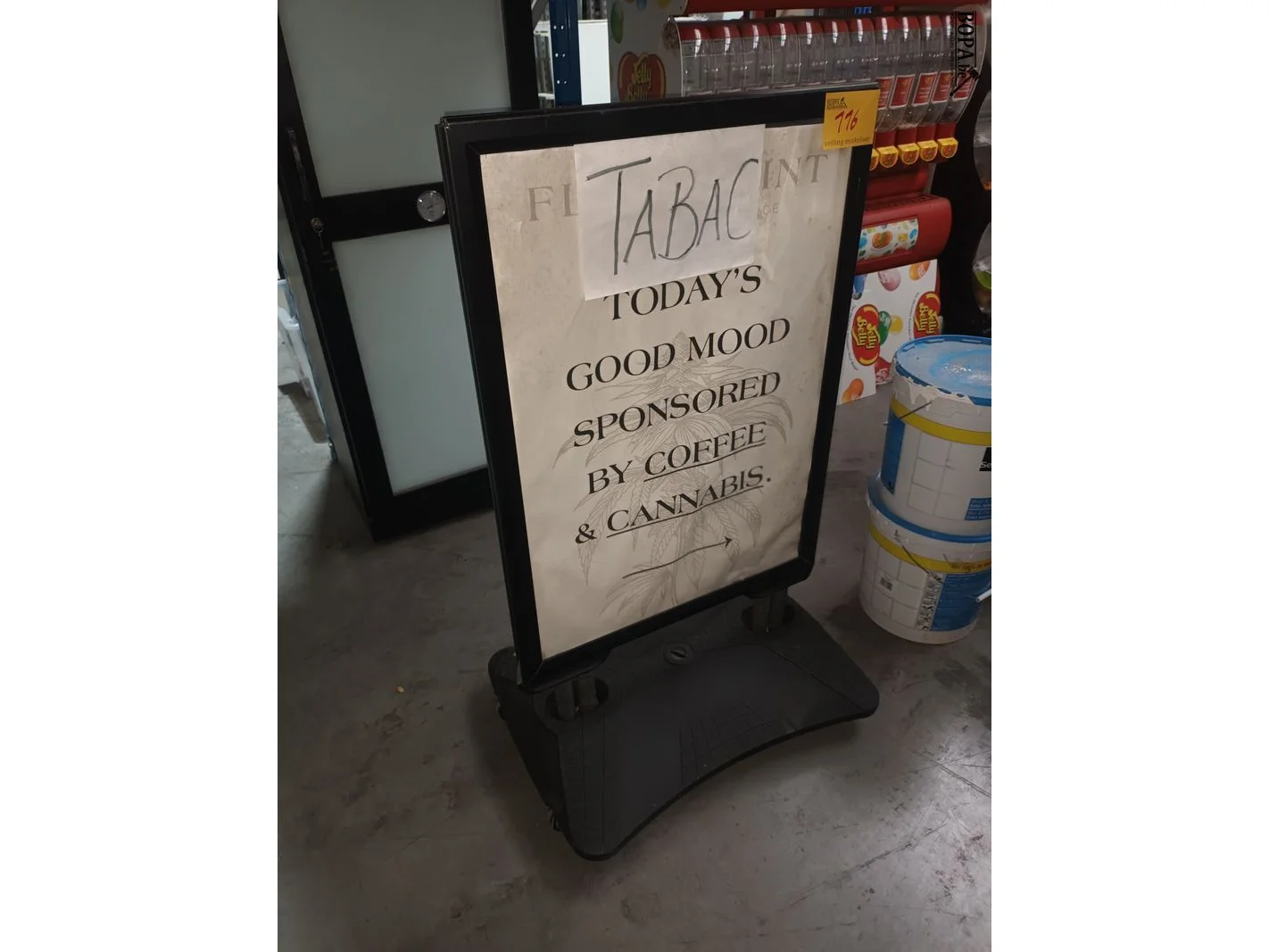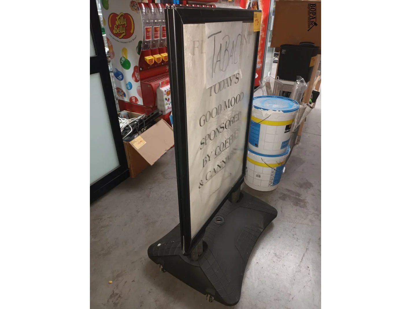 Dubbelzijdig stoepbord met verzwaarde voet. 70 x 50 x 120 cm.