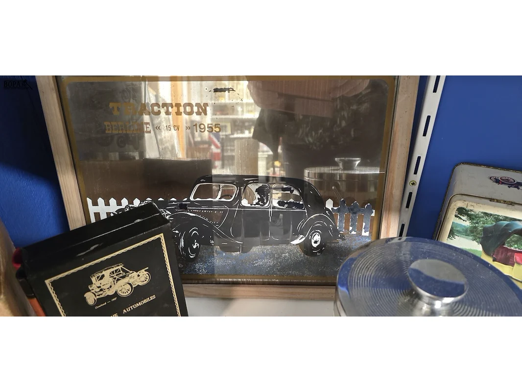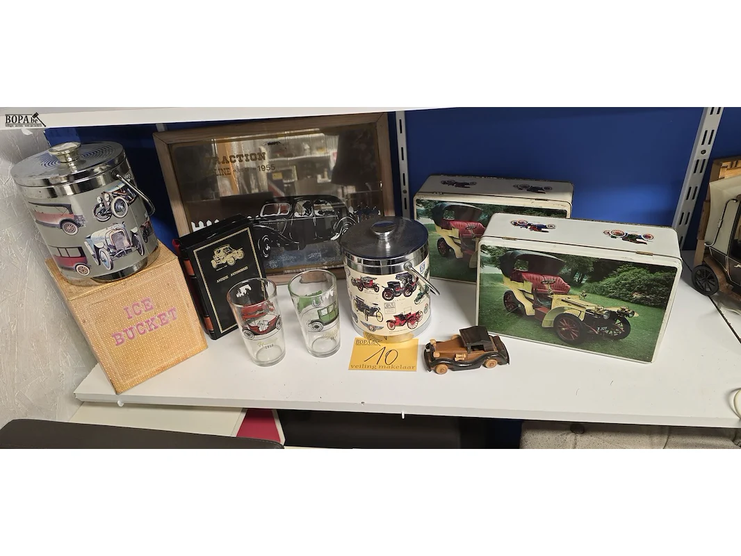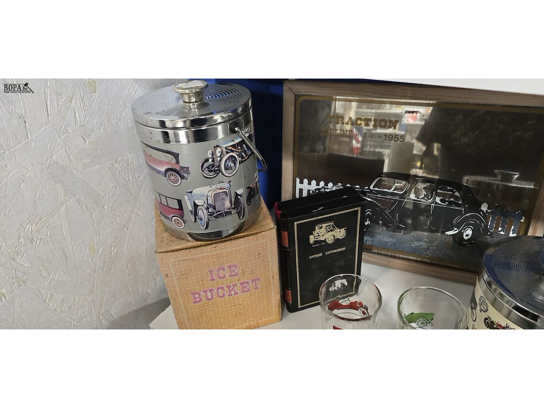 Lot diverse auto verzamel items , ijemmer 2 stuks, kist in boekvorm, spiegel met Traction Berline 1955, 2 glazen, 2 blikken doze en houten autootje