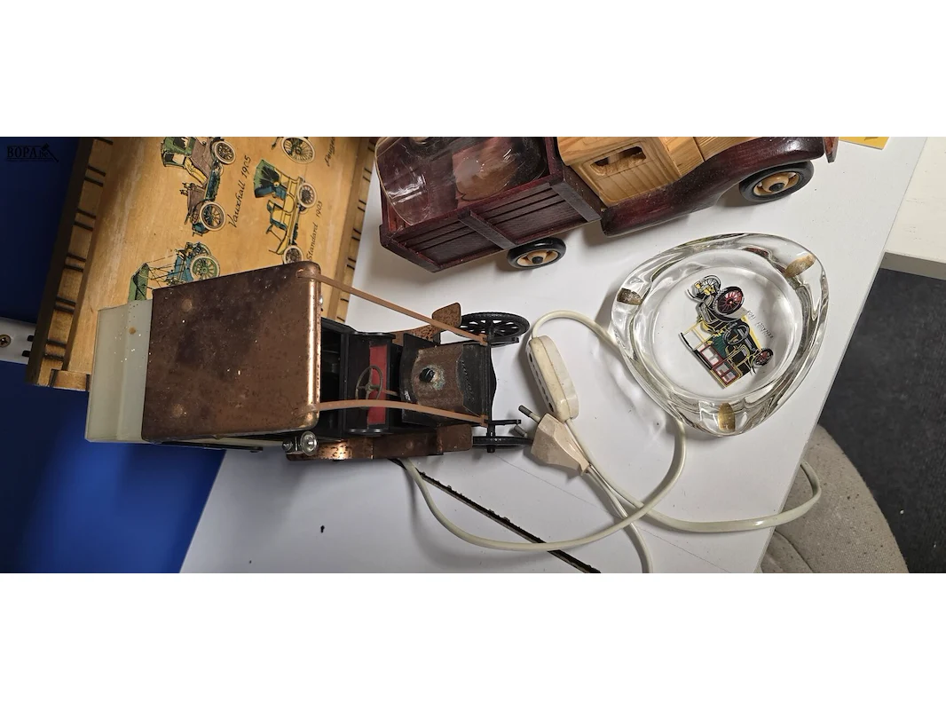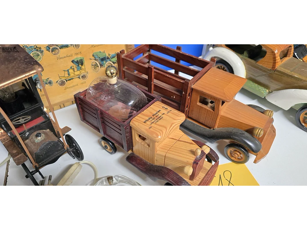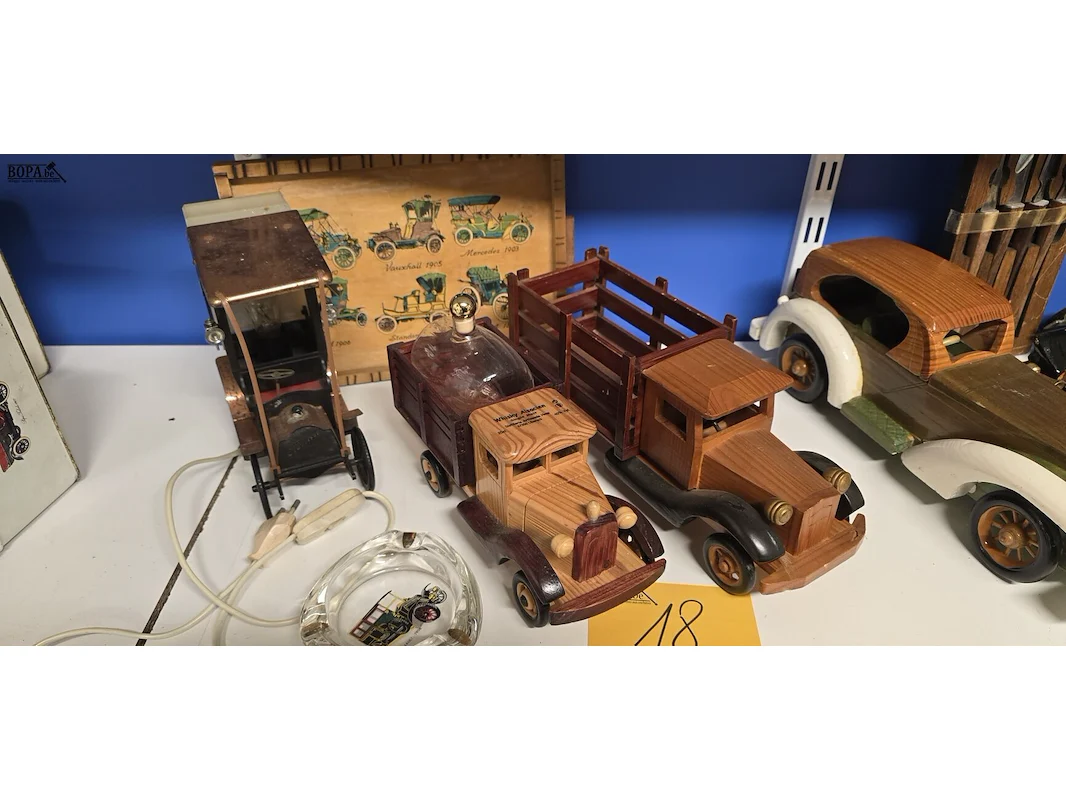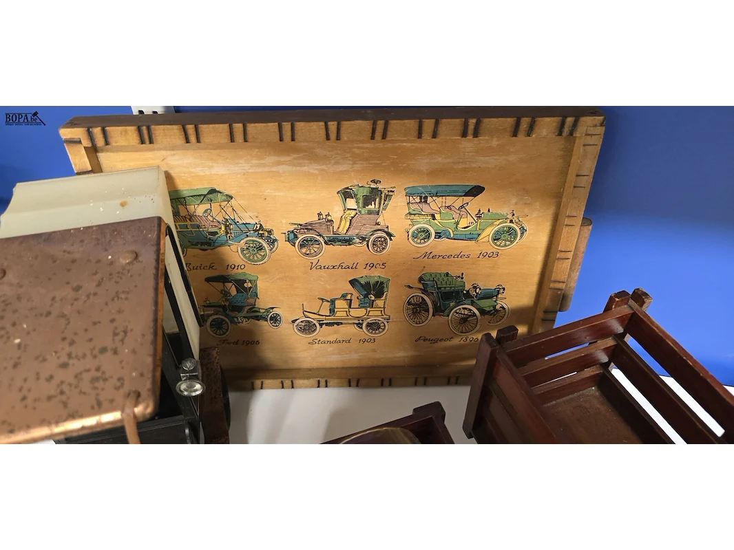 Houten 2 vrachtwagens en metalen lampedaire auto en asbak met auto tekening en houten dienblad met tekeningen