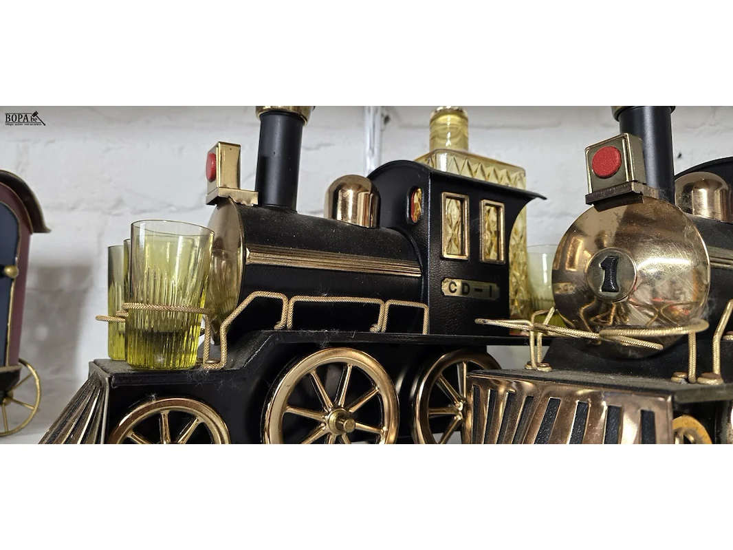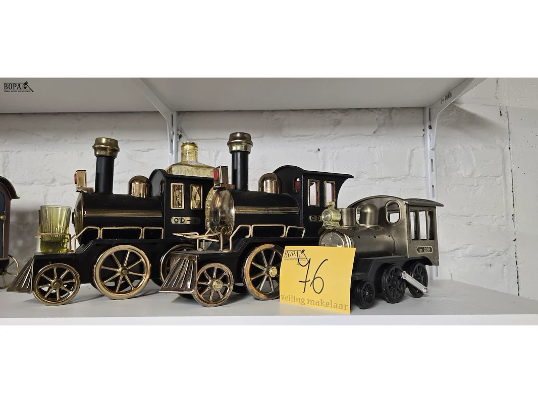 Metalen locomotieven waarvan 1 met fles en glaasjes