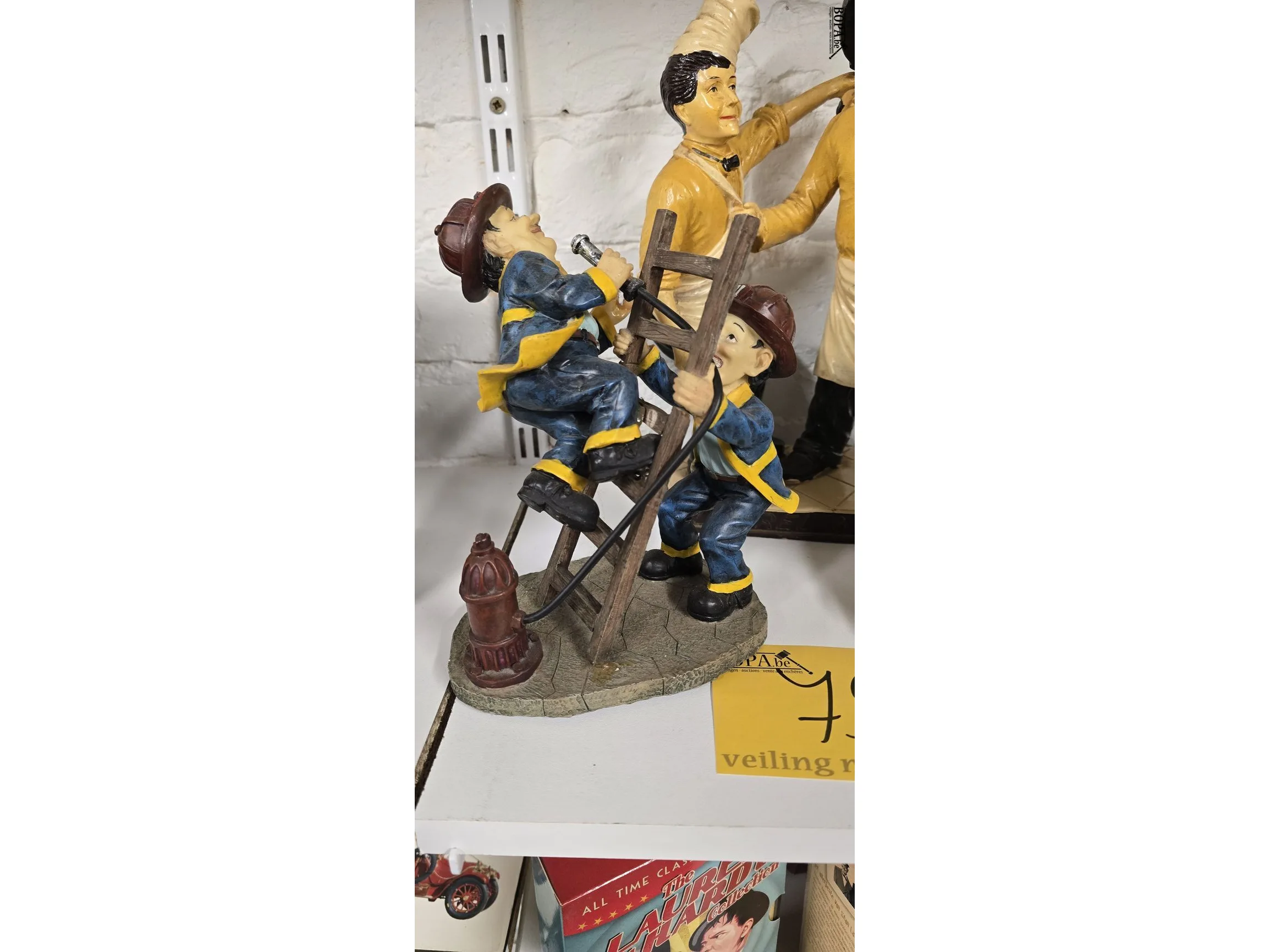 Beeldjes Laurel & Hardy 3 stuks, koks, brandweer en leunend tegen lantaarn