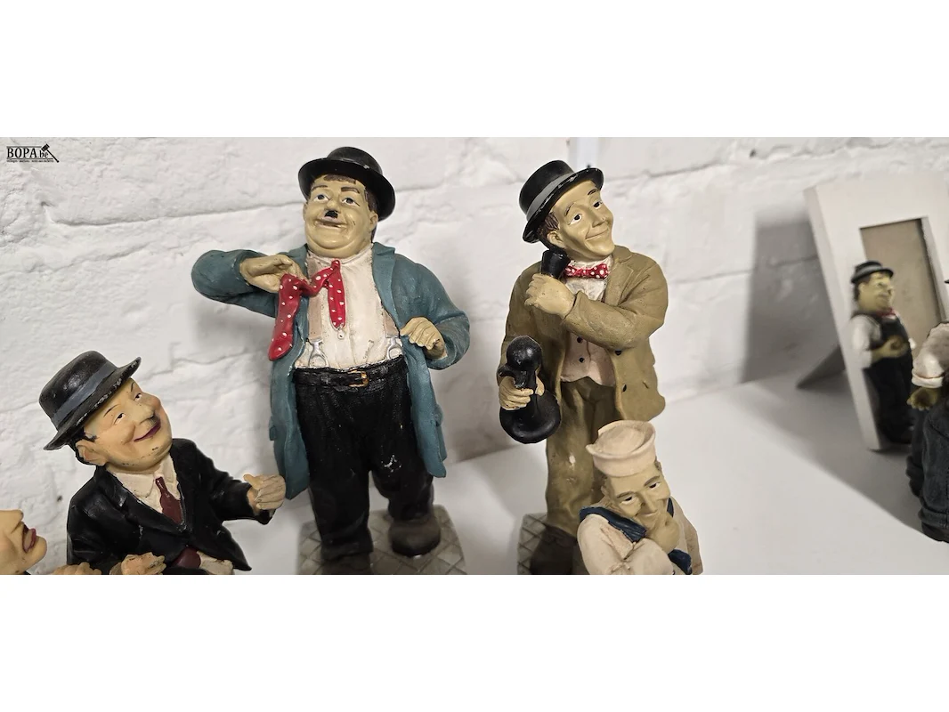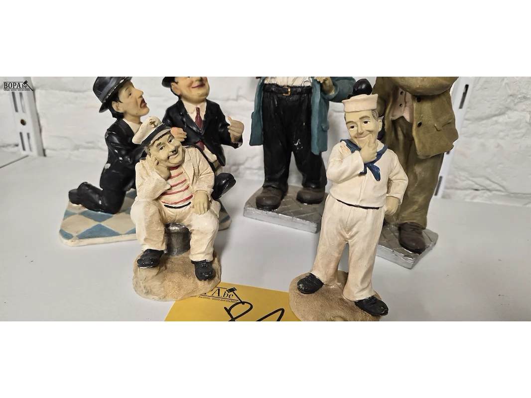 Laurel & Hardy beeldjes 5 stuks, koppel telefonerend, toiletbezoek en koppel denkers