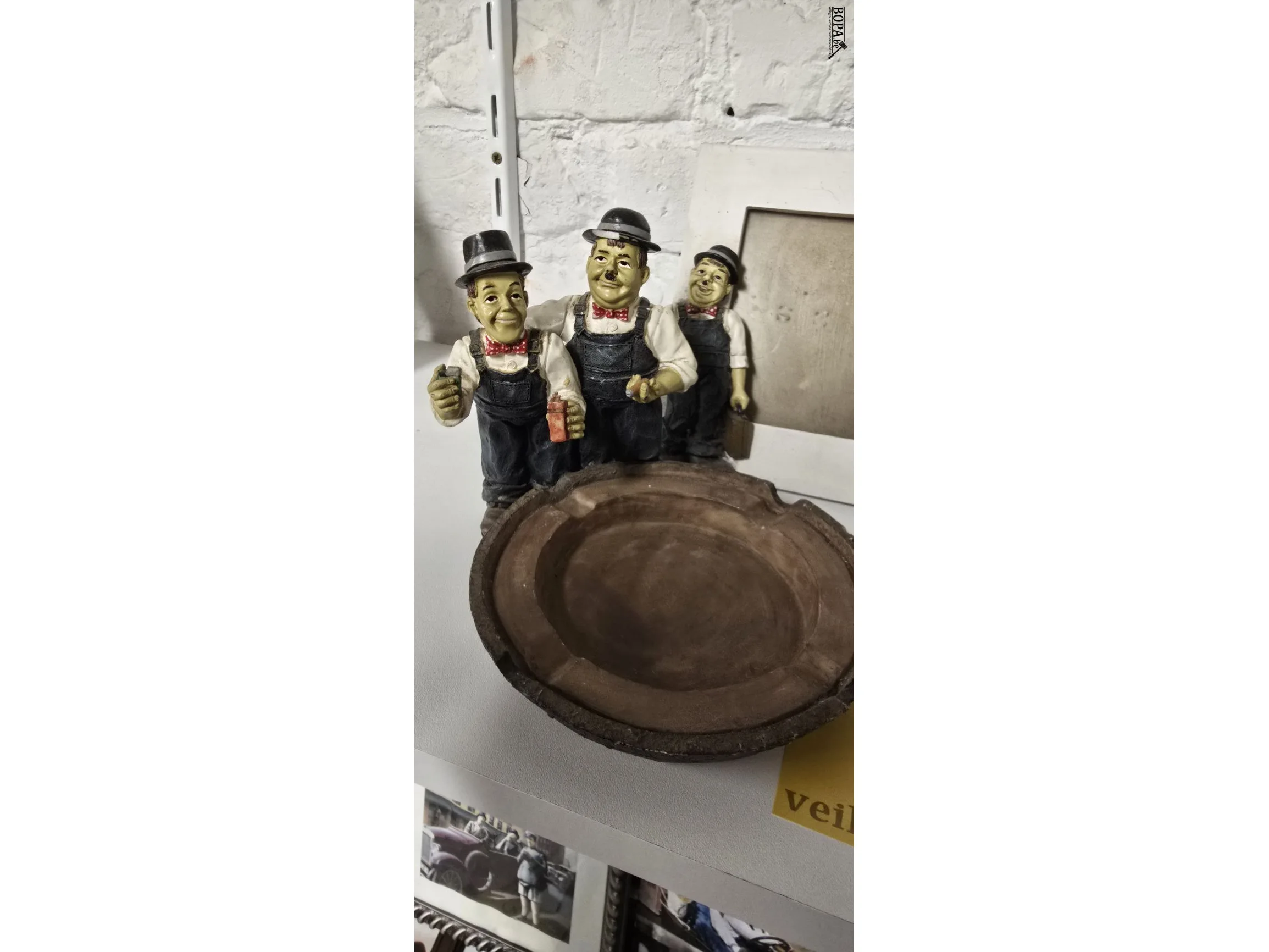 Laurel & Hardy beeldjes, in kist en asbak en kadertjes met figuurtjes