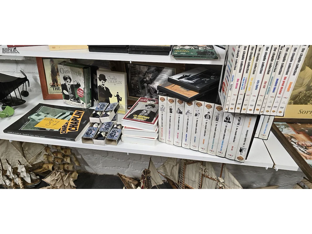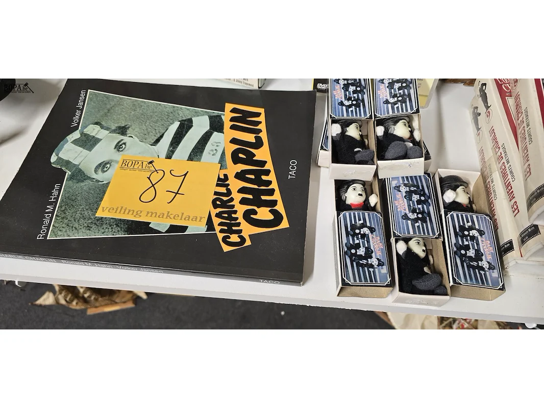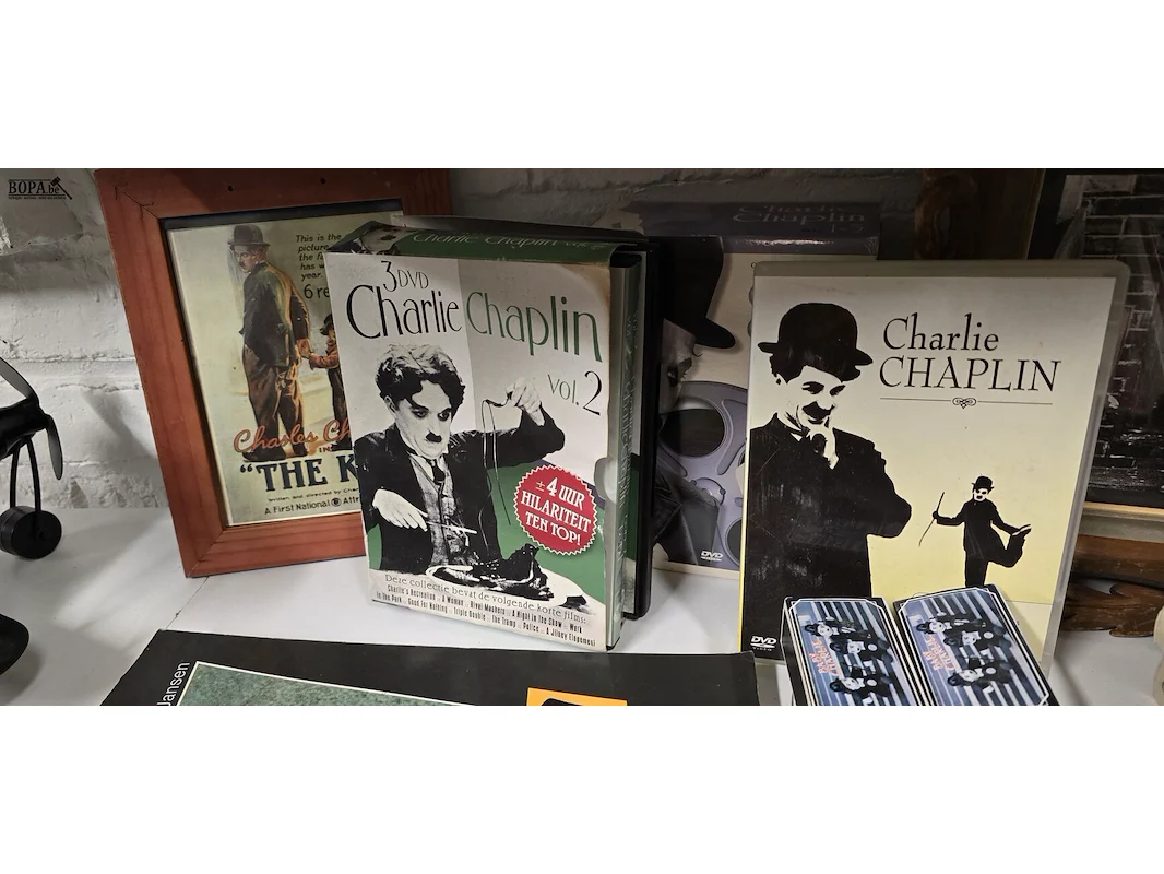Groot lot Charlie Chaplin video en dvd collectie, boeken en mini popjes in doosje en kader ong 20 stuks
