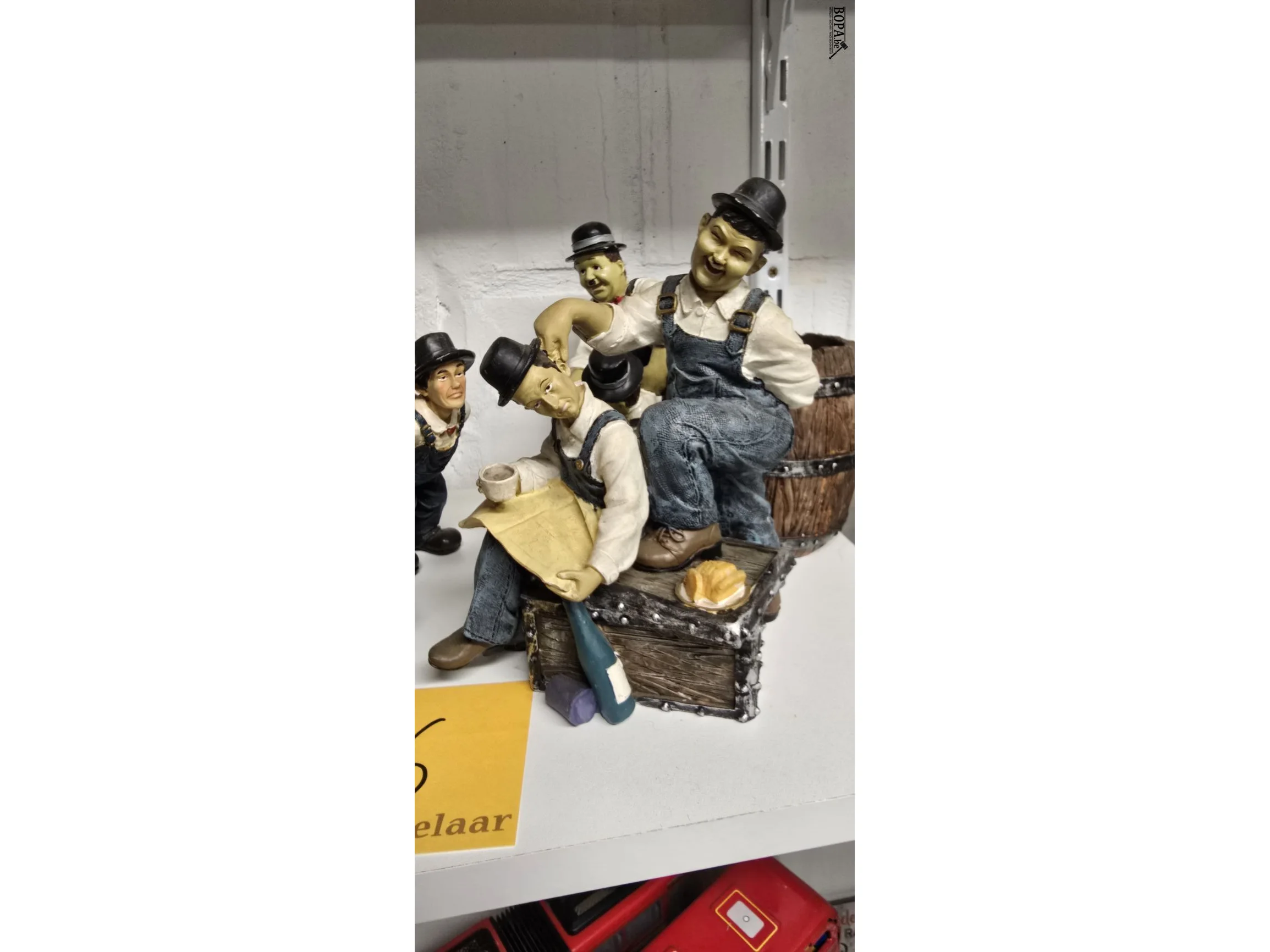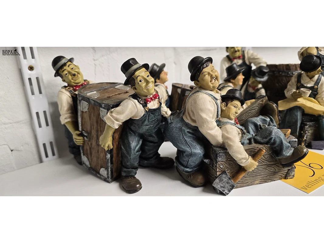Laurel & hardy beeldjes 5 stuks, 4 x met kist en 1 met ton koffie drinkend