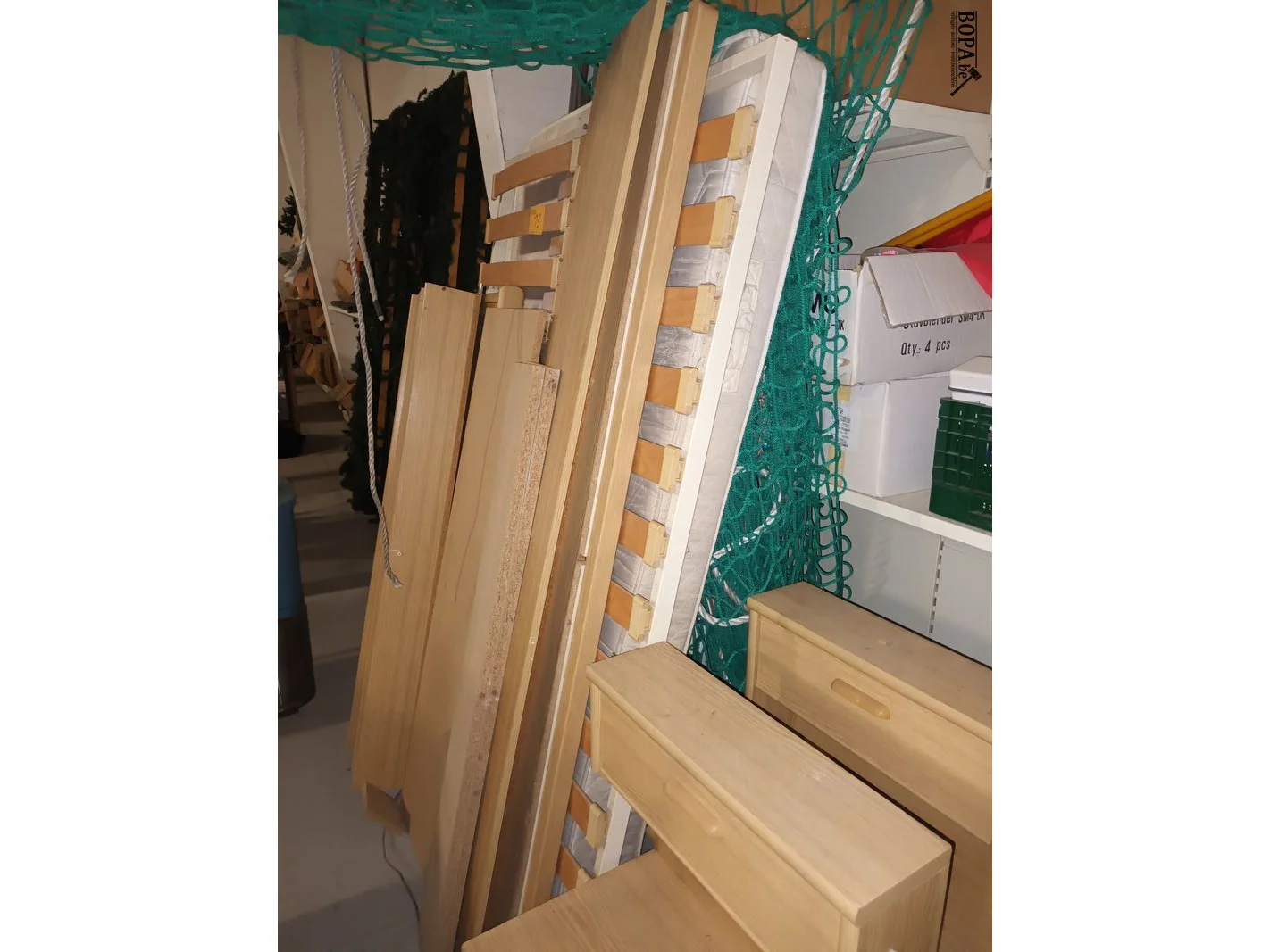 Tweepersoonsbed (140 x 200 cm) met matras, lattenbodem en 2 nachtkastjes. Reeds gedemonteerd.