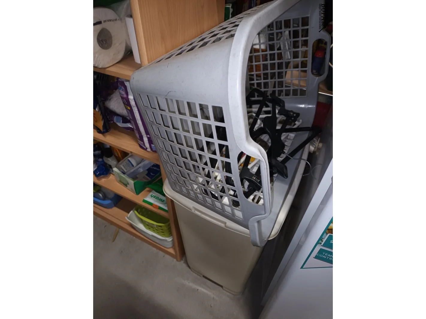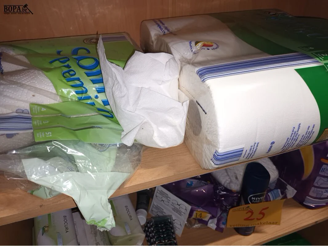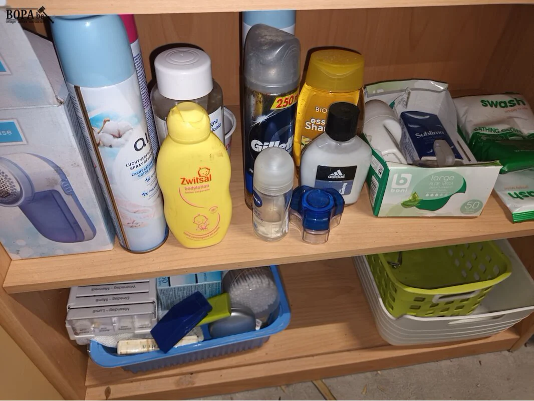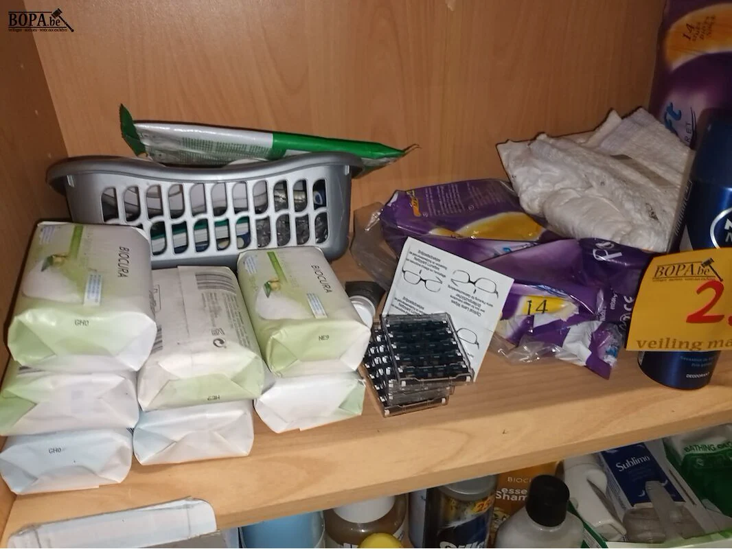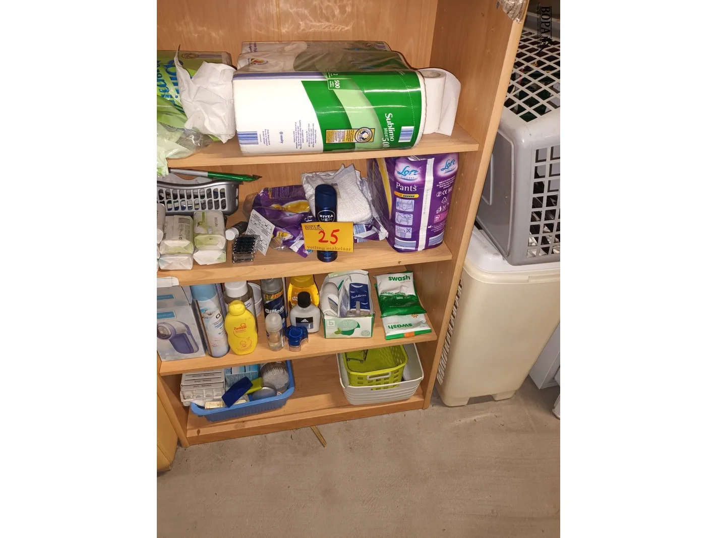 Persoonlijke verzorging. Inhoud kast + 2 wasmanden naast de kast.