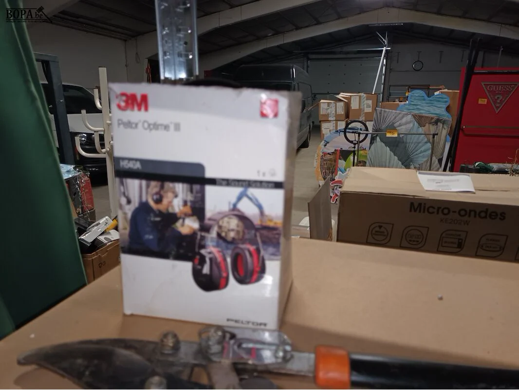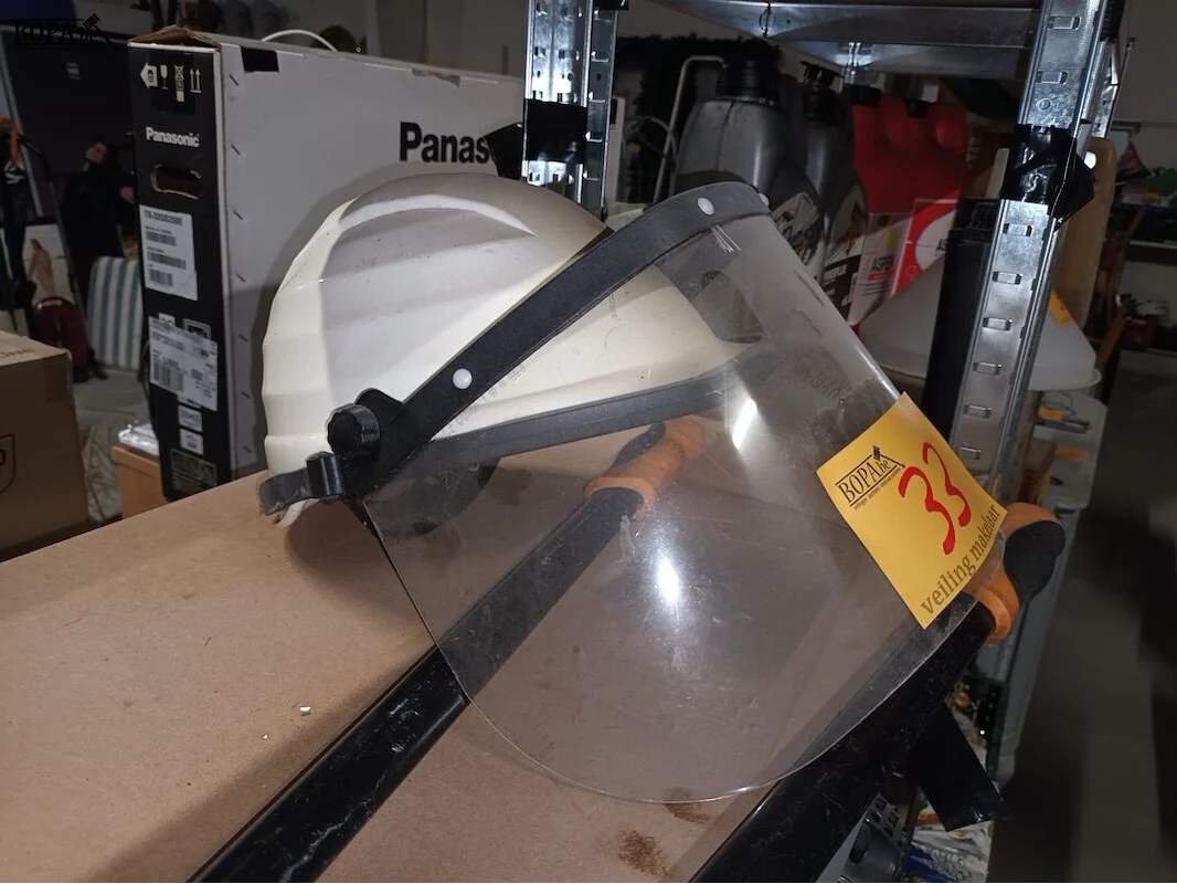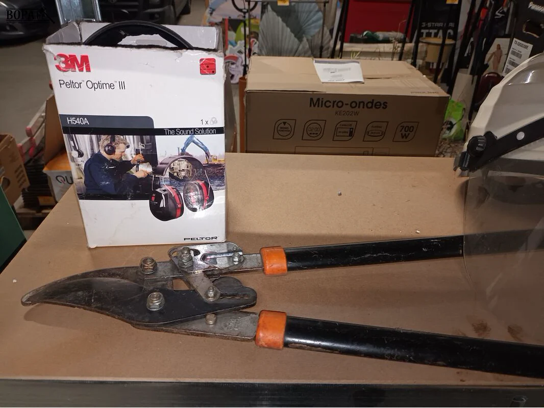 Heggenschaar, gehoorbescherming en een helm met beveiligingsscherm.