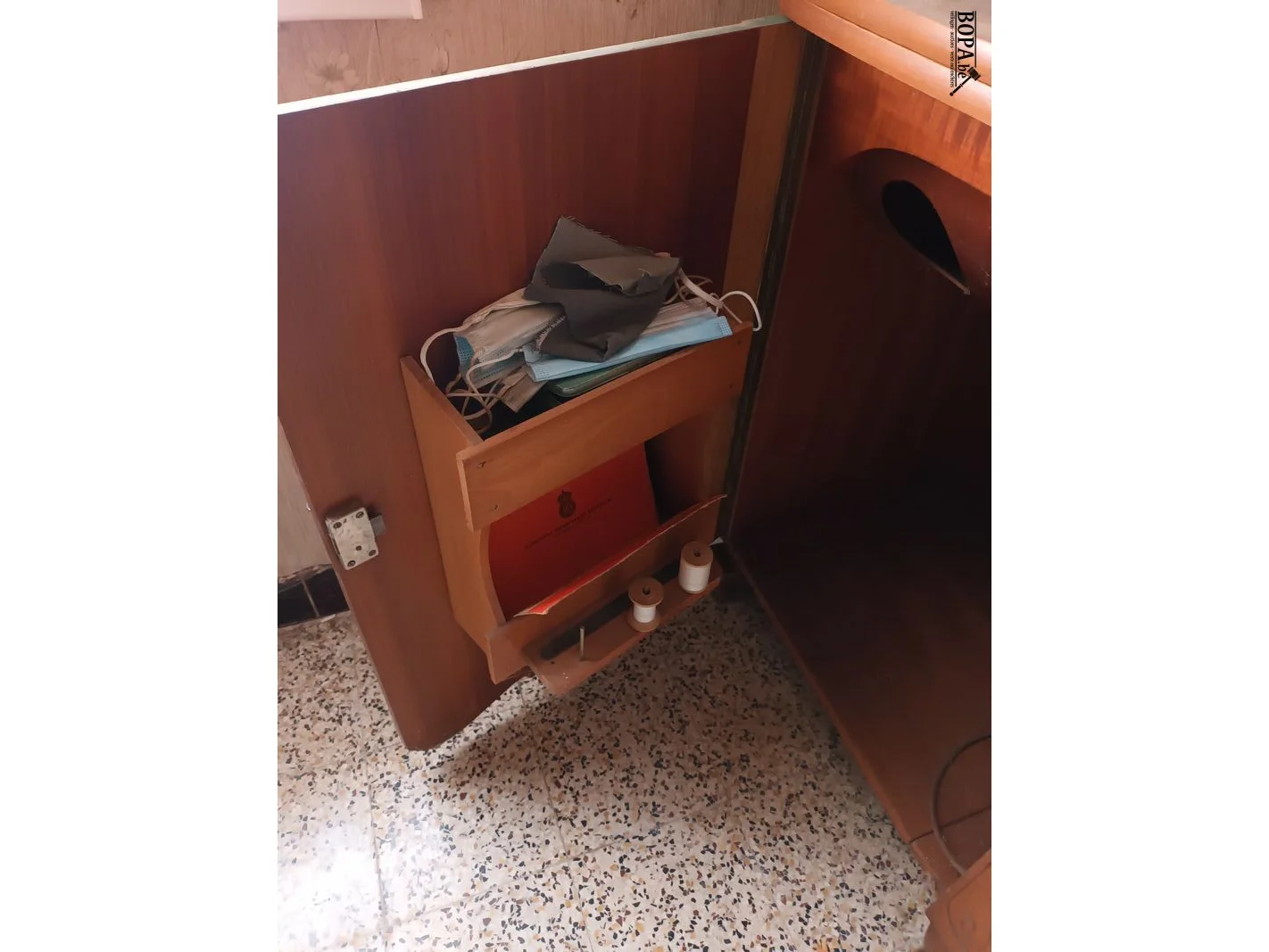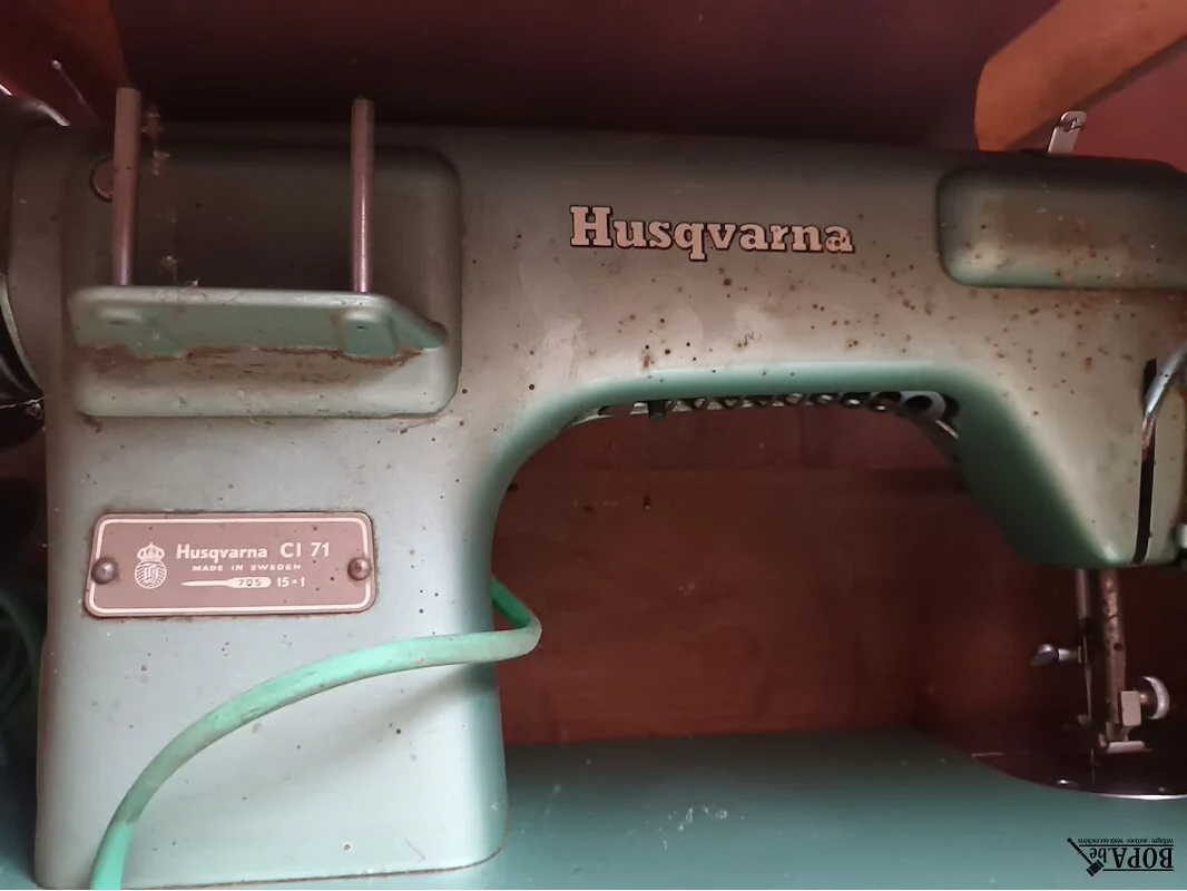 Vintage houten kastje met Husqvarna naaimachine. 62 x 45 x 78 cm.