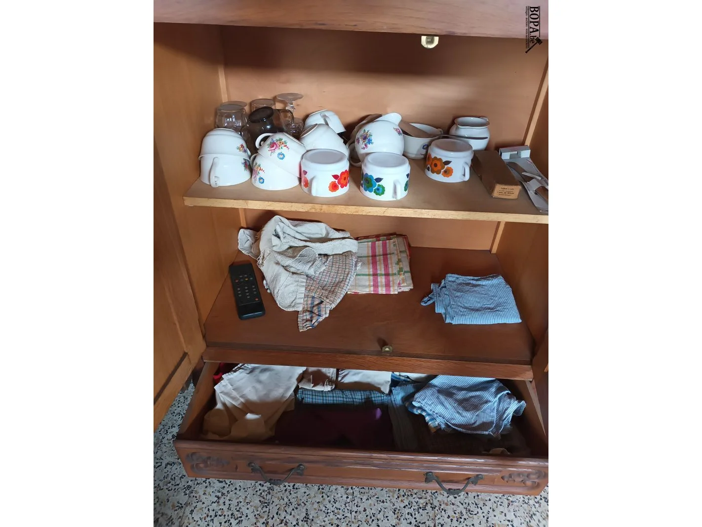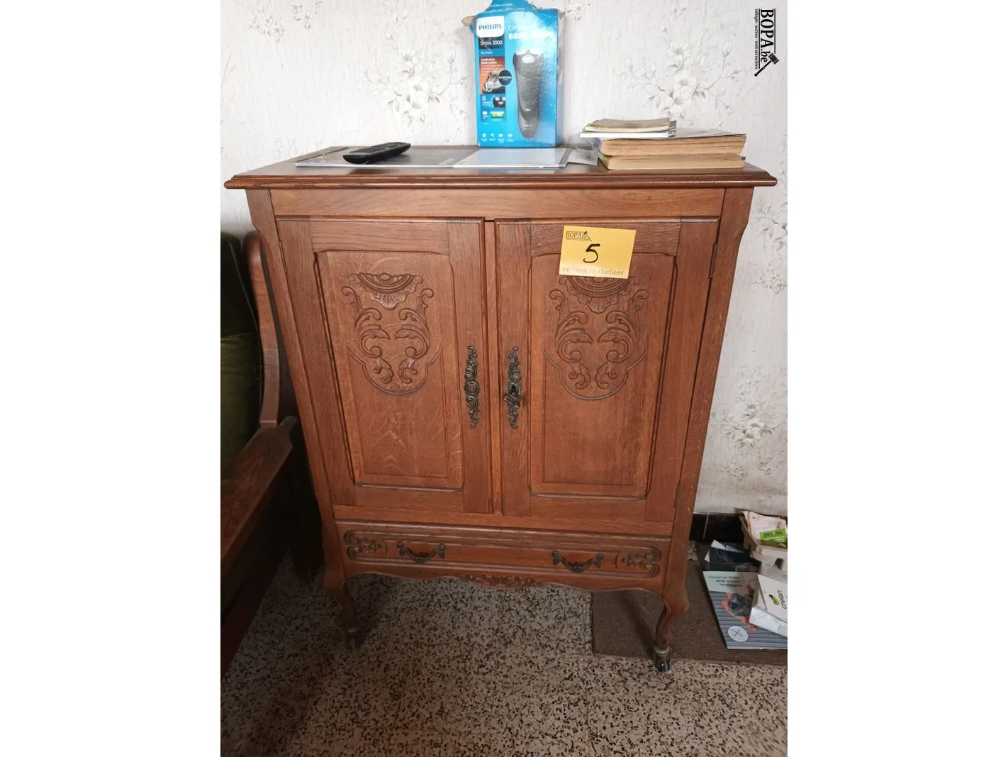 Houten kastje op wielen met inhoud. 80 x 44 x 107 cm.