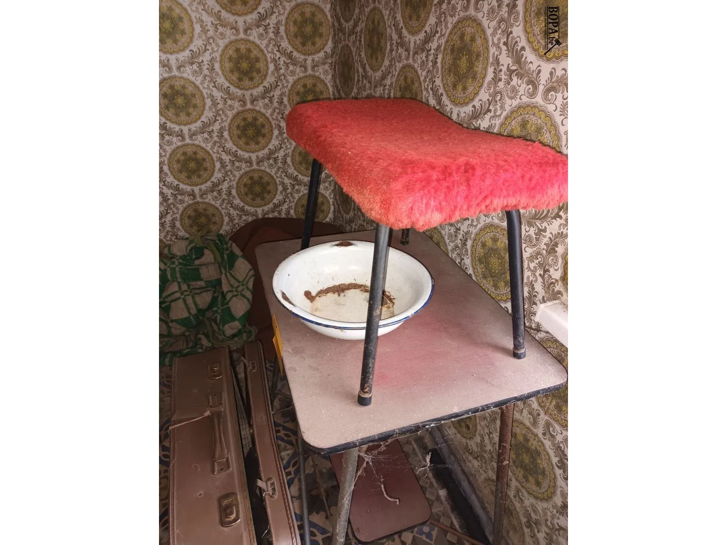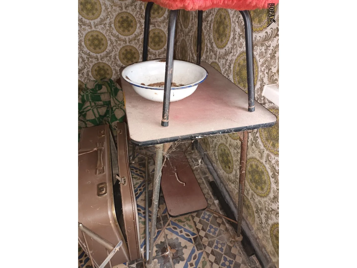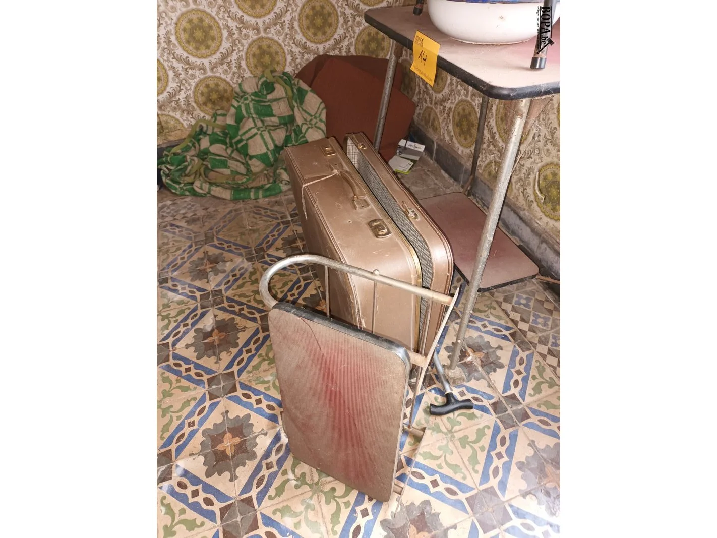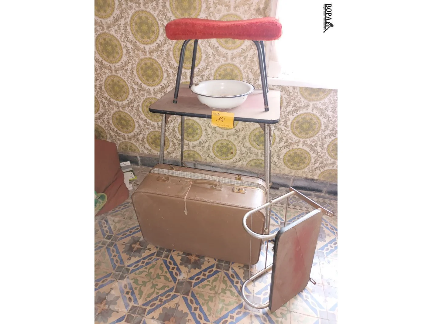1 bijzettafel, 1 oude reiskoffer, 1 wandrekje, 1 emaille schaal en 1 voetenbankje.