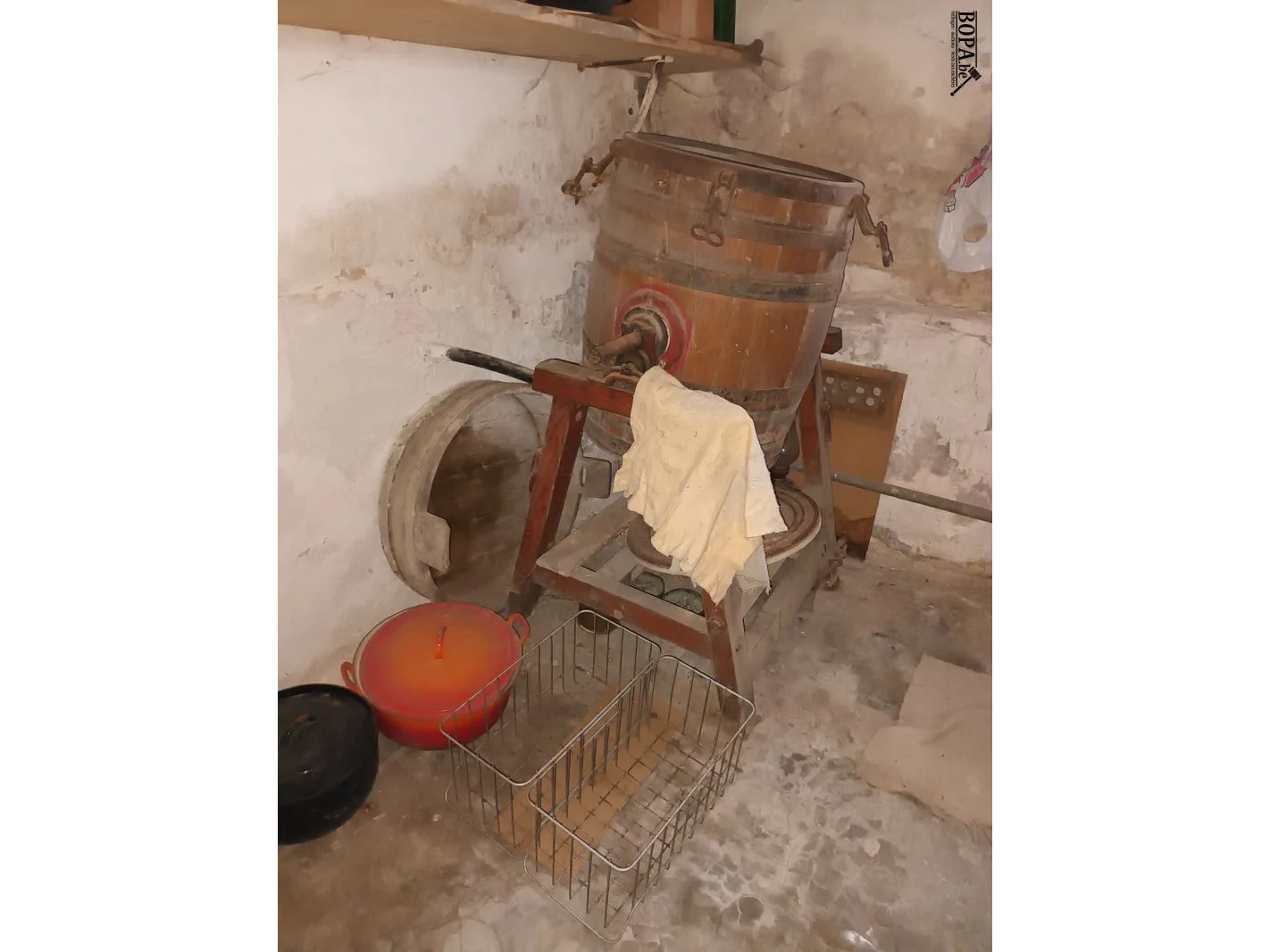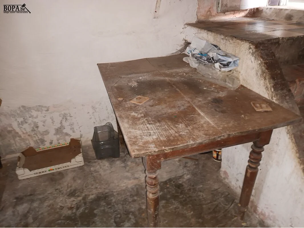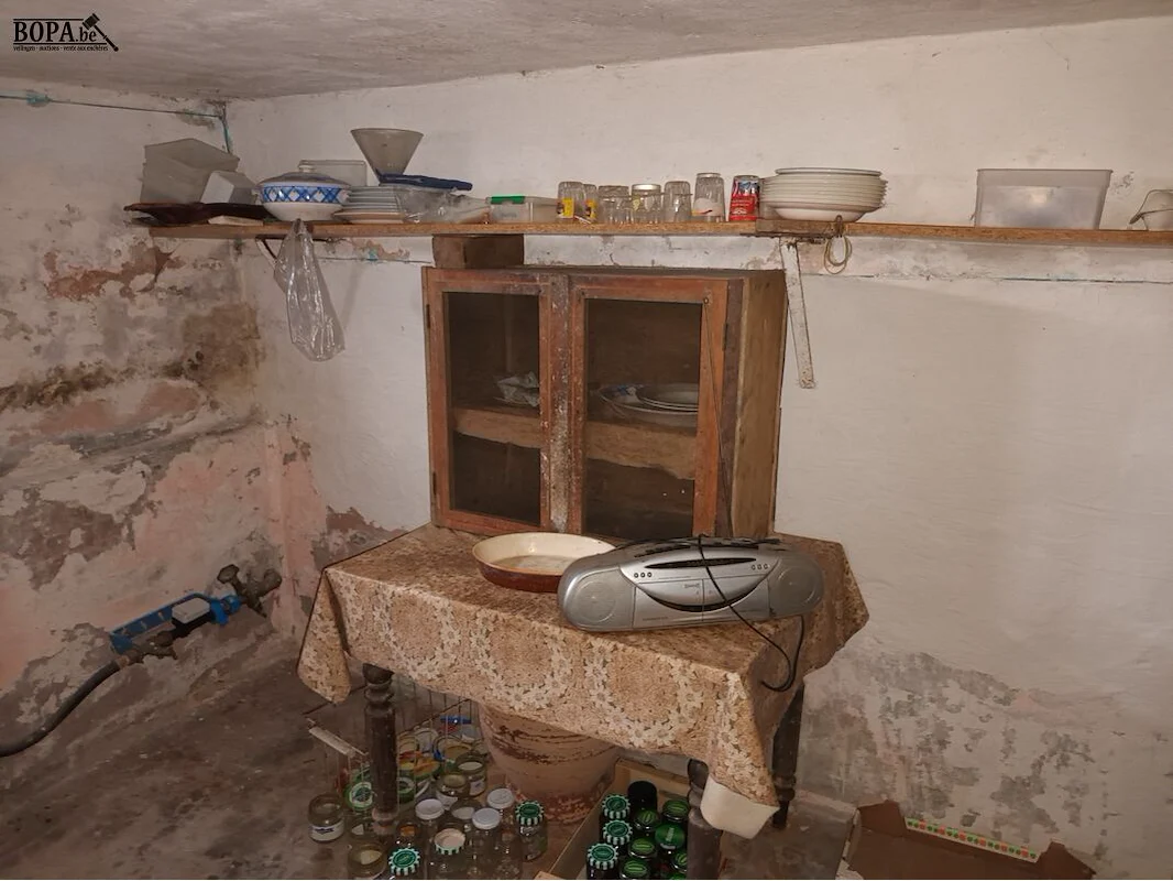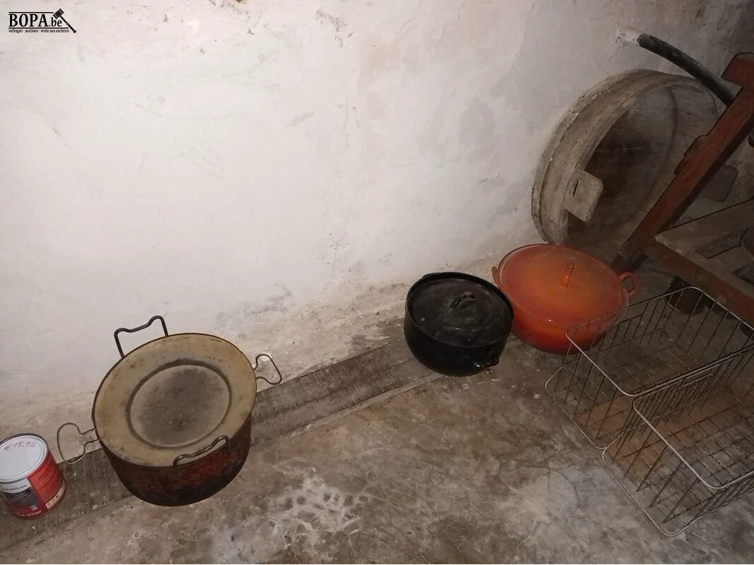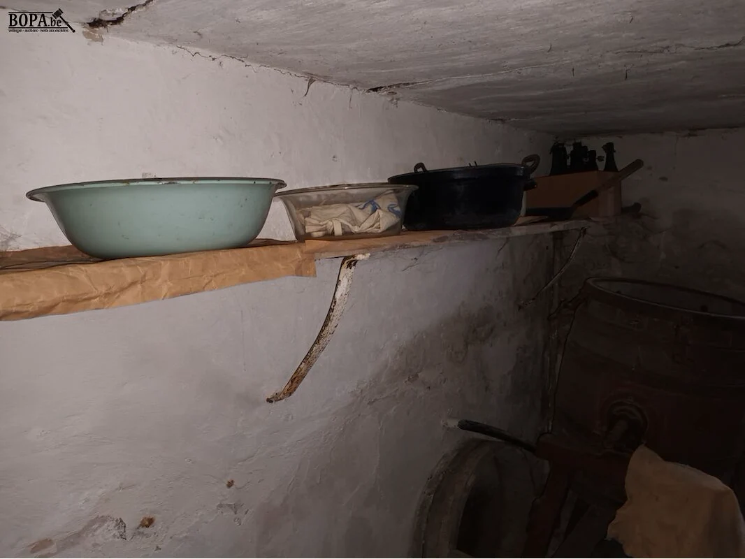 Diversen. Inhoud kelder waaronder huisraad, 2 tafels, een boterkarn, een droogkastje, radio en bloempot.