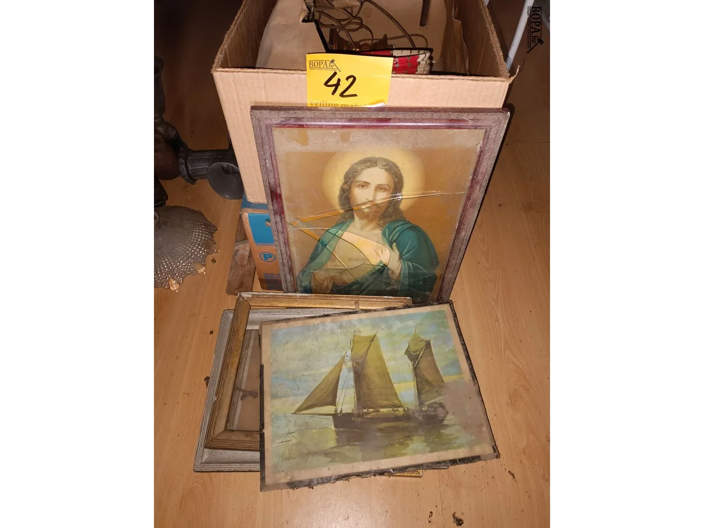 Lot brocante zoals kaders, lampenkappen, vleesmolen, brievenbakje, kapstok, etc.