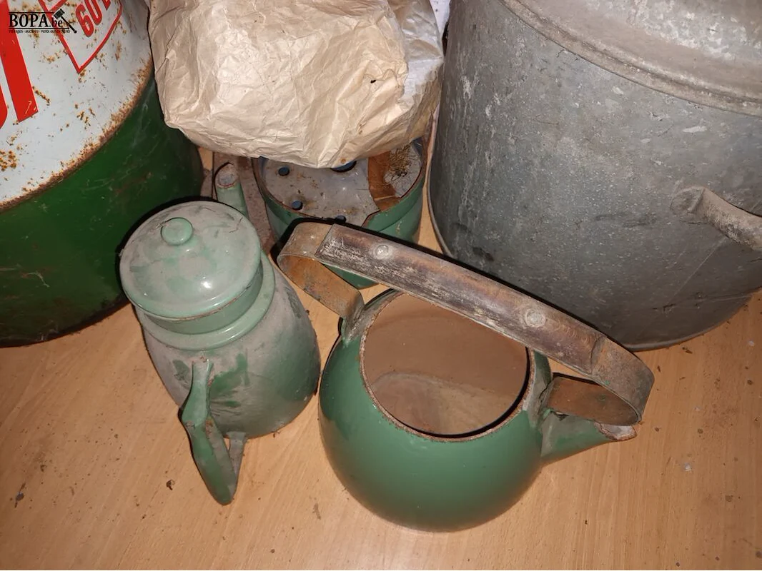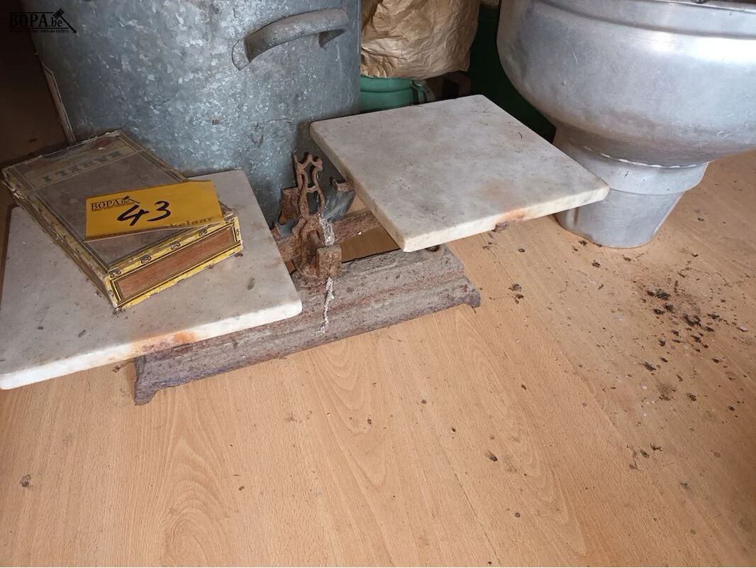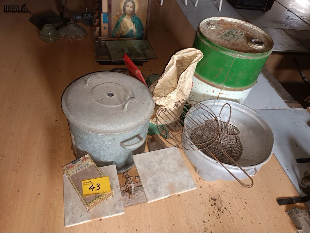 Lot brocante zoals zinken ton, antieke weegschaal, eiermandje, olieton, hoed, emaille potten, etc.