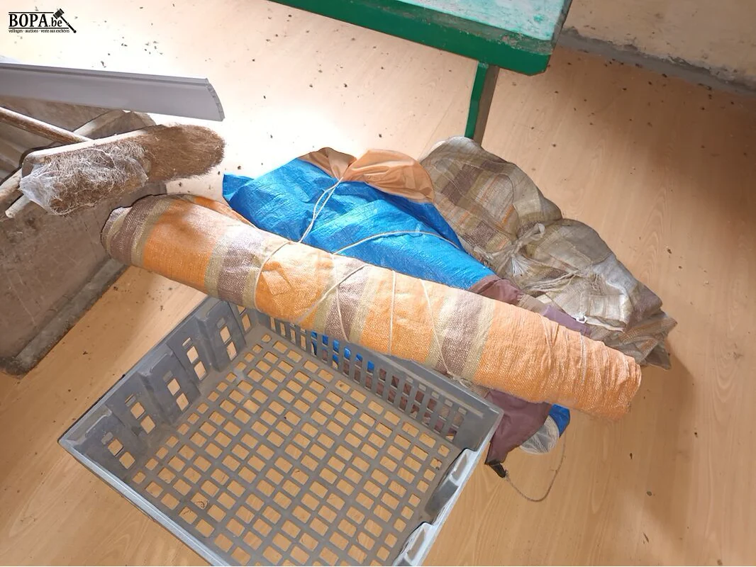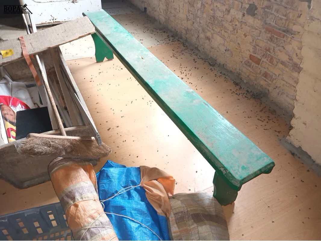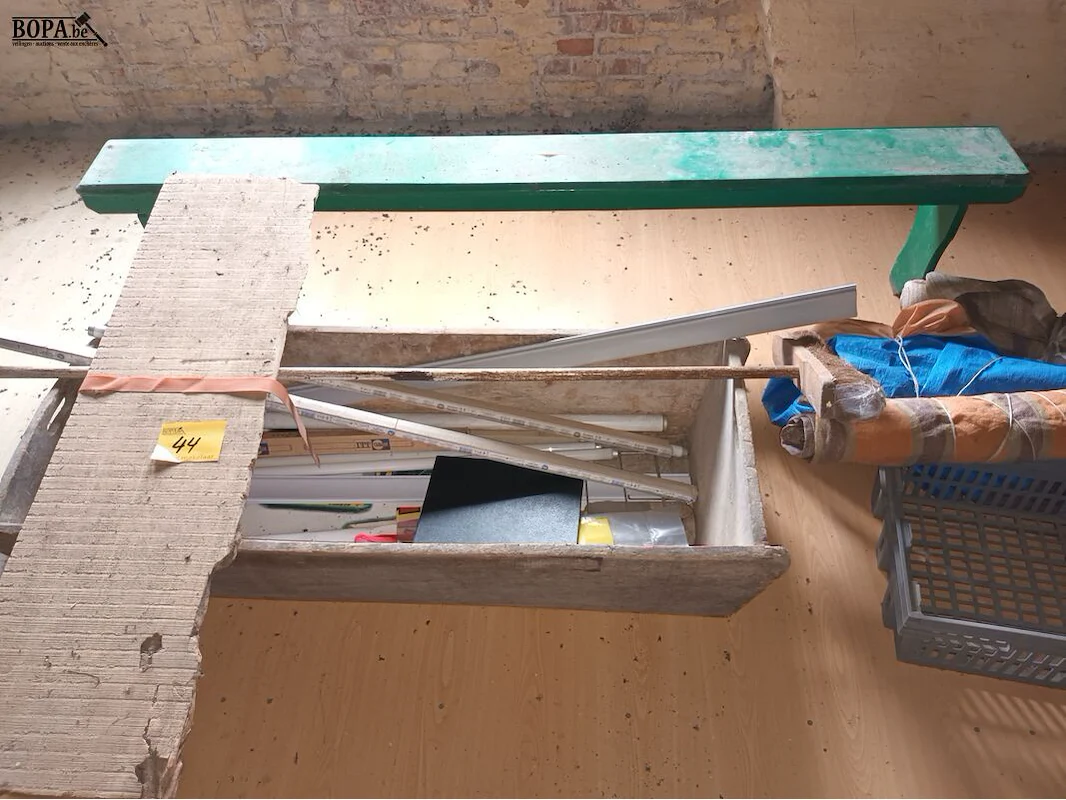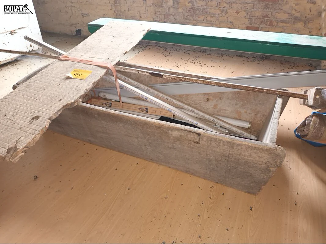 Lot brocante zoals een houten bankje, een houten trog, een plank, zeilen.