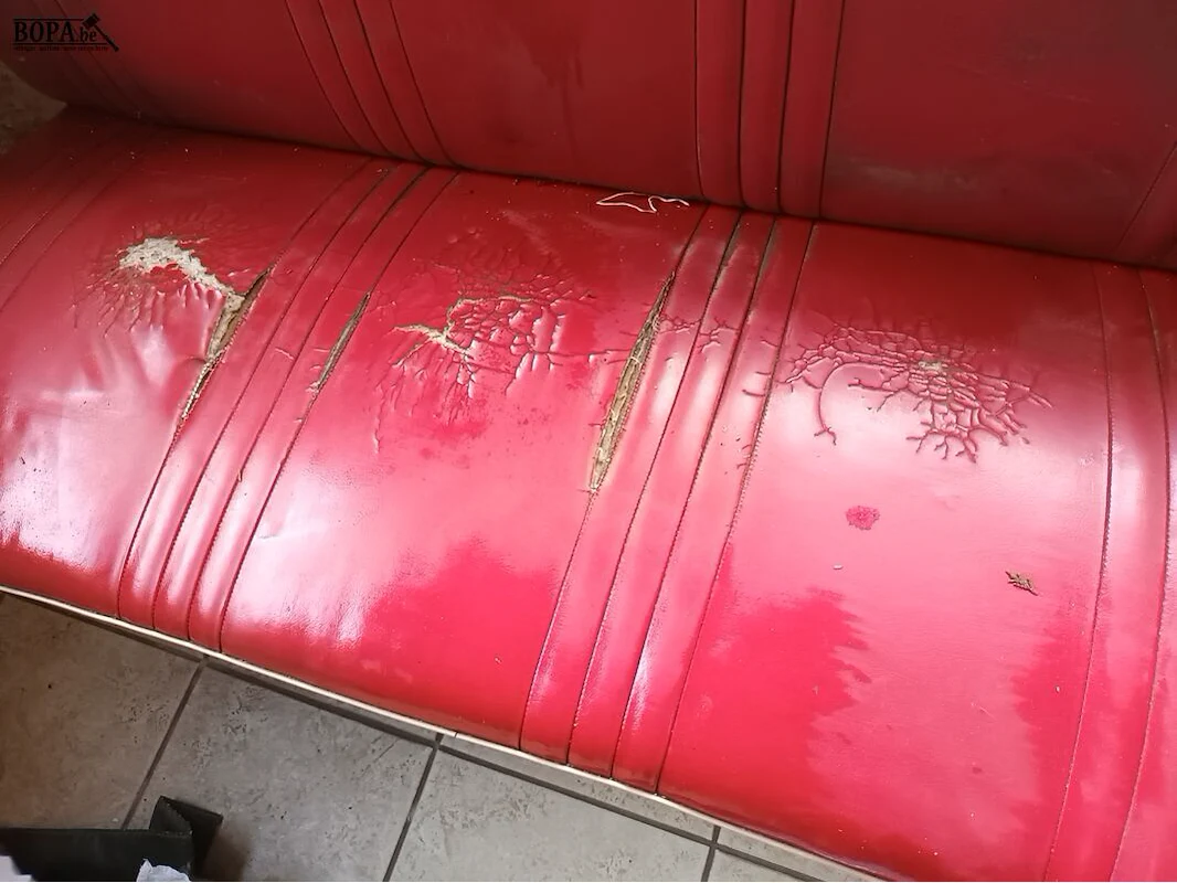 Retro zitbank met zichtbare schade op de zitting. 118 x 58 x 80 cm.