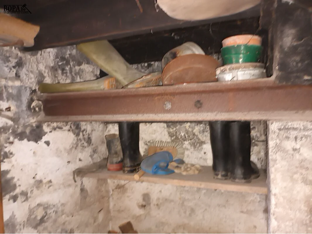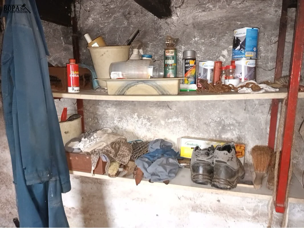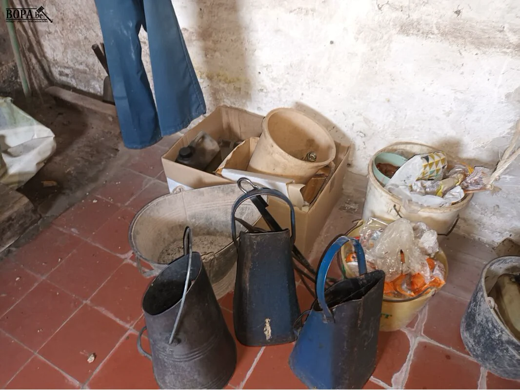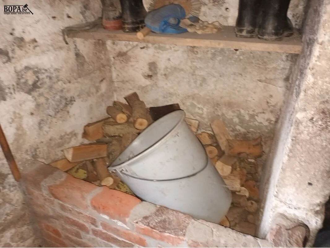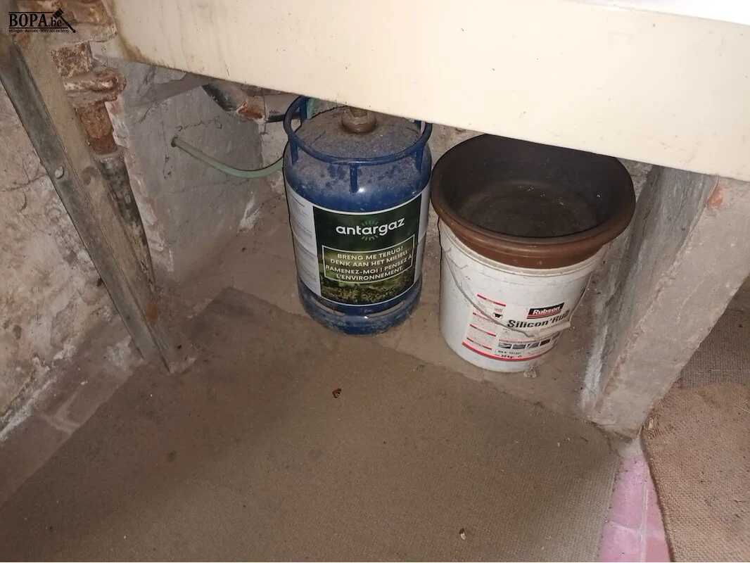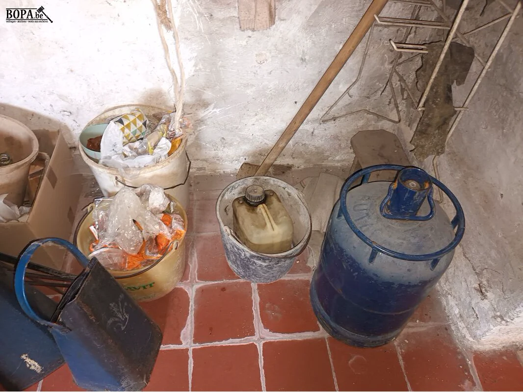 Diversen. Inhoud berging. Gasflessen, kolen, hout, kolenkitten, etc.